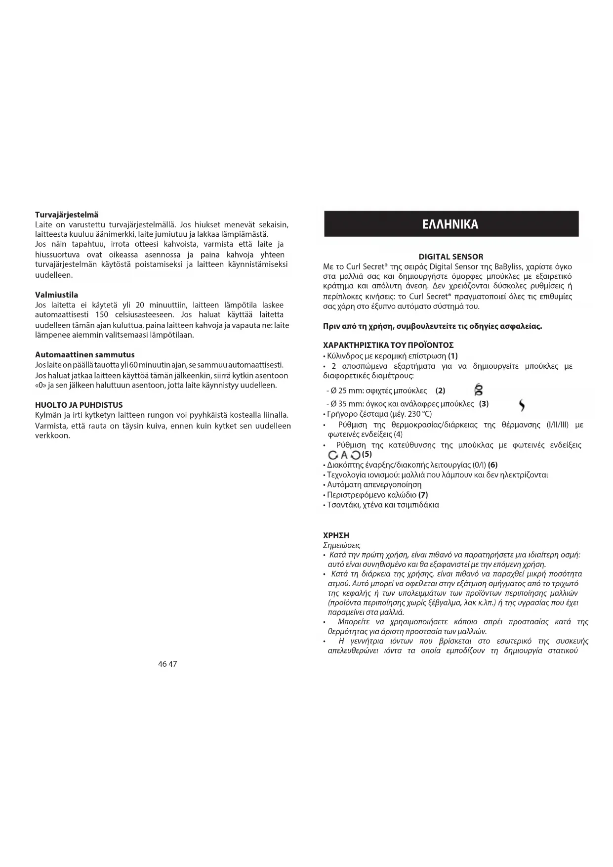 - Μετά τη χρήση, απενεργοποιήστε τη συσκευή και αποσυνδέστε την από την πρίζα. Αφήστε την να κρυώσει πριν την αποθηκεύσετε. Σύστημα προστασίας Η συσκευή διαθέτει ένα σύστημα προστασίας. Εάν μπλεχτούν τα μαλλιά, η συσκευή εκπέμπει ένα ηχητικό σήμα, μπλοκάρει και σταματά να θερμαίνεται. Εάν συμβεί αυτό, απελευθερώστε τις λαβές, βεβαιωθείτε ότι η συσκευή και η τούφα είναι σωστά τοποθετημένες και κατόπιν σφίξτε ξανά τις λαβές, για να απενεργοποιήσετε το σύστημα ασφαλείας και να επανεκκινήσετε τη συσκευή. Λειτουργία αναμονής Εάν η συσκευή δεν χρησιμοποιηθεί για περισσότερο από 20 λεπτά, η θερμοκρασία της θα μειωθεί αυτόματα στους 150°C. Εάν θελήσετε να χρησιμοποιήσετε ξανά τη συσκευή μετά από αυτό το χρονικό διάστημα, πιέστε απλώς τις λαβές της συσκευής και κατόπιν αφήστε τις. Έτσι, η συσκευή θα επανέλθει στη θερμοκρασία που είχατε επιλέξει. Αυτόματη απενεργοποίηση Εάν η συσκευή παραμείνει ενεργοποιημένη για περισσότερο από 60 λεπτά συνεχόμενα, τότε θα απενεργοποιηθεί αυτόματα. Εάν θελήσετε να συνεχίσετε να χρησιμοποιείτε τη συσκευή μετά από αυτό το διάστημα, σύρετε το διακόπτη στη θέση «0» και, στη συνέχεια, στην επιθυμητή θέση για να ενεργοποιήσετε ξανά τη συσκευή. ΣΥΝΤΗΡΗΣΗ ΚΑΙ ΚΑΘΑΡΙΣΜΟΣ Μπορείτε να καθαρίσετε το σώμα της συσκευής με ένα υγρό πανί, αφού κρυώσει και εφόσον την έχετε αποσυνδέσει από την πρίζα. Βεβαιωθείτε ότι έχει στεγνώσει εντελώς πριν τη χρησιμοποιήσετε ξανά. 17_C1500E_IB.indd 50-51 8/29/17 8:44 AM52 53 MAGYAR DIGITAL SENSOR A BaByliss Digital Sensor termékcsaládhoz tartozó Curl Secret® készülék használatával tegye dúsabbá haját, és készítsen kivételes tartású gyönyörű hajfürtöket a lehető legkényelmesebb módon. Nincs szükség unalmas beállításokra, sem bonyolult mozdulatokra, a Curl Secret® egy találékony automatikus rendszer segítségével minden hajformázási elképzelését megvalósítja. Használat előtt olvassa el a biztonsági előírásokat.