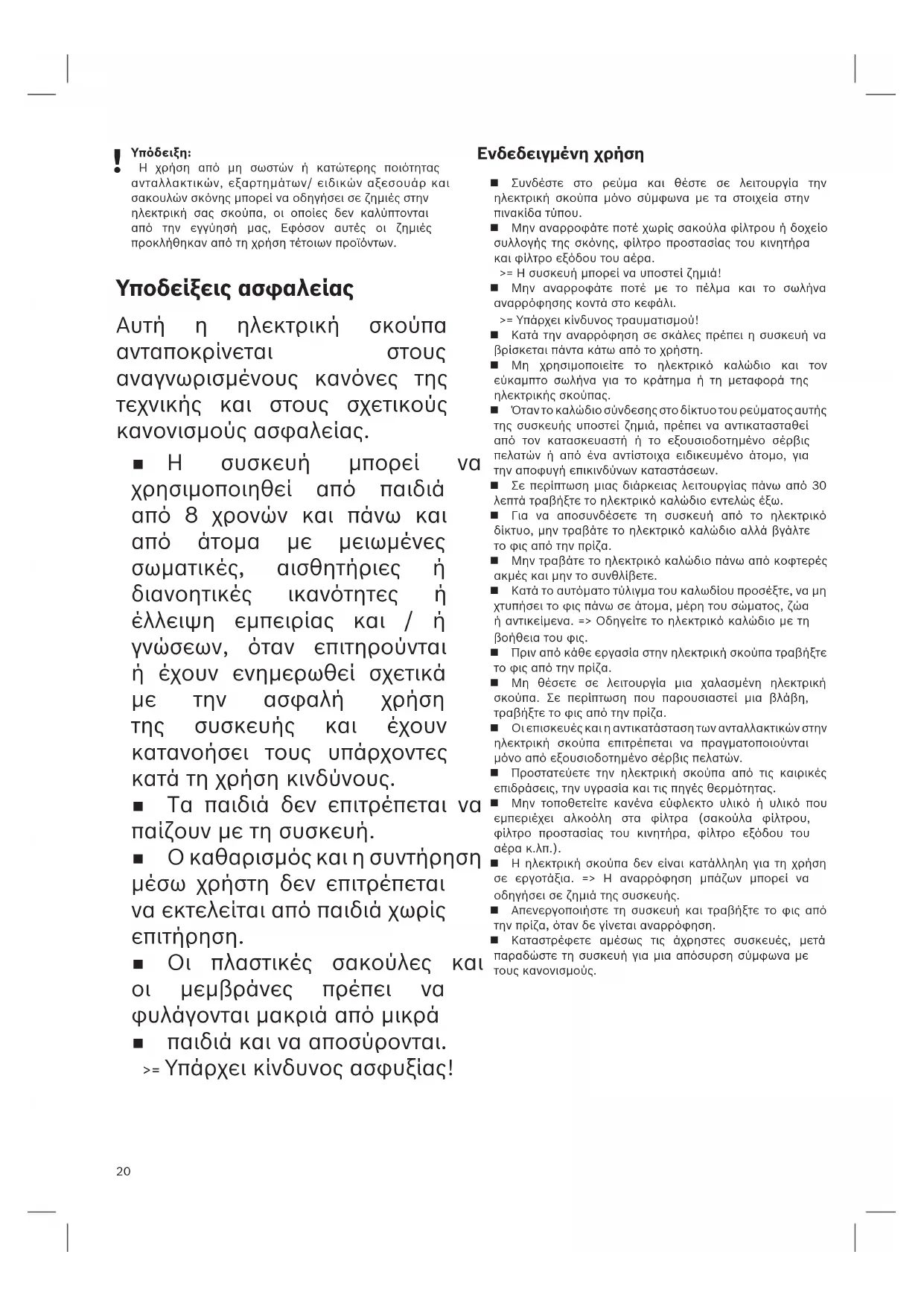 Η χρήση από μη σωστών ή κατώτερης ποιότητας ανταλλακτικών, εξαρτημάτων/ ειδικών αξεσουάρ και σακουλών σκόνης μπορεί να οδηγήσει σε ζημιές στην ηλεκτρική σας σκούπα, οι οποίες δεν καλύπτονται από την εγγύησή μας, Εφόσον αυτές οι ζημιές προκλήθηκαν από τη χρήση τέτοιων προϊόντων. Υποδείξεις ασφαλείας Αυτή η ηλεκτρική σκούπα ανταποκρίνεται στους αναγνωρισµένους κανόνες της τεχνικής και στους σχετικούς κανονισµούς ασφαλείας. Η συσκευή µπορεί να χρησιµοποιηθεί από παιδιά από 8 χρονών και πάνω και από άτοµα µε µειωµένες σωµατικές, αισθητήριες ή διανοητικές ικανότητες ή έλλειψη εµπειρίας και / ή γνώσεων, όταν επιτηρούνται ή έχουν ενηµερωθεί σχετικά µε την ασφαλή χρήση της συσκευής και έχουν κατανοήσει τους υπάρχοντες κατά τη χρήση κινδύνους. Τα παιδιά δεν επιτρέπεται να παίζουν µε τη συσκευή. Ο καθαρισµός και η συντήρηση µέσω χρήστη δεν επιτρέπεται να εκτελείται από παιδιά χωρίς