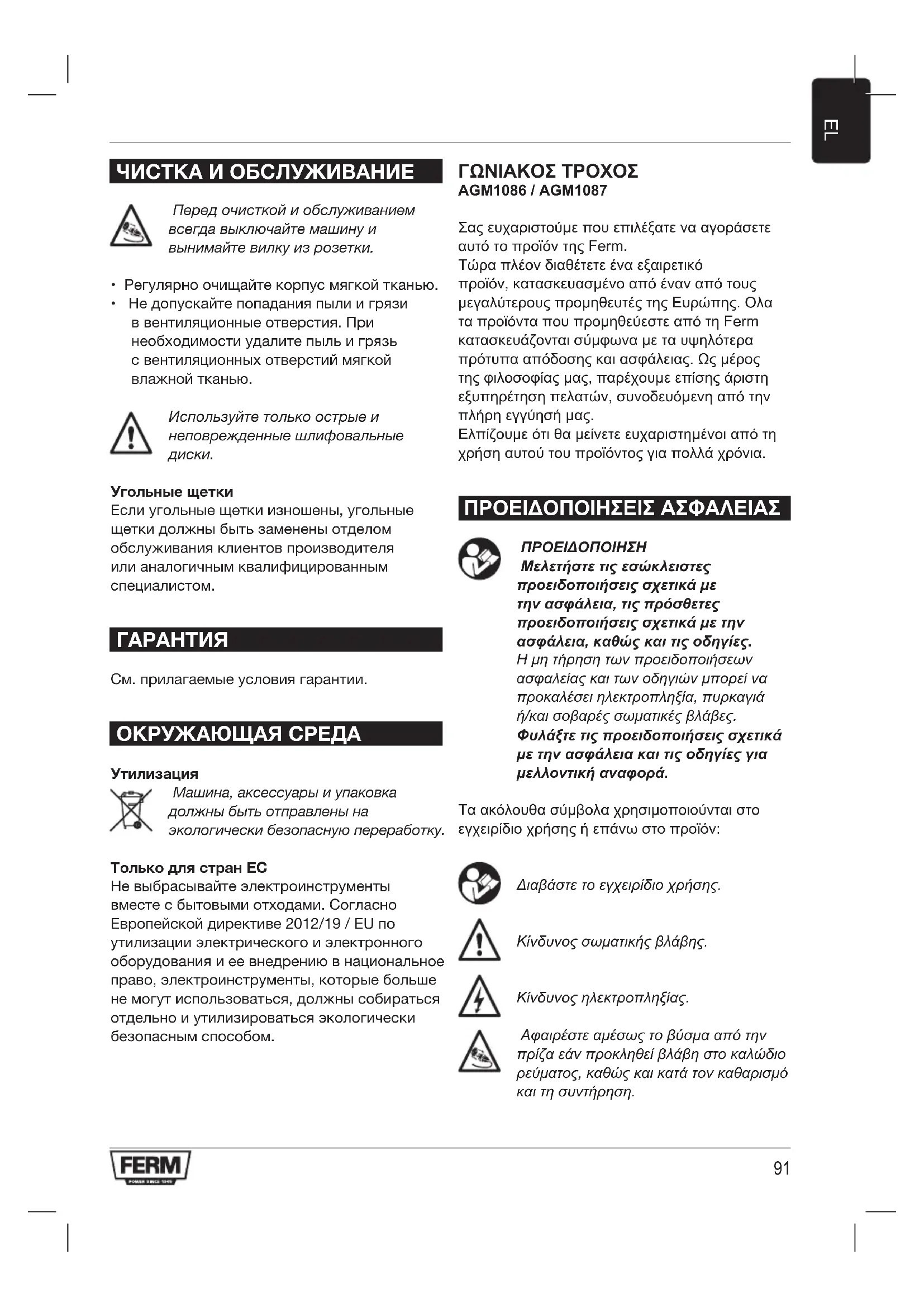 Машина, аксессуары и упаковка должны быть отправлены на экологически безопасную переработку. Только для стран ЕС Не выбрасывайте электроинструменты вместе с бытовыми отходами. Согласно Европейской директиве 2012/19 / EU по утилизации электрического и электронного оборудования и ее внедрению в национальное право, электроинструменты, которые больше не могут использоваться, должны собираться отдельно и утилизироваться экологически безопасным способом. ΓΩΝΙΑΚΟΣ ΤΡΟΧΟΣ AGM1086 / AGM1087 Σας ευχαριστούμε που επιλέξατε να αγοράσετε αυτό το προϊόν της Ferm. Τώρα πλέον διαθέτετε ένα εξαιρετικό προϊόν, κατασκευασμένο από έναν από τους μεγαλύτερους προμηθευτές της Ευρώπης. Ολα τα προϊόντα που προμηθεύεστε από τη Ferm κατασκευάζονται σύμφωνα με τα υψηλότερα πρότυπα απόδοσης και ασφάλειας. Ως μέρος της φιλοσοφίας μας, παρέχουμε επίσης άριστη εξυπηρέτηση πελατών, συνοδευόμενη από την πλήρη εγγύησή μας. Ελπίζουμε ότι θα μείνετε ευχαριστημένοι από τη χρήση αυτού του προϊόντος για πολλά χρόνια. ΠΡΟΕΙΔΟΠΟΙΉΣΕΙΣ ΑΣΦΑΛΕΙΑΣ ΠΡΟΕΙΔΟΠΟΙΗΣΗ Μελετήστε τις εσώκλειστες προειδοποιήσεις σχετικά με την ασφάλεια, τις πρόσθετες προειδοποιήσεις σχετικά με την ασφάλεια, καθώς και τις οδηγίες. Ημητήρησητωνπροειδοποιήσεων ασφαλείαςκαιτωνοδηγιώνμπορείνα προκαλέσειηλεκτροπληξία,πυρκαγιά ή/καισοβαρέςσωματικέςβλάβες. Φυλάξτε τις προειδοποιήσεις σχετικά με την ασφάλεια και τις οδηγίες για μελλοντική αναφορά. Τα ακόλουθα σύμβολα χρησιμοποιούνται στο εγχειρίδιο χρήσης ή επάνω στο προϊόν: Διαβάστετοεγχειρίδιοχρήσης. Κίνδυνοςσωματικήςβλάβης. Κίνδυνοςηλεκτροπληξίας. Αφαιρέστεαμέσωςτοβύσμααπότην πρίζαεάνπροκληθείβλάβηστοκαλώδιο ρεύματος,καθώςκαικατάτονκαθαρισμό καιτησυντήρηση.92