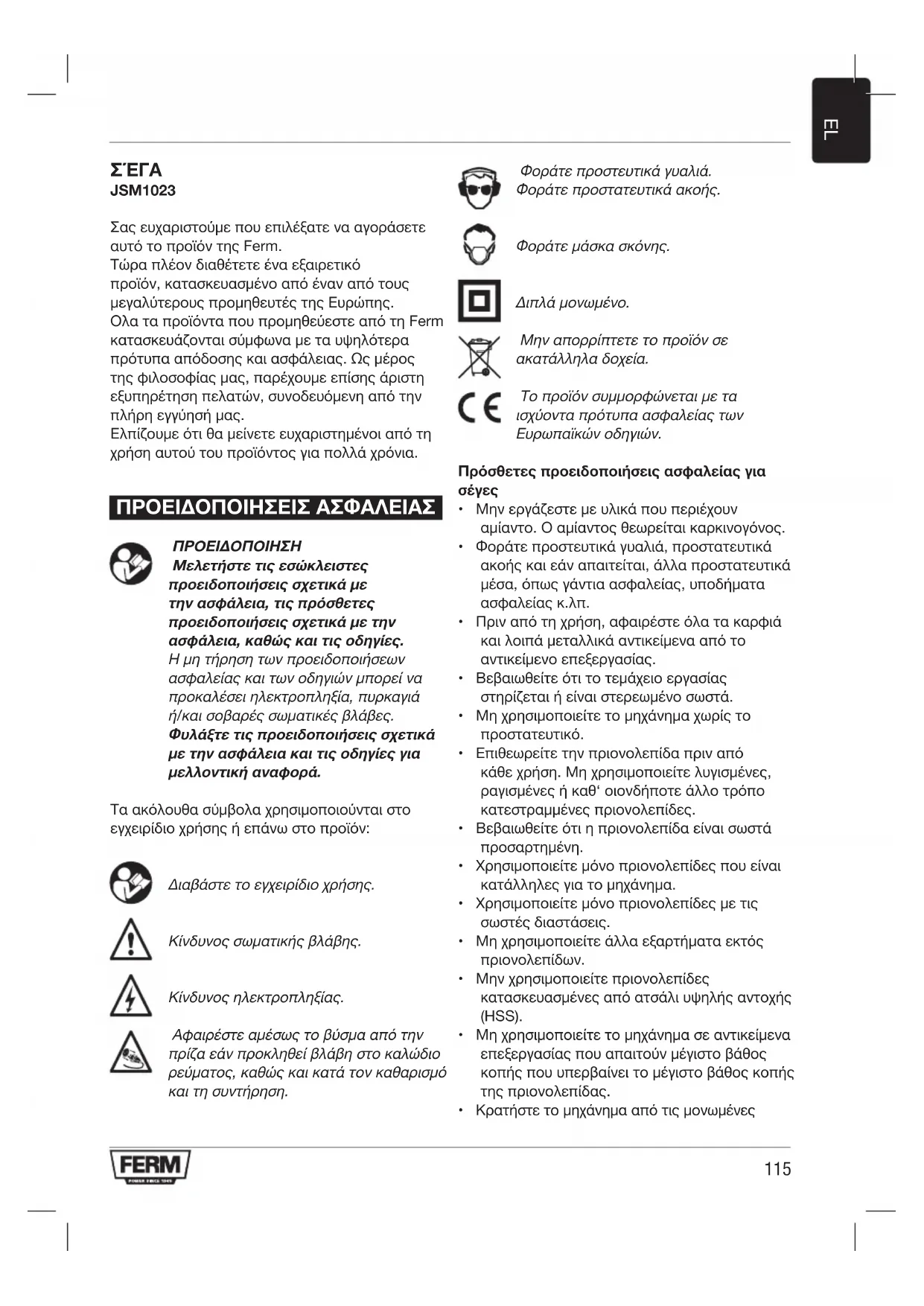 JSM1023 Σας ευχαριστούμε που επιλέξατε να αγοράσετε αυτό το προϊόν της Ferm. Τώρα πλέον διαθέτετε ένα εξαιρετικό προϊόν, κατασκευασμένο από έναν από τους μεγαλύτερους προμηθευτές της Ευρώπης. Ολα τα προϊόντα που προμηθεύεστε από τη Ferm κατασκευάζονται σύμφωνα με τα υψηλότερα πρότυπα απόδοσης και ασφάλειας. Ως μέρος της φιλοσοφίας μας, παρέχουμε επίσης άριστη εξυπηρέτηση πελατών, συνοδευόμενη από την πλήρη εγγύησή μας. Ελπίζουμε ότι θα μείνετε ευχαριστημένοι από τη χρήση αυτού του προϊόντος για πολλά χρόνια. ΠΡΟΕΙΔΟΠΟΙΉΣΕΙΣ ΑΣΦΑΛΕΙΑΣ ΠΡΟΕΙΔΟΠΟΙΗΣΗ Μελετήστετιςεσώκλειστες προειδοποιήσειςσχετικάμε τηνασφάλεια,τιςπρόσθετες προειδοποιήσειςσχετικάμετην ασφάλεια,καθώςκαιτιςοδηγίες. Η μη τήρηση των προειδοποιήσεων ασφαλείας και των οδηγιών μπορεί να προκαλέσει ηλεκτροπληξία, πυρκαγιά ή/και σοβαρές σωματικές βλάβες. Φυλάξτετιςπροειδοποιήσειςσχετικά μετηνασφάλειακαιτιςοδηγίεςγια μελλοντικήαναφορά. Τα ακόλουθα σύμβολα χρησιμοποιούνται στο εγχειρίδιο χρήσης ή επάνω στο προϊόν: Διαβάστε το εγχειρίδιο χρήσης. Κίνδυνος σωματικής βλάβης. Κίνδυνος ηλεκτροπληξίας. Αφαιρέστε αμέσως το βύσμα από την πρίζα εάν προκληθεί βλάβη στο καλώδιο ρεύματος, καθώς και κατά τον καθαρισμό και τη συντήρηση. Φοράτε προστευτικά γυαλιά. Φοράτε προστατευτικά ακοής. Φοράτε μάσκα σκόνης. Διπλά μονωμένο. Μην απορρίπτετε το προϊόν σε ακατάλληλα δοχεία. Το προϊόν συμμορφώνεται με τα ισχύοντα πρότυπα ασφαλείας των Ευρωπαϊκών οδηγιών. Πρόσθετες προειδοποιήσεις ασφαλείας για