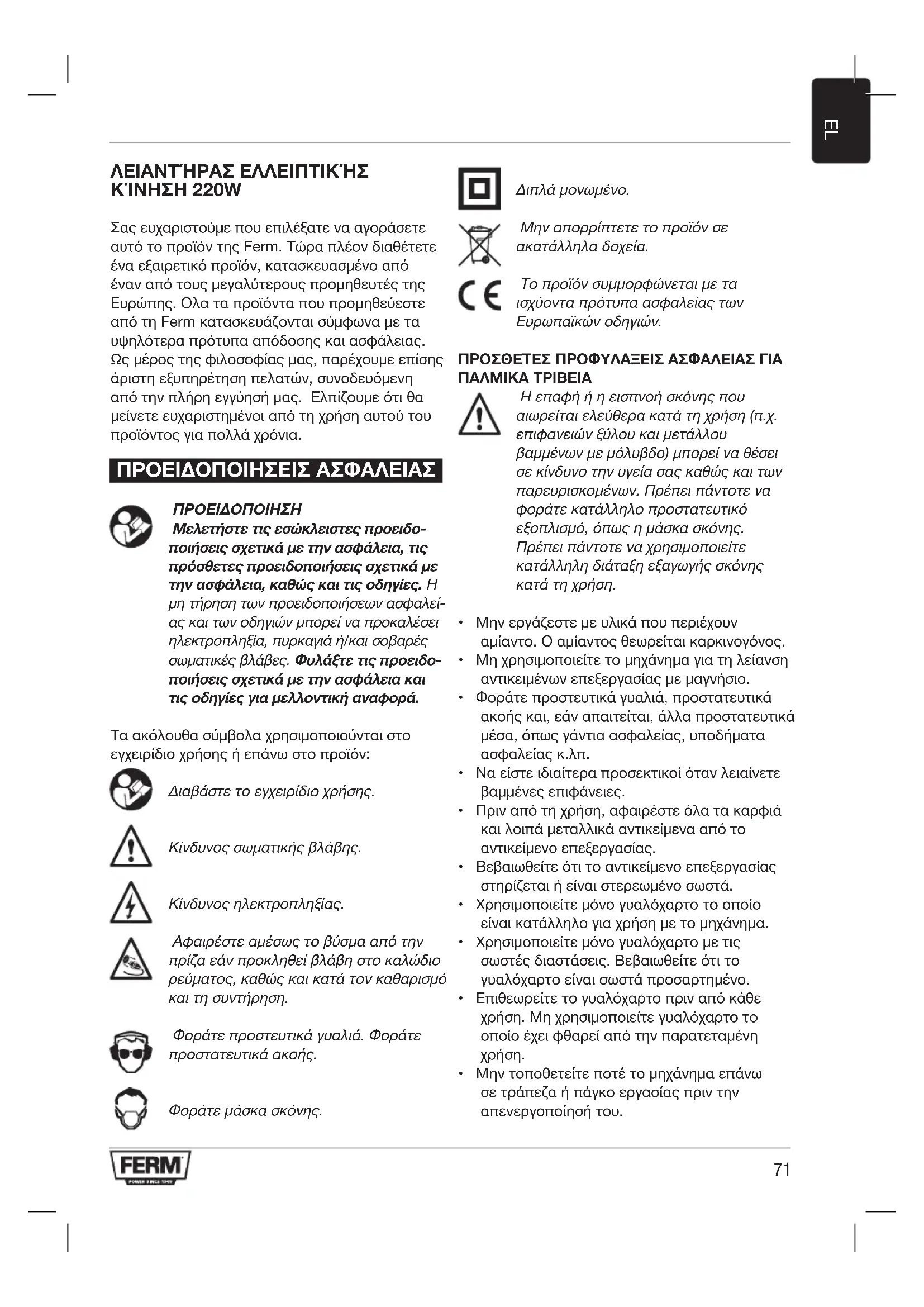 ΛΕΙΑΝΤΉΡΑΣ ΕΛΛΕΙΠΤΙΚΉΣ ΚΊΝΗΣΗ 220W Σας ευχαριστούμε που επιλέξατε να αγοράσετε αυτό το προϊόν της Ferm. Τώρα πλέον διαθέτετε ένα εξαιρετικό προϊόν, κατασκευασμένο από έναν από τους μεγαλύτερους προμηθευτές της Ευρώπης. Ολα τα προϊόντα που προμηθεύεστε από τη Ferm κατασκευάζονται σύμφωνα με τα υψηλότερα πρότυπα απόδοσης και ασφάλειας. Ως μέρος της φιλοσοφίας μας, παρέχουμε επίσης άριστη εξυπηρέτηση πελατών, συνοδευόμενη από την πλήρη εγγύησή μας. Ελπίζουμε ότι θα μείνετε ευχαριστημένοι από τη χρήση αυτού του προϊόντος για πολλά χρόνια. ΠΡΟΕΙΔΟΠΟΙΗΣΕΙΣ ΑΣΦΑΛΕΙΑΣ ΠΡΟΕΙΔΟΠΟΙΗΣΗ Μελετήστετιςεσώκλειστεςπροειδο- ποιήσειςσχετικάμετηνασφάλεια,τις πρόσθετεςπροειδοποιήσειςσχετικάμε τηνασφάλεια,καθώςκαιτιςοδηγίες. Η μη τήρηση των προειδοποιήσεων ασφαλεί- ας και των οδηγιών μπορεί να προκαλέσει ηλεκτροπληξία, πυρκαγιά ή/και σοβαρές σωματικές βλάβες. Φυλάξτετιςπροειδο- ποιήσειςσχετικάμετηνασφάλειακαι τιςοδηγίεςγιαμελλοντικήαναφορά. Τα ακόλουθα σύμβολα χρησιμοποιούνται στο εγχειρίδιο χρήσης ή επάνω στο προϊόν: Διαβάστε το εγχειρίδιο χρήσης. Κίνδυνος σωματικής βλάβης. Κίνδυνος ηλεκτροπληξίας. Αφαιρέστε αμέσως το βύσμα από την πρίζα εάν προκληθεί βλάβη στο καλώδιο ρεύματος, καθώς και κατά τον καθαρισμό και τη συντήρηση. Φοράτε προστευτικά γυαλιά. Φοράτε προστατευτικά ακοής. Φοράτε μάσκα σκόνης. Διπλά μονωμένο. Μην απορρίπτετε το προϊόν σε ακατάλληλα δοχεία. Το προϊόν συμμορφώνεται με τα ισχύοντα πρότυπα ασφαλείας των Ευρωπαϊκών οδηγιών. ΠΡΟΣΘΕΤΕΣ ΠΡΟΦΥΛΑΞΕΙΣ ΑΣΦΑΛΕΙΑΣ ΓΙΑ ΠΑΛΜΙΚΑ ΤΡΙΒΕΙΑ Η επαφή ή η εισπνοή σκόνης που αιωρείται ελεύθερα κατά τη χρήση (π.χ. επιφανειών ξύλου και μετάλλου βαμμένων με μόλυβδο) μπορεί να θέσει σε κίνδυνο την υγεία σας καθώς και των παρευρισκομένων. Πρέπει πάντοτε να φοράτε κατάλληλο προστατευτικό εξοπλισμό, όπως η μάσκα σκόνης. Πρέπει πάντοτε να χρησιμοποιείτε κατάλληλη διάταξη εξαγωγής σκόνης κατά τη χρήση.