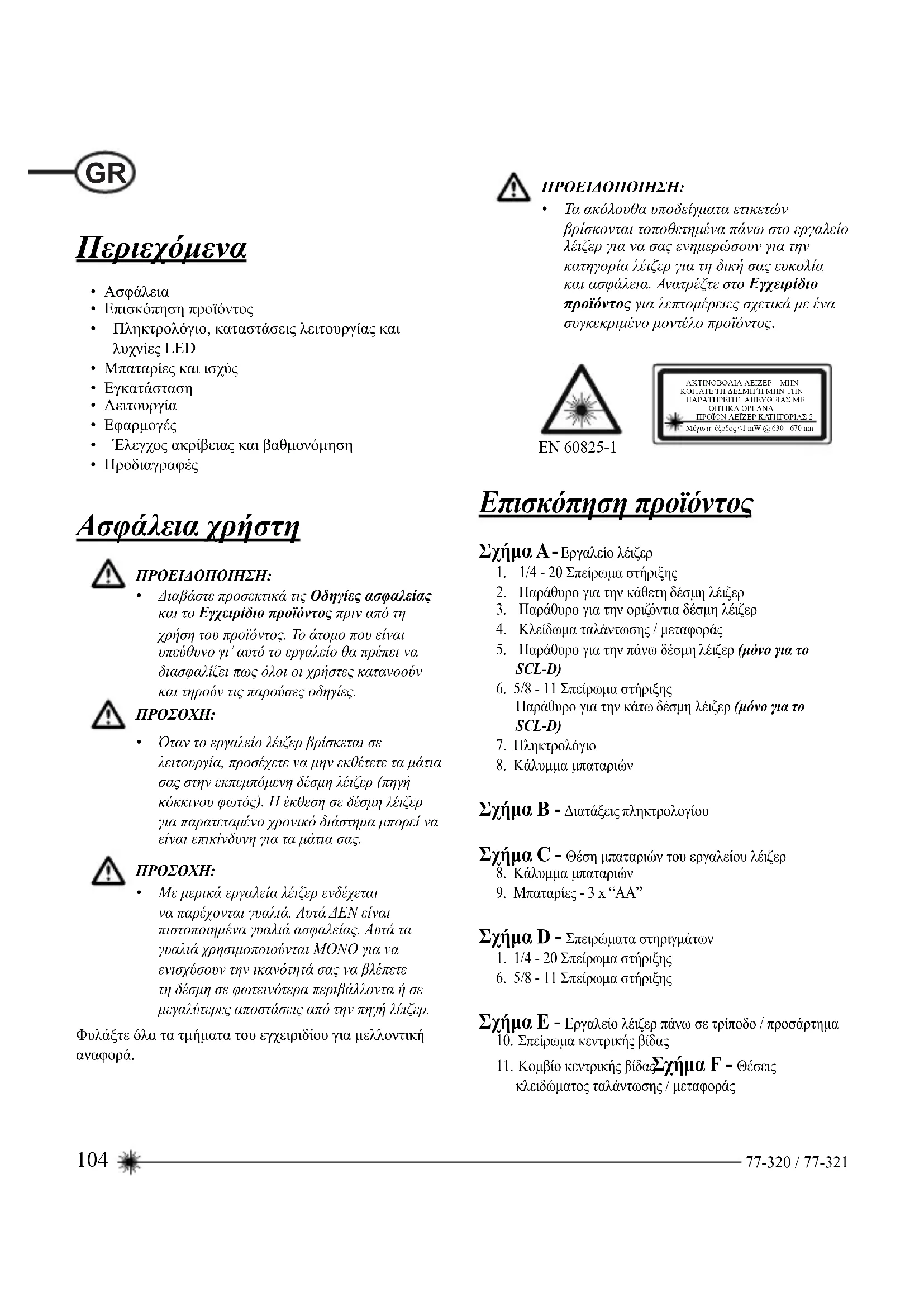 - 1,5 χλστ. ≤ 2,0 χλστ. (ΑΛΗΘΕΣ, το εργαλείο είναι βαθμονομημένο)110 77-320 / 77-321 Προδιαγραφές Εργαλείο λέιζερ SCL SCL-D Ακρίβεια αλφαδιάσματος: ≤ 3 χλστ. / 15 μ. Οριζόντια / Κάθετη ακρίβεια ≤ 3 χλστ. / 15 μ. Ακρίβεια άνω δέσμης: ≤ 3 χλστ. / 15 μ. Ακρίβεια κάτω δέσμης: ≤ 6 χλστ. / 15 μ. Εύρος επανόρθωσης: Αυτο-οριζοντίωση έως ±4° Απόσταση λειτουργίας: Γραμμή: ≥ 10 μ. ≥ 15 μ. με ανιχνευτή λέιζερ: ≥ 25 μ. ≥ 50 μ. Σημείο: ≥ 30 μ. Κατηγορία λέιζερ: Κατηγορία 2 (EN60825-1) Μήκος κύματος λέιζερ 635 nm ± 5 nm Διάρκεια λειτουργίας: ≥ 18 ώρες (Αλκαλικές) ≥ 10 ώρες (Αλκαλικές) Πηγή τροφοδοσίας: 3 x μπαταρίες “AA” Ταξινόμηση ΙΡ: IP54 Εύρος θερμοκρασίας λειτουργίας: -10° C έως +50° C Εύρος θερμοκρασίας αποθήκευσης: -25° C έως +70° C111 77-320 / 77-321 Σημειώσεις112 77-320 / 77-321 EN 60825-1