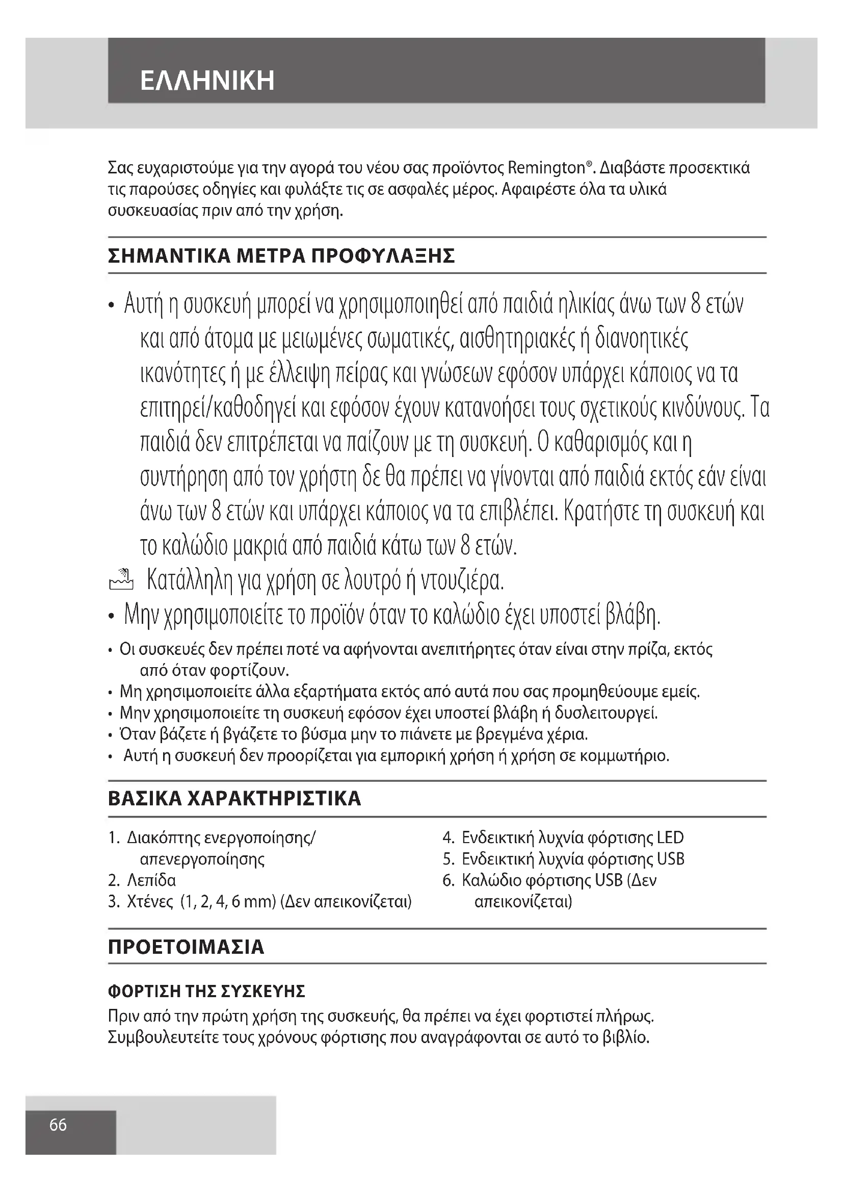 AE66 Σας ευχαριστούμε για την αγορά του νέου σας προϊόντος Remington®. Διαβάστε προσεκτικά τις παρούσες οδηγίες και φυλάξτε τις σε ασφαλές μέρος. Αφαιρέστε όλα τα υλικά συσκευασίας πριν από την χρήση. ΣΗΜΑΝΤΙΚΑ ΜΕΤΡΑ ΠΡΟΦΥΛΑΞΗΣ