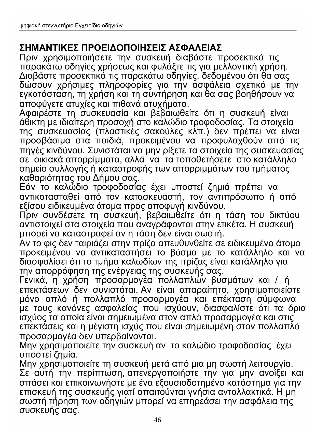 Ο κατασκευαστής δεν μπορεί να θεωρηθεί υπεύθυνος για τυχόν ζημιές που οφείλονται σε ακατάλληλη, λανθασμένη ή απερίσκεπτη χρήση. Η συσκευή αυτή προορίζεται ΜΟΝΟ ΓΙΑ ΟΙΚΙΑΚΗ ΧΡΗΣΗ.
