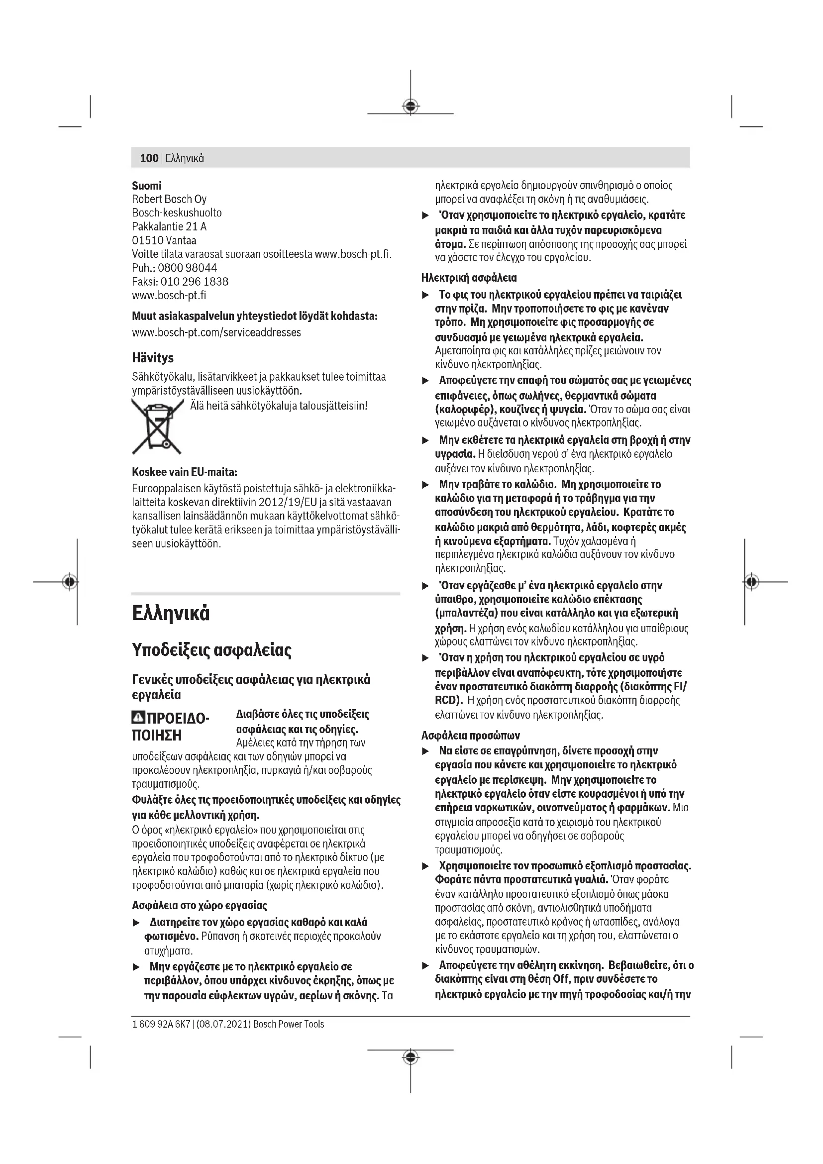u Μη χρησιμοποιείτε υπερβολικά μεγάλο μέγεθος δίσκων γυαλόχαρτου. Ακολουθείτε τις συστάσεις του κατασκευαστή, όταν επιλέγετε γυαλόχαρτο. Ένα μεγάλο γυαλόχαρτο που προεξέχει πέρα από το δίσκο στήριξης κινδυνεύει να σχιστεί και μπορεί να προκαλέσει σκάλωμα, σχίσιμο του δίσκου ή ανάκρουση. Προειδοποιήσεις ασφάλειας ειδικά για εργασίες με χρήση συρματόβουρτσας u Έχετε υπόψη σας, ότι οι συρμάτινες τρίχες εκτινάσσονται από τη βούρτσα ακόμη και κατά τη διάρκεια κανονικής λειτουργίας. Μην πιέζετε υπερβολικά τα σύρματα, εφαρμόζοντας υπερβολικό φορτίο στη βούρτσα Οι συρμάτινες τρίχες μπορούν εύκολα να διαπεράσουν ελαφρά ρούχα και/ή το δέρμα. u Εάν συνίσταται η χρήση ενός προφυλακτήρα για τη χρήση συρματόβουρτσας, δεν επιτρέπεται καμία παρεμπόδιση του συρμάτινου τροχού ή της βούρτσας από τον προφυλακτήρα. Η διάμετρος ενός συρμάτινου Bosch Power Tools 1 609 92A 6K7 | (08.07.2021)104 | Ελληνικά τροχού ή βούρτσας μπορεί να αυξηθεί από το φορτίο εργασίας και τις φυγόκεντρες δυνάμεις. Πρόσθετες υποδείξεις ασφάλειας Φοράτε προστατευτικά γυαλιά. u Χρησιμοποιείτε κατάλληλες συσκευές ανίχνευσης για να εντοπίσετε τυχόν μη ορατούς αγωγούς τροφοδοσίας ή συμβουλευτείτε την τοπική εταιρία παροχής ενέργειας. Ηεπαφή με ηλεκτρικές γραμμές μπορεί να οδηγήσει σε πυρκαγιά και ηλεκτροπληξία. Ηπρόκληση ζημιάς σ’ έναν αγωγό φωταερίου (γκαζιού) μπορεί να οδηγήσει σε έκρηξη. Το τρύπημα ενός σωλήνα νερού προκαλεί ζημιά σε πράγματα ή/και μπορεί να οδηγήσει σε ηλεκτροπληξία. u Μην πιάσετε τους δίσκους λείανσης και κοπής, προτού να κρυώσουν. Οι δίσκοι κατά την εργασία θερμαίνονται