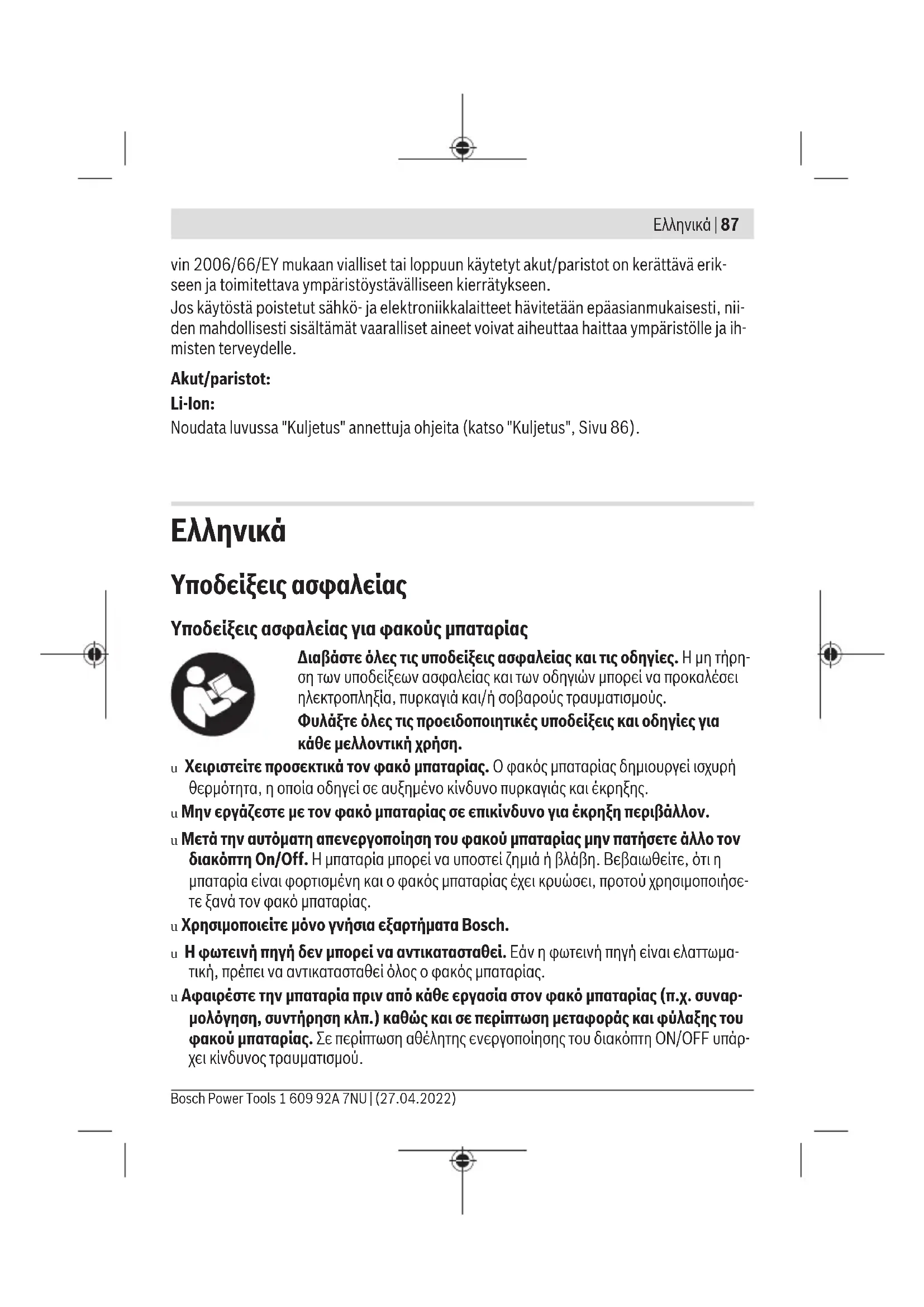 Υποδείξεις ασφαλείας Υποδείξεις ασφαλείας για φακούς μπαταρίας Διαβάστε όλες τις υποδείξεις ασφαλείας και τις οδηγίες. Η μη τήρη- ση των υποδείξεων ασφαλείας και των οδηγιών μπορεί να προκαλέσει ηλεκτροπληξία, πυρκαγιά και/ή σοβαρούς τραυματισμούς. Φυλάξτε όλες τις προειδοποιητικές υποδείξεις και οδηγίες για κάθε μελλοντική χρήση. u Χειριστείτε προσεκτικά τον φακό μπαταρίας. Ο φακός μπαταρίας δημιουργεί ισχυρή θερμότητα, η οποία οδηγεί σε αυξημένο κίνδυνο πυρκαγιάς και έκρηξης. u Μην εργάζεστε με τον φακό μπαταρίας σε επικίνδυνο για έκρηξη περιβάλλον.u Μετά την αυτόματη απενεργοποίηση του φακού μπαταρίας μην πατήσετε άλλο τον διακόπτη On/Off. Ημπαταρία μπορεί να υποστεί ζημιά ή βλάβη. Βεβαιωθείτε, ότι η μπαταρία είναι φορτισμένη και ο φακός μπαταρίας έχει κρυώσει, προτού χρησιμοποιήσε- τε ξανά τον φακό μπαταρίας. u Χρησιμοποιείτε μόνο γνήσια εξαρτήματα Bosch. u Η φωτεινή πηγή δεν μπορεί να αντικατασταθεί. Εάν η φωτεινή πηγή είναι ελαττωμα- τική, πρέπει να αντικατασταθεί όλος ο φακός μπαταρίας. u Αφαιρέστε την μπαταρία πριν από κάθε εργασία στον φακό μπαταρίας (π.χ. συναρ- μολόγηση, συντήρηση κλπ.) καθώς και σε περίπτωση μεταφοράς και φύλαξης του φακού μπαταρίας. Σε περίπτωση αθέλητης ενεργοποίησης του διακόπτη ON/OFF υπάρ- χει κίνδυνος τραυματισμού. Bosch Power Tools 1 609 92A 7NU | (27.04.2022)88 | Ελληνικά u Μην κατευθύνετε την ακτίνα επάνω σε πρόσωπα ή ζώα και μην κοιτάζετε οι ίδιοι κατευθείαν στην ακτίνα, ακόμη και από μεγάλη απόσταση. u Μη χρησιμοποιείτε τον φακό μπαταρίας στην οδική κυκλοφορία. Ο φακός μπαταρί- ας δεν είναι εγκεκριμένος για τον φωτισμό στην οδική κυκλοφορία. ΠΡΟΣΟΧΗ! Μην κοιτάτε τη φωτεινή ακτίνα για μεγάλο χρονικό διάστημα. Η οπτική ακτινοβολία μπορεί να βλάψει τα μάτια σας. u Μην καλύπτετε την κεφαλή του φωτιστικού, κατά τη διάρκεια που ο φακός μπατα- ρίας βρίσκεται σε λειτουργία. Η κεφαλή του φωτιστικού θερμαίνεται κατά τη λειτουρ- γία και μπορεί να προκαλέσει εγκαύματα, όταν η θερμότητα συσσωρεύεται. u Σε περίπτωση βλάβης ή/και αντικανονικής χρήσης της μπαταρίας μπορεί να εξέλ- θουν αναθυμιάσεις από την μπαταρία. Η μπαταρία μπορεί να αναφλεγεί ή να εκρα- γεί.Αφήστε να μπει φρέσκος αέρας και επισκεφτείτε έναν γιατρό σε περίπτωση που έχε- τε ενοχλήσεις. Οι αναθυμιάσεις μπορεί να ερεθίσουν τις αναπνευστικές οδούς. u Σε περίπτωση λάθους χρήσης ή χαλασμένης μπαταρίας μπορεί να διαρρεύσει εύ- φλεκτο υγρό από την μπαταρία. Αποφεύγετε κάθε επαφή μ’ αυτό. Σε περίπτωση τυχαίας επαφής ξεπλυθείτε με νερό. Σε περίπτωση που τα υγρά έρθουν σε επαφή με τα μάτια, πρέπει να ζητήσετε επίσης και ιατρική βοήθεια. Τα διαρρέοντα υγρά μπαταρίας μπορεί να οδηγήσουν σε ερεθισμούς του δέρματος ή σε εγκαύματα. u Από αιχμηρά αντικείμενα, όπως π.χ. καρφιά ή κατσαβίδια ή από εξωτερική άσκηση δύναμης μπορεί να υποστεί ζημιά η μπαταρία. Μπορεί να προκληθεί ένα εσωτερικό βραχυκύκλωμα με αποτέλεσμα την ανάφλεξη, την εμφάνιση καπνού, την έκρηξη ή την υπερθέρμανση της μπαταρίας. u Κρατάτε τις μπαταρίες που δε χρησιμοποιείτε μακριά από συνδετήρες χαρτιών, νο- μίσματα, κλειδιά, καρφιά, βίδες κι άλλα μικρά μεταλλικά αντικείμενα που μπορούν να βραχυκυκλώσουν τις επαφές της μπαταρίας. Ένα βραχυκύκλωμα των επαφών της μπαταρίας μπορεί να προκαλέσει τραυματισμούς ή φωτιά. u Μην ανοίγετε την μπαταρία. Υπάρχει κίνδυνος βραχυκυκλώματος. u Χρησιμοποιείτε την μπαταρία μόνο σε προϊόντα