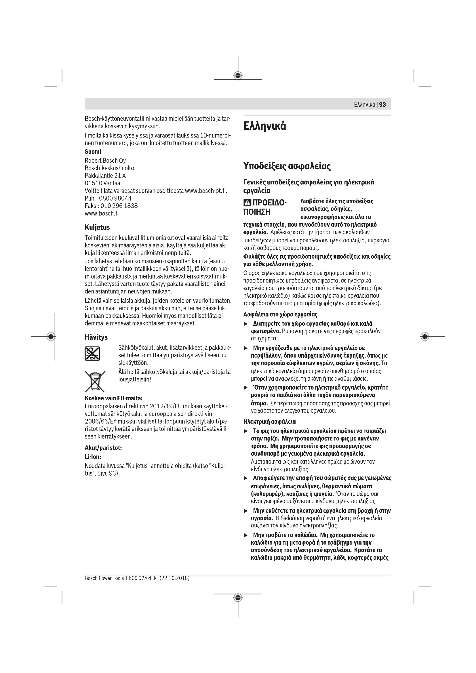 u Μην εργάζεσθε με το ηλεκτρικό εργαλείο σε περιβάλλον, όπου υπάρχει κίνδυνος έκρηξης, όπως με την παρουσία εύφλεκτων υγρών, αερίων ή σκόνης. Τα ηλεκτρικά εργαλεία δημιουργούν σπινθηρισμό ο οποίος μπορεί να αναφλέξει τη σκόνη ή τις αναθυμιάσεις. u Όταν χρησιμοποιείτε το ηλεκτρικό εργαλείο, κρατάτε μακριά τα παιδιά και άλλα τυχόν παρευρισκόμενα άτομα. Σε περίπτωση απόσπασης της προσοχής σας μπορεί να χάσετε τον έλεγχο του εργαλείου. Ηλεκτρική ασφάλεια u Το φις του ηλεκτρικού εργαλείου πρέπει να ταιριάζει στην πρίζα. Μην τροποποιήσετε το φις με κανέναν τρόπο. Μη χρησιμοποιείτε φις προσαρμογής σε συνδυασμό με γειωμένα ηλεκτρικά εργαλεία. Αμεταποίητα φις και κατάλληλες πρίζες μειώνουν τον κίνδυνο ηλεκτροπληξίας. u Αποφεύγετε την επαφή του σώματός σας με γειωμένες επιφάνειες, όπως σωλήνες, θερμαντικά σώματα (καλοριφέρ), κουζίνες ή ψυγεία. Όταν το σώμα σας είναι γειωμένο αυξάνεται ο κίνδυνος ηλεκτροπληξίας. u Μην εκθέτετε τα ηλεκτρικά εργαλεία στη βροχή ή στην υγρασία. Η διείσδυση νερού σ’ ένα ηλεκτρικό εργαλείο αυξάνει τον κίνδυνο ηλεκτροπληξίας. u Μην τραβάτε το καλώδιο. Μη χρησιμοποιείτε το καλώδιο για τη μεταφορά ή το τράβηγμα για την αποσύνδεση του ηλεκτρικού εργαλείου. Κρατάτε το καλώδιο μακριά από θερμότητα, λάδι, κοφτερές ακμές Ελληνικά | 93 Bosch Power Tools 1 609 92A 4LK | (22.10.2018)94 | Ελληνικά 1 609 92A 4LK | (22.10.2018) Bosch Power Tools ή κινούμενα εξαρτήματα. Τυχόν χαλασμένα ή περιπλεγμένα ηλεκτρικά καλώδια αυξάνουν τον κίνδυνο ηλεκτροπληξίας. u Όταν εργάζεσθε μ’ ένα ηλεκτρικό εργαλείο στην ύπαιθρο, χρησιμοποιείτε καλώδιο επέκτασης (μπαλαντέζα) που είναι κατάλληλο και για εξωτερική χρήση. Ηχρήση καλωδίων επιμήκυνσης κατάλληλων για υπαίθριους χώρους ελαττώνει τον κίνδυνο ηλεκτροπληξίας. u Όταν η χρήση του ηλεκτρικού εργαλείου σε υγρό περιβάλλον είναι αναπόφευκτη, τότε χρησιμοποιήστε έναν προστατευτικό διακόπτη διαρροής (διακόπτηςFI/ RCD). Ηχρήση ενός προστατευτικού διακόπτη διαρροής ελαττώνει τον κίνδυνο ηλεκτροπληξίας. Ασφάλεια προσώπων u Να είστε σε επαγρύπνηση, δίνετε προσοχή στην εργασία που κάνετε και χρησιμοποιείτε το ηλεκτρικό εργαλείο με περίσκεψη. Μην χρησιμοποιείτε το ηλεκτρικό εργαλείο όταν είστε κουρασμένοι ή υπό την επήρεια ναρκωτικών, οινοπνεύματος ή φαρμάκων. Μια στιγμιαία απροσεξία κατά το χειρισμό του ηλεκτρικού εργαλείου μπορεί να οδηγήσει σε σοβαρούς τραυματισμούς. u Χρησιμοποιείτε τον προσωπικό εξοπλισμό προστασίας. Φοράτε πάντα προστατευτικά γυαλιά. Ο κατάλληλος προστατευτικός εξοπλισμός, όπως μάσκα προστασίας από σκόνη, αντιολισθητικά υποδήματα ασφαλείας, προστατευτικό κράνος ή ωτασπίδες, ανάλογα με τις εκάστοτε συνθήκες, ελαττώνει τον κίνδυνο τραυματισμών. u Αποφεύγετε την αθέλητη εκκίνηση. Βεβαιωθείτε, ότι ο διακόπτης είναι στη θέση Off, πριν συνδέσετε το ηλεκτρικό εργαλείο με την πηγή τροφοδοσίας και/ή την μπαταρία καθώς και πριν το παραλάβετε ή το μεταφέρετε. Όταν μεταφέρετε τα ηλεκτρικά εργαλεία έχοντας το δάχτυλό σας στο διακόπτη ή όταν συνδέσετε τα ηλεκτρικά εργαλεία με την πηγή ρεύματος όταν αυτά είναι ακόμη στη θέση ΟΝ, τότε δημιουργείται κίνδυνος τραυματισμών. u Απομακρύνετε από το ηλεκτρικό εργαλείο τυχόν εξαρτήματα ρύθμισης ή κλειδιά πριν θέσετε το ηλεκτρικό εργαλείο σε λειτουργία. Ένα εργαλείο ή κλειδί συναρμολογημένο σ’ ένα περιστρεφόμενο τμήμα ενός ηλεκτρικού εργαλείου μπορεί να οδηγήσει σε τραυματισμού
