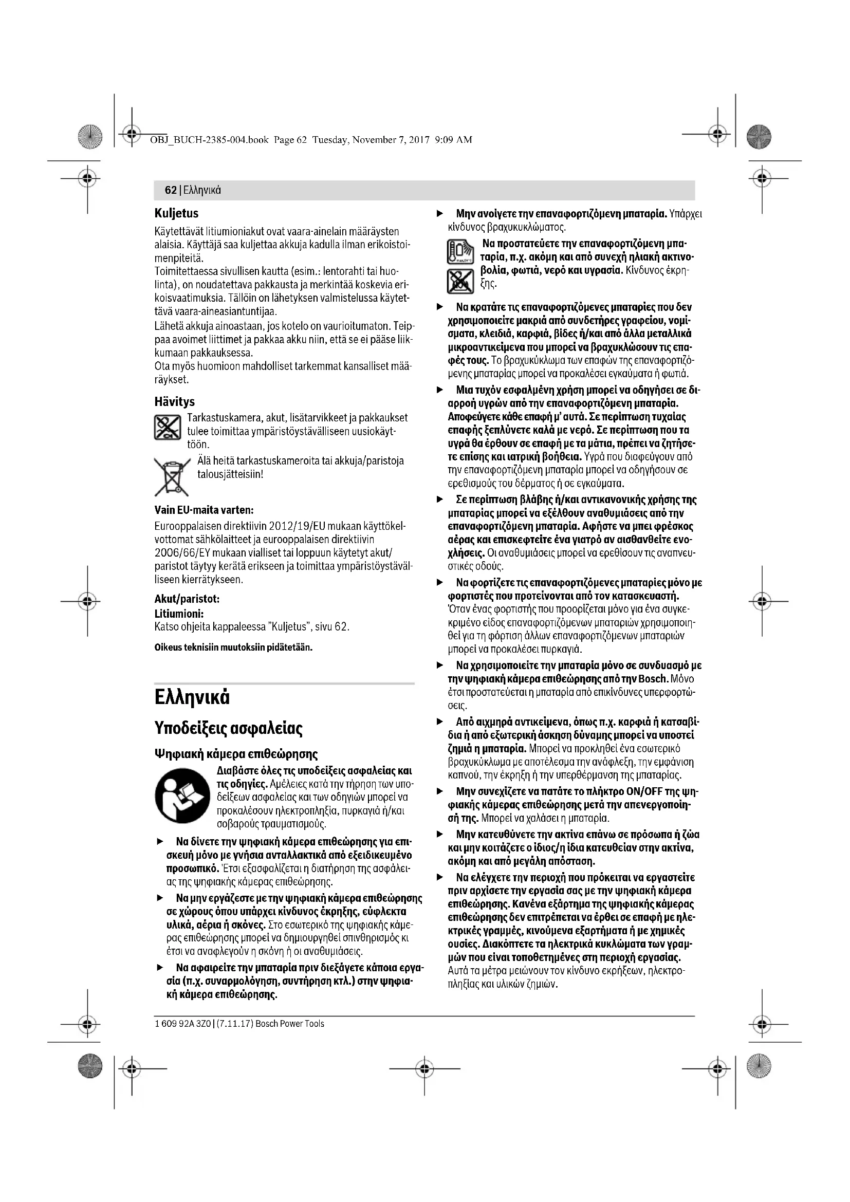 OBJ_BUCH-2385-004.book Page 64 Tuesday, November 7, 2017 9:09 AMΕλληνικά | 65 Bosch Power Tools 1 609 92A 3Z0 | (7.11.17) Υπόδειξη: Η χρήση μπαταριών ακατάλληλων για την ψηφιακή κάμερα επιθεώρησης μπορεί να προκαλέσει ανωμαλίες λει- τουργίας ή ζημιές στην ψηφιακή κάμερα επιθεώρησης. Υπόδειξη: Η επαναφορτιζόμενη μπαταρία παραδίδεται μερι- κώς φορτισμένη. Για να εξασφαλίσετε την πλήρη ισχύ της επα- ναφορτιζόμενης μπαταρίας πρέπει, πριν την χρησιμοποιήσετε για πρώτη φορά, να την φορτίσετε εντελώς. Η επαναφορτιζόμενη μπαταρία ιόντων λιθίου μπορεί να φορτι- στεί ανά πάσα στιγμή χωρίς να περιορίζεται η διάρκεια της ζωής της. Η διακοπή της φόρτισης δεν βλάπτει την επαναφορτιζόμε- νη μπαταρία. Για την τοποθέτηση της φορτισμένης μπαταρίας 17 σπρώξτε την στην υποδοχή 28, ώσπου να ασφαλιστεί στη θέση της και να είναι ισόπεδη με τη λαβή της κάμερας επιθεώρησης. Για την αφαίρεση της μπαταρίας 17 πατήστε τα κουμπιά απα- σφάλισης 18 και τραβήξτε την μπαταρία έξω από την υποδοχή