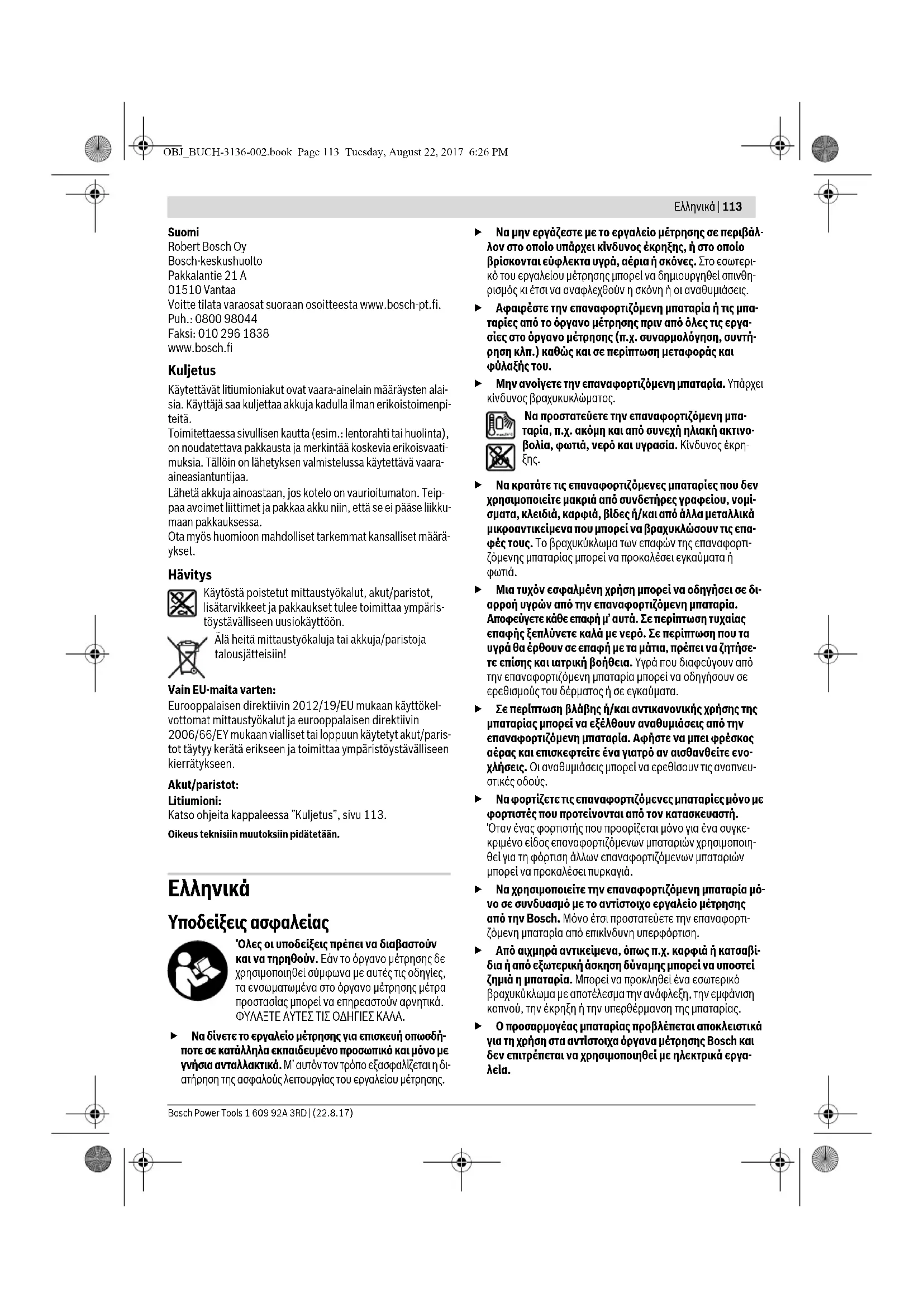 Υποδείξεις ασφαλείας Όλες οι υποδείξεις πρέπει να διαβαστούν και να τηρηθούν. Εάν το όργανο μέτρησης δε χρησιμοποιηθεί σύμφωνα με αυτές τις οδηγίες, τα ενσωματωμένα στο όργανο μέτρησης μέτρα προστασίας μπορεί να επηρεαστούν αρνητικά. ΦΥΛΑΞΤΕ ΑΥΤΕΣ ΤΙΣ ΟΔΗΓΙΕΣ ΚΑΛΑ. Να δίνετε το εργαλείο μέτρησης για επισκευή οπωσδή- ποτε σε κατάλληλα εκπαιδευμένο προσωπικό και μόνο με γνήσια ανταλλακτικά. Μ’ αυτόν τον τρόπο εξασφαλίζεται η δι- ατήρηση της ασφαλούς λειτουργίας του εργαλείου μέτρησης. Να μην εργάζεστε με το εργαλείο μέτρησης σε περιβάλ- λον στο οποίο υπάρχει κίνδυνος έκρηξης, ή στο οποίο βρίσκονται εύφλεκτα υγρά, αέρια ή σκόνες. Στο εσωτερι- κό του εργαλείου μέτρησης μπορεί να δημιουργηθεί σπινθη- ρισμός κι έτσι να αναφλεχθούν η σκόνη ή οι αναθυμιάσεις. Αφαιρέστε την επαναφορτιζόμενη μπαταρία ή τις μπα- ταρίες από το όργανο μέτρησης πριν από όλες τις εργα- σίες στο όργανο μέτρησης (π.χ. συναρμολόγηση, συντή- ρηση κλπ.) καθώς και σε περίπτωση μεταφοράς και φύλαξής του. Μην ανοίγετε την επαναφορτιζόμενη μπαταρία. Υπάρχει κίνδυνος βραχυκυκλώματος. Να προστατεύετε την επαναφορτιζόμενη μπα- ταρία, π.χ. ακόμη και από συνεχή ηλιακή ακτινο- βολία, φωτιά, νερό και υγρασία. Κίνδυνος έκρη-