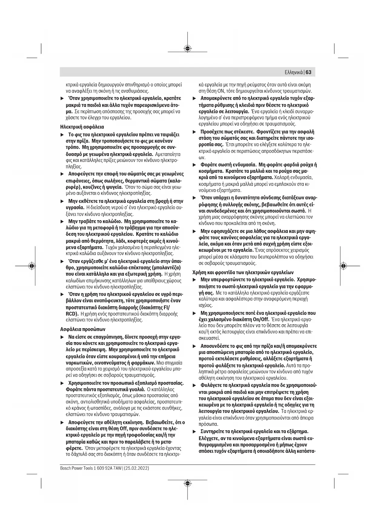 u Μην εργάζεσθε με το ηλεκτρικό εργαλείο σε περιβάλ- λον, όπου υπάρχει κίνδυνος έκρηξης, όπως με την πα- ρουσία εύφλεκτων υγρών, αερίων ή σκόνης. Τα ηλε- 1 609 92A 7AW | (25.02.2022) Bosch Power ToolsΕλληνικά | 63 κτρικά εργαλεία δημιουργούν σπινθηρισμό ο οποίος μπορεί να αναφλέξει τη σκόνη ή τις αναθυμιάσεις. u Όταν χρησιμοποιείτε το ηλεκτρικό εργαλείο, κρατάτε μακριά τα παιδιά και άλλα τυχόν παρευρισκόμενα άτο- μα. Σε περίπτωση απόσπασης της προσοχής σας μπορεί να χάσετε τον έλεγχο του εργαλείου. Ηλεκτρική ασφάλεια u Το φις του ηλεκτρικού εργαλείου πρέπει να ταιριάζει στην πρίζα. Μην τροποποιήσετε το φις με κανέναν τρόπο. Μη χρησιμοποιείτε φις προσαρμογής σε συν- δυασμό με γειωμένα ηλεκτρικά εργαλεία. Αμεταποίητα φις και κατάλληλες πρίζες μειώνουν τον κίνδυνο ηλεκτρο-