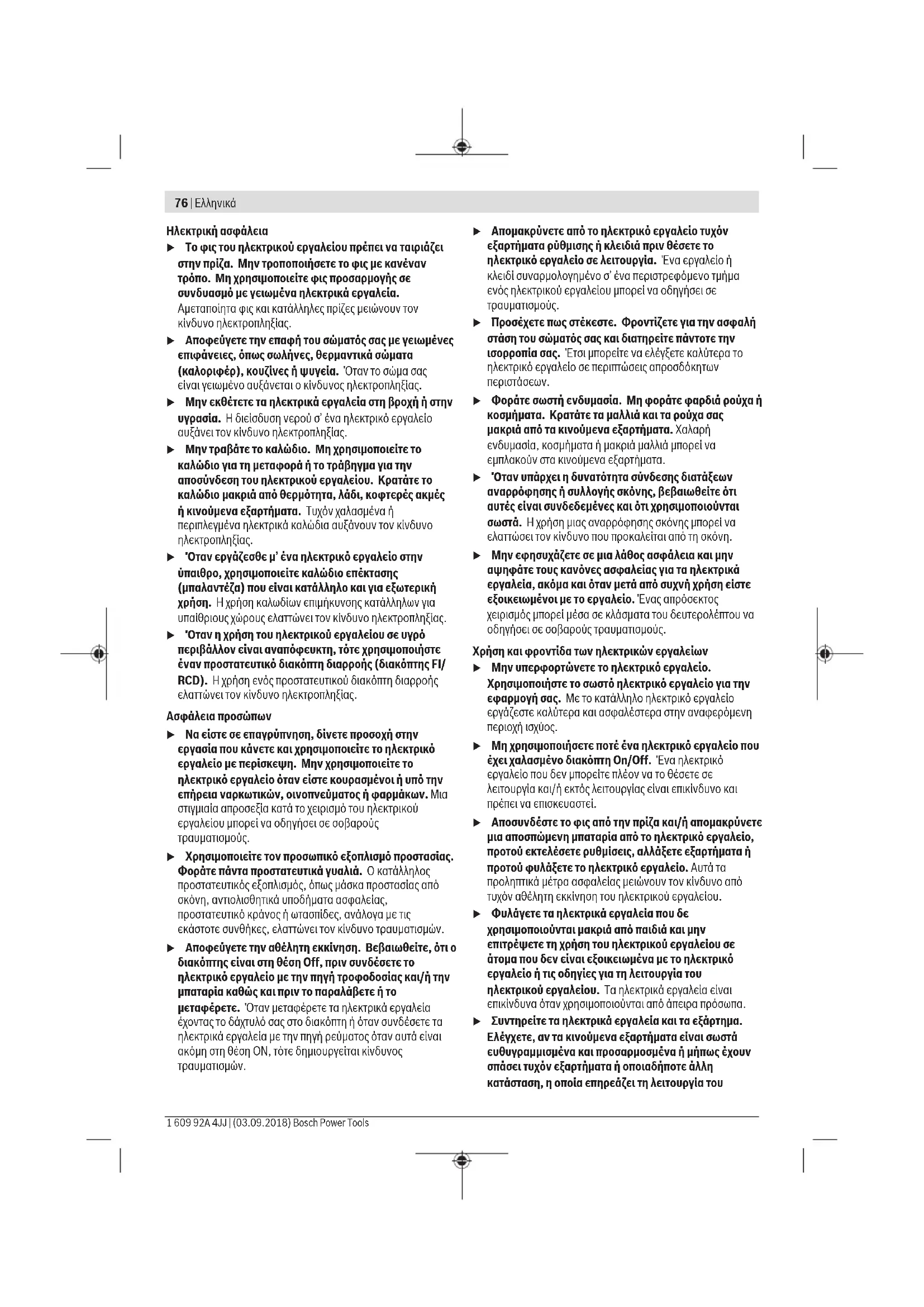 u Μην εργάζεσθε με το ηλεκτρικό εργαλείο σε περιβάλλον, όπου υπάρχει κίνδυνος έκρηξης, όπως με την παρουσία εύφλεκτων υγρών, αερίων ή σκόνης. Τα ηλεκτρικά εργαλεία δημιουργούν σπινθηρισμό ο οποίος μπορεί να αναφλέξει τη σκόνη ή τις αναθυμιάσεις. u Όταν χρησιμοποιείτε το ηλεκτρικό εργαλείο, κρατάτε μακριά τα παιδιά και άλλα τυχόν παρευρισκόμενα άτομα. Σε περίπτωση απόσπασης της προσοχής σας μπορεί να χάσετε τον έλεγχο του εργαλείου. Ελληνικά | 75 Bosch Power Tools 1 609 92A 4JJ | (03.09.2018)76 | Ελληνικά 1 609 92A 4JJ | (03.09.2018) Bosch Power Tools Ηλεκτρική ασφάλεια u Το φις του ηλεκτρικού εργαλείου πρέπει να ταιριάζει στην πρίζα. Μην τροποποιήσετε το φις με κανέναν τρόπο. Μη χρησιμοποιείτε φις προσαρμογής σε συνδυασμό με γειωμένα ηλεκτρικά εργαλεία. Αμεταποίητα φις και κατάλληλες πρίζες μειώνουν τον κίνδυνο ηλεκτροπληξίας. u Αποφεύγετε την επαφή του σώματός σας με γειωμένες επιφάνειες, όπως σωλήνες, θερμαντικά σώματα (καλοριφέρ), κουζίνες ή ψυγεία. Όταν το σώμα σας είναι γειωμένο αυξάνεται ο κίνδυνος ηλεκτροπληξίας. u Μην εκθέτετε τα ηλεκτρικά εργαλεία στη βροχή ή στην υγρασία. Η διείσδυση νερού σ’ ένα ηλεκτρικό εργαλείο αυξάνει τον κίνδυνο ηλεκτροπληξίας. u Μην τραβάτε το καλώδιο. Μη χρησιμοποιείτε το καλώδιο για τη μεταφορά ή το τράβηγμα για την αποσύνδεση του ηλεκτρικού εργαλείου. Κρατάτε το καλώδιο μακριά από θερμότητα, λάδι, κοφτερές ακμές ή κινούμενα εξαρτήματα. Τυχόν χαλασμένα ή περιπλεγμένα ηλεκτρικά καλώδια αυξάνουν τον κίνδυνο ηλεκτροπληξίας. u Όταν εργάζεσθε μ’ ένα ηλεκτρικό εργαλείο στην ύπαιθρο, χρησιμοποιείτε καλώδιο επέκτασης (μπαλαντέζα) που είναι κατάλληλο και για εξωτερική χρήση. Ηχρήση καλωδίων επιμήκυνσης κατάλληλων για υπαίθριους χώρους ελαττώνει τον κίνδυνο ηλεκτροπληξίας. u Όταν η χρήση του ηλεκτρικού εργαλείου σε υγρό περιβάλλον είναι αναπόφευκτη, τότε χρησιμοποιήστε έναν προστατευτικό διακόπτη διαρροής (διακόπτηςFI/ RCD). Ηχρήση ενός προστατευτικού διακόπτη διαρροής ελαττώνει τον κίνδυνο ηλεκτροπληξίας. Ασφάλεια προσώπων u Να είστε σε επαγρύπνηση, δίνετε προσοχή στην εργασία που κάνετε και χρησιμοποιείτε το ηλεκτρικό εργαλείο με περίσκεψη. Μην χρησιμοποιείτε το ηλεκτρικό εργαλείο όταν είστε κουρασμένοι ή υπό την επήρεια ναρκωτικών, οινοπνεύματος ή φαρμάκων. Μια στιγμιαία απροσεξία κατά το χειρισμό του ηλεκτρικού εργαλείου μπορεί να οδηγήσει σε σοβαρούς τραυματισμούς. u Χρησιμοποιείτε τον προσωπικό εξοπλισμό προστασίας. Φοράτε πάντα προστατευτικά γυαλιά. Ο κατάλληλος προστατευτικός εξοπλισμός, όπως μάσκα προστασίας από σκόνη, αντιολισθητικά υποδήματα ασφαλείας, προστατευτικό κράνος ή ωτασπίδες, ανάλογα με τις εκάστοτε συνθήκες, ελαττώνει τον κίνδυνο τραυματισμών. u Αποφεύγετε την αθέλητη εκκίνηση. Βεβαιωθείτε, ότι ο διακόπτης είναι στη θέση Off, πριν συνδέσετε το ηλεκτρικό εργαλείο με την πηγή τροφοδοσίας και/ή την μπαταρία καθώς και πριν το παραλάβετε ή το μεταφέρετε. Όταν μεταφέρετε τα ηλεκτρικά εργαλεία έχοντας το δάχτυλό σας στο διακόπτη ή όταν συνδέσετε τα ηλεκτρικά εργαλεία με την πηγή ρεύματος όταν αυτά είναι ακόμη στη θέση ΟΝ, τότε δημιουργείται κίνδυνος τραυματισμών. u Απομακρύνετε από το ηλεκτρικό εργαλείο τυχόν εξαρτήματα ρύθμισης ή κλειδιά πριν θέσετε το ηλεκτρικό εργαλείο σε λειτουργία. Ένα εργαλείο ή κλειδί συναρμολογημένο σ’ ένα περιστρεφόμενο τμήμα ενός ηλεκτρικού εργαλείου μπορεί να οδηγήσει σε τραυματισμού