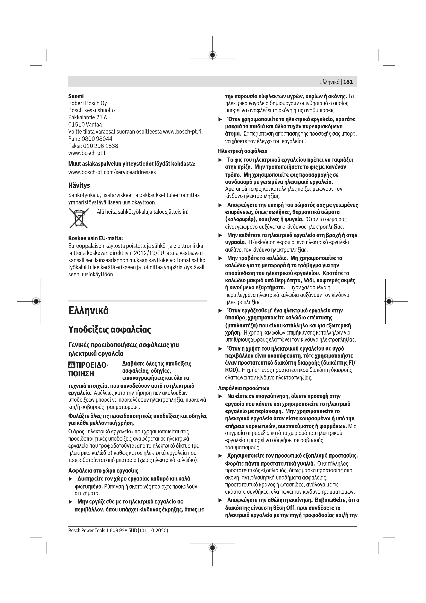 u Μην εργάζεσθε με το ηλεκτρικό εργαλείο σε περιβάλλον, όπου υπάρχει κίνδυνος έκρηξης, όπως με την παρουσία εύφλεκτων υγρών, αερίων ή σκόνης. Τα ηλεκτρικά εργαλεία δημιουργούν σπινθηρισμό ο οποίος μπορεί να αναφλέξει τη σκόνη ή τις αναθυμιάσεις. u Όταν χρησιμοποιείτε το ηλεκτρικό εργαλείο, κρατάτε μακριά τα παιδιά και άλλα τυχόν παρευρισκόμενα άτομα. Σε περίπτωση απόσπασης της προσοχής σας μπορεί να χάσετε τον έλεγχο του εργαλείου. Ηλεκτρική ασφάλεια u Το φις του ηλεκτρικού εργαλείου πρέπει να ταιριάζει στην πρίζα. Μην τροποποιήσετε το φις με κανέναν τρόπο. Μη χρησιμοποιείτε φις προσαρμογής σε συνδυασμό με γειωμένα ηλεκτρικά εργαλεία. Αμεταποίητα φις και κατάλληλες πρίζες μειώνουν τον κίνδυνο ηλεκτροπληξίας. u Αποφεύγετε την επαφή του σώματός σας με γειωμένες επιφάνειες, όπως σωλήνες, θερμαντικά σώματα (καλοριφέρ), κουζίνες ή ψυγεία. Όταν το σώμα σας είναι γειωμένο αυξάνεται ο κίνδυνος ηλεκτροπληξίας. u Μην εκθέτετε τα ηλεκτρικά εργαλεία στη βροχή ή στην υγρασία. Η διείσδυση νερού σ’ ένα ηλεκτρικό εργαλείο αυξάνει τον κίνδυνο ηλεκτροπληξίας. u Μην τραβάτε το καλώδιο. Μη χρησιμοποιείτε το καλώδιο για τη μεταφορά ή το τράβηγμα για την αποσύνδεση του ηλεκτρικού εργαλείου. Κρατάτε το καλώδιο μακριά από θερμότητα, λάδι, κοφτερές ακμές ή κινούμενα εξαρτήματα. Τυχόν χαλασμένα ή περιπλεγμένα ηλεκτρικά καλώδια αυξάνουν τον κίνδυνο ηλεκτροπληξίας. u Όταν εργάζεσθε μ’ ένα ηλεκτρικό εργαλείο στην ύπαιθρο, χρησιμοποιείτε καλώδιο επέκτασης (μπαλαντέζα) που είναι κατάλληλο και για εξωτερική χρήση. Ηχρήση καλωδίων επιμήκυνσης κατάλληλων για υπαίθριους χώρους ελαττώνει τον κίνδυνο ηλεκτροπληξίας. u Όταν η χρήση του ηλεκτρικού εργαλείου σε υγρό περιβάλλον είναι αναπόφευκτη, τότε χρησιμοποιήστε έναν προστατευτικό διακόπτη διαρροής (διακόπτηςFI/ RCD). Ηχρήση ενός προστατευτικού διακόπτη διαρροής ελαττώνει τον κίνδυνο ηλεκτροπληξίας. Ασφάλεια προσώπων u Να είστε σε επαγρύπνηση, δίνετε προσοχή στην εργασία που κάνετε και χρησιμοποιείτε το ηλεκτρικό εργαλείο με περίσκεψη. Μην χρησιμοποιείτε το ηλεκτρικό εργαλείο όταν είστε κουρασμένοι ή υπό την επήρεια ναρκωτικών, οινοπνεύματος ή φαρμάκων. Μια στιγμιαία απροσεξία κατά το χειρισμό του ηλεκτρικού εργαλείου μπορεί να οδηγήσει σε σοβαρούς τραυματισμούς. u Χρησιμοποιείτε τον προσωπικό εξοπλισμό προστασίας. Φοράτε πάντα προστατευτικά γυαλιά. Ο κατάλληλος προστατευτικός εξοπλισμός, όπως μάσκα προστασίας από σκόνη, αντιολισθητικά υποδήματα ασφαλείας, προστατευτικό κράνος ή ωτασπίδες, ανάλογα με τις εκάστοτε συνθήκες, ελαττώνει τον κίνδυνο τραυματισμών. u Αποφεύγετε την αθέλητη εκκίνηση. Βεβαιωθείτε, ότι ο διακόπτης είναι στη θέση Off, πριν συνδέσετε το ηλεκτρικό εργαλείο με την πηγή τροφοδοσίας και/ή την Bosch Power Tools 1 609 92A 5UD | (01.10.2020)182 | Ελληνικά μπαταρία καθώς και πριν το παραλάβετε ή το μεταφέρετε. Όταν μεταφέρετε τα ηλεκτρικά εργαλεία έχοντας το δάχτυλό σας στο διακόπτη ή όταν συνδέσετε τα ηλεκτρικά εργαλεία με την πηγή ρεύματος όταν αυτά είναι ακόμη στη θέση ΟΝ, τότε δημιουργείται κίνδυνος τραυματισμών. u Απομακρύνετε από το ηλεκτρικό εργαλείο τυχόν εξαρτήματα ρύθμισης ή κλειδιά πριν θέσετε το ηλεκτρικό εργαλείο σε λειτουργία. Ένα εργαλείο ή κλειδί συναρμολογημένο σ’ ένα περιστρεφόμενο τμήμα ενός ηλεκτρικού εργαλείου μπορεί να οδηγήσει σε τραυματισμούς. u Προσέχετε πως στέκεστε. Φροντίζετ
