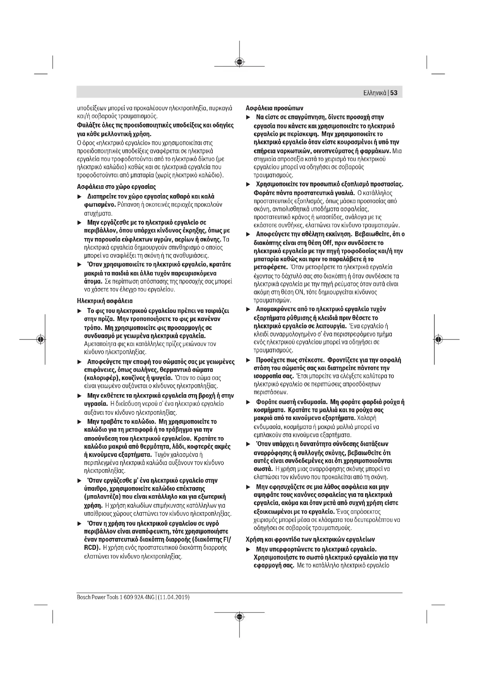 Διαβάστε όλες τις υποδείξεις ασφαλείας, οδηγίες, εικονογραφήσεις και όλα τα τεχνικά στοιχεία, που συνοδεύουν αυτό το ηλεκτρικό εργαλείο. Αμέλειες κατά την τήρηση των ακόλουθων 1 609 92A 4NG | (11.04.2019) Bosch Power ToolsΕλληνικά | 53 υποδείξεων μπορεί να προκαλέσουν ηλεκτροπληξία, πυρκαγιά και/ή σοβαρούς τραυματισμούς. Φυλάξτε όλες τις προειδοποιητικές υποδείξεις και οδηγίες για κάθε μελλοντική χρήση. Ο όρος «ηλεκτρικό εργαλείο» που χρησιμοποιείται στις προειδοποιητικές υποδείξεις αναφέρεται σε ηλεκτρικά εργαλεία που τροφοδοτούνται από το ηλεκτρικό δίκτυο (με ηλεκτρικό καλώδιο) καθώς και σε ηλεκτρικά εργαλεία που τροφοδοτούνται από μπαταρία (χωρίς ηλεκτρικό καλώδιο). Ασφάλεια στο χώρο εργασίας u Διατηρείτε τον χώρο εργασίας καθαρό και καλά φωτισμένο. Ρύπανση ή σκοτεινές περιοχές προκαλούν