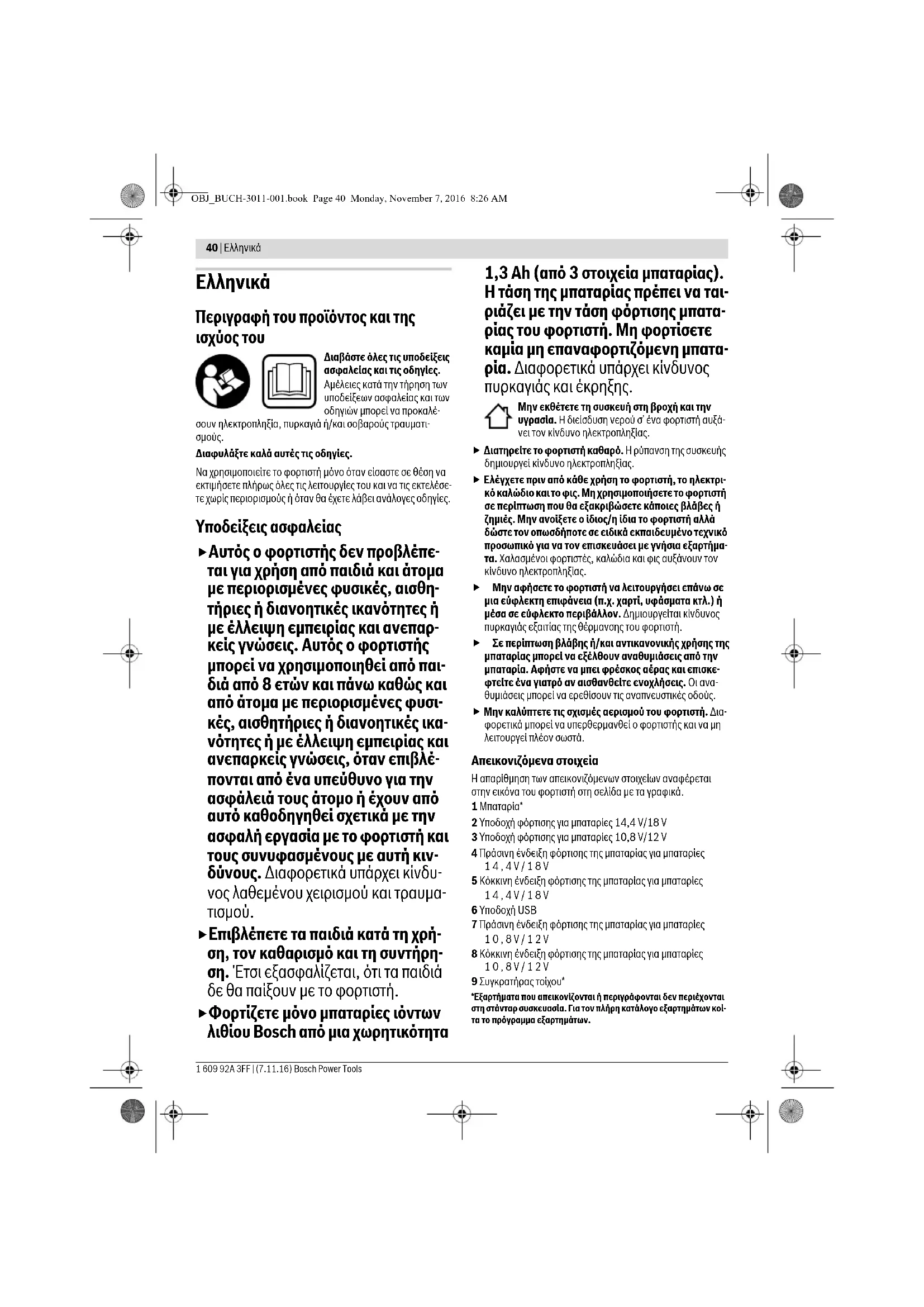 Επιβλέπετε τα παιδιά κατά τη χρή- ση, τον καθαρισμό και τη συντήρη- ση. Έτσι εξασφαλίζεται, ότι τα παιδιά δε θα παίξουν με το φορτιστή. Φορτίζετε μόνο μπαταρίες ιόντων λιθίου Bosch από μια χωρητικότητα 1,3 Ah (από 3 στοιχεία μπαταρίας). Η τάση της μπαταρίας πρέπει να ται- ριάζει με την τάση φόρτισης μπατα- ρίας του φορτιστή. Μη φορτίσετε καμία μη επαναφορτιζόμενη μπατα- ρία. Διαφορετικά υπάρχει κίνδυνος πυρκαγιάς και έκρηξης. Μην εκθέτετε τη συσκευή στη βροχή και την υγρασία. Η διείσδυση νερού σ’ ένα φορτιστή αυξά- νει τον κίνδυνο ηλεκτροπληξίας. Διατηρείτε το φορτιστή καθαρό. Η ρύπανση της συσκευής δημιουργεί κίνδυνο ηλεκτροπληξίας. Ελέγχετε πριν από κάθε χρήση το φορτιστή, το ηλεκτρι- κό καλώδιο και το φις. Μη χρησιμοποιήσετε το φορτιστή σε περίπτωση που θα εξακριβώσετε κάποιες βλάβες ή ζημιές. Μην ανοίξετε ο ίδιος/η ίδια το φορτιστή αλλά δώστε τον οπωσδήποτε σε ειδικά εκπαιδευμένο τεχνικό προσωπικό για να τον επισκευάσει με γνήσια εξαρτήμα- τα. Χαλασμένοι φορτιστές, καλώδια και φις αυξάνουν τον κίνδυνο ηλεκτροπληξίας. Μην αφήσετε το φορτιστή να λειτουργήσει επάνω σε μια εύφλεκτη επιφάνεια (π.χ. χαρτί, υφάσματα κτλ.) ή μέσα σε εύφλεκτο περιβάλλον. Δημιουργείται κίνδυνος πυρκαγιάς εξαιτίας της θέρμανσης του φορτιστή. Σε περίπτωση βλάβης ή/και αντικανονικής χρήσης της μπαταρίας μπορεί να εξέλθουν αναθυμιάσεις από την μπαταρία. Αφήστε να μπει φρέσκος αέρας και επισκε- φτείτε ένα γιατρό αν αισθανθείτε ενοχλήσεις. Οι ανα- θυμιάσεις μπορεί να ερεθίσουν τις αναπνευστικές οδούς. Μην καλύπτετε τις σχισμές αερισμού του φορτιστή. Δια- φορετικά μπορεί να υπερθερμανθεί ο φορτιστής και να μη λειτουργεί πλέον σωστά. Απεικονιζόμενα στοιχεία Η απαρίθμηση των απεικονιζόμενων στοιχείων αναφέρεται στην εικόνα του φορτιστή στη σελίδα με τα γραφικά. 1 Μπαταρία* 2 Υποδοχή φόρτισης για μπαταρίες 14,4 V/18 V 3 Υποδοχή φόρτισης για μπαταρίες 10,8 V/12 V 4 Πράσινη ένδειξη φόρτισης της μπαταρίας για μπαταρίες 14,4V/18V 5 Κόκκινη ένδειξη φόρτισης της μπαταρίας για μπαταρίες 14,4V/18V 6 Υποδοχή USB 7 Πράσινη ένδειξη φόρτισης της μπαταρίας για μπαταρίες 10,8V/12V 8 Κόκκινη ένδειξη φόρτισης της μπαταρίας για μπαταρίες 10,8V/12V 9 Συγκρατήρας τοίχου* *Εξαρτήματα που απεικονίζονται ή περιγράφονται δεν περιέχονται στη στάνταρ συσκευασία. Για τον πλήρη κατάλογο εξαρτημάτων κοί-τα το πρόγραμμα εξαρτημάτων.OBJ_BUCH-3011-001.book Page 40 Monday, November 7, 2016 8:26 AMΕλληνικά | 41 Bosch Power Tools 1 609 92A 3FF | (7.11.16) Τεχνικά χαρακτηριστικά