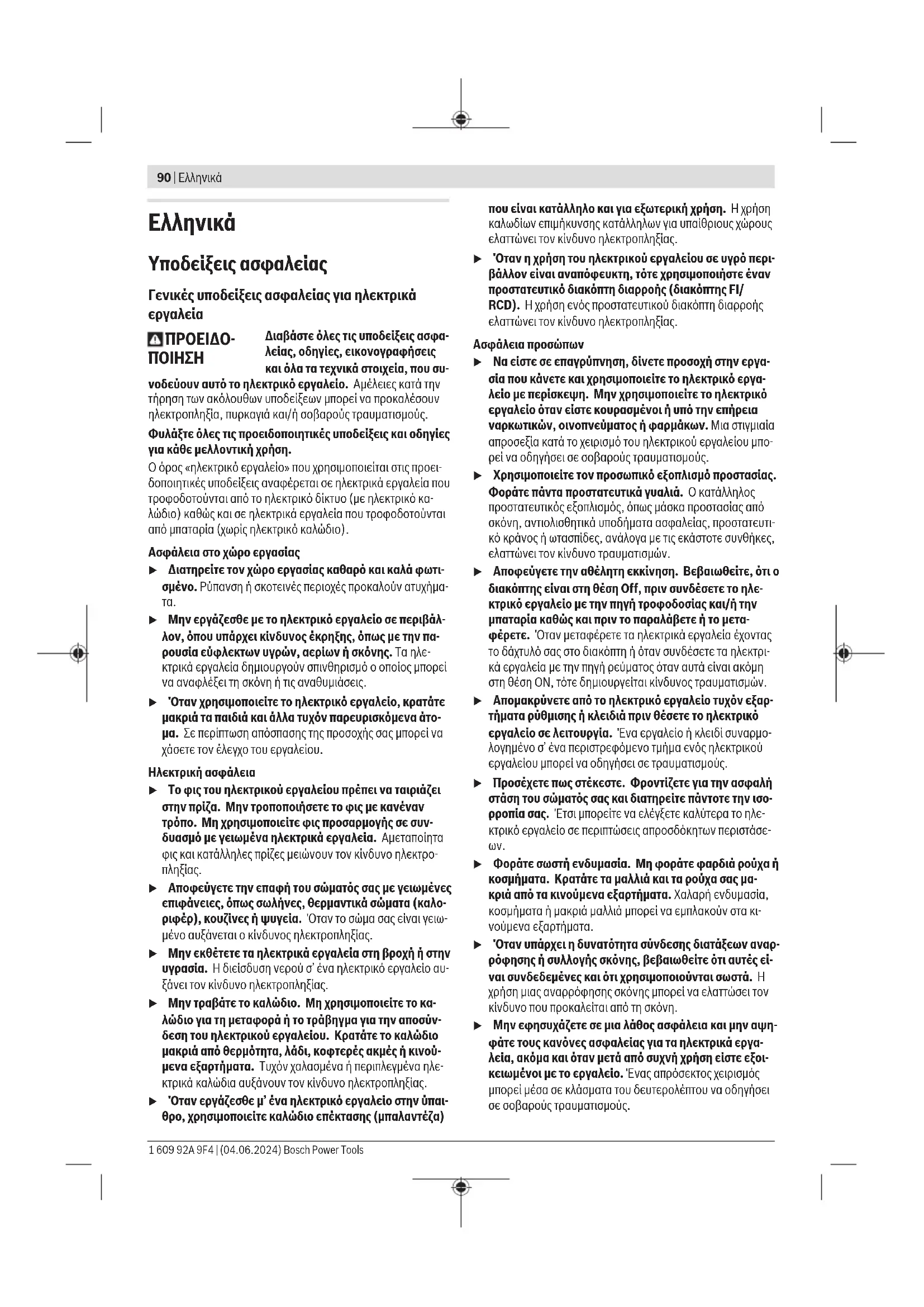 u Φοράτε σωστή ενδυμασία. Μη φοράτε φαρδιά ρούχα ή κοσμήματα. Κρατάτε τα μαλλιά και τα ρούχα σας μα- κριά από τα κινούμενα εξαρτήματα. Χαλαρή ενδυμασία, κοσμήματα ή μακριά μαλλιά μπορεί να εμπλακούν στα κι- νούμενα εξαρτήματα. u Όταν υπάρχει η δυνατότητα σύνδεσης διατάξεων αναρ- ρόφησης ή συλλογής σκόνης, βεβαιωθείτε ότι αυτές εί- ναι συνδεδεμένες και ότι χρησιμοποιούνται σωστά. Η χρήση μιας αναρρόφησης σκόνης μπορεί να ελαττώσει τον κίνδυνο που προκαλείται από τη σκόνη. u Μην εφησυχάζετε σε μια λάθος ασφάλεια και μην αψη- φάτε τους κανόνες ασφαλείας για τα ηλεκτρικά εργα- λεία, ακόμα και όταν μετά από συχνή χρήση είστε εξοι- κειωμένοι με το εργαλείο. Ένας απρόσεκτος χειρισμός μπορεί μέσα σε κλάσματα του δευτερολέπτου να οδηγήσει σε σοβαρούς τραυματισμούς. 1 609 92A 9F4 | (04.06.2024) Bosch Power ToolsΕλληνικά | 91 Χρήση και φροντίδα των ηλεκτρικών εργαλείων u Μην υπερφορτώνετε το ηλεκτρικό εργαλείο. Χρησιμο- ποιήστε το σωστό ηλεκτρικό εργαλείο για την εφαρμο- γή σας. Με το κατάλληλο ηλεκτρικό εργαλείο εργάζεστε καλύτερα και ασφαλέστερα στην αναφερόμενη περιοχή