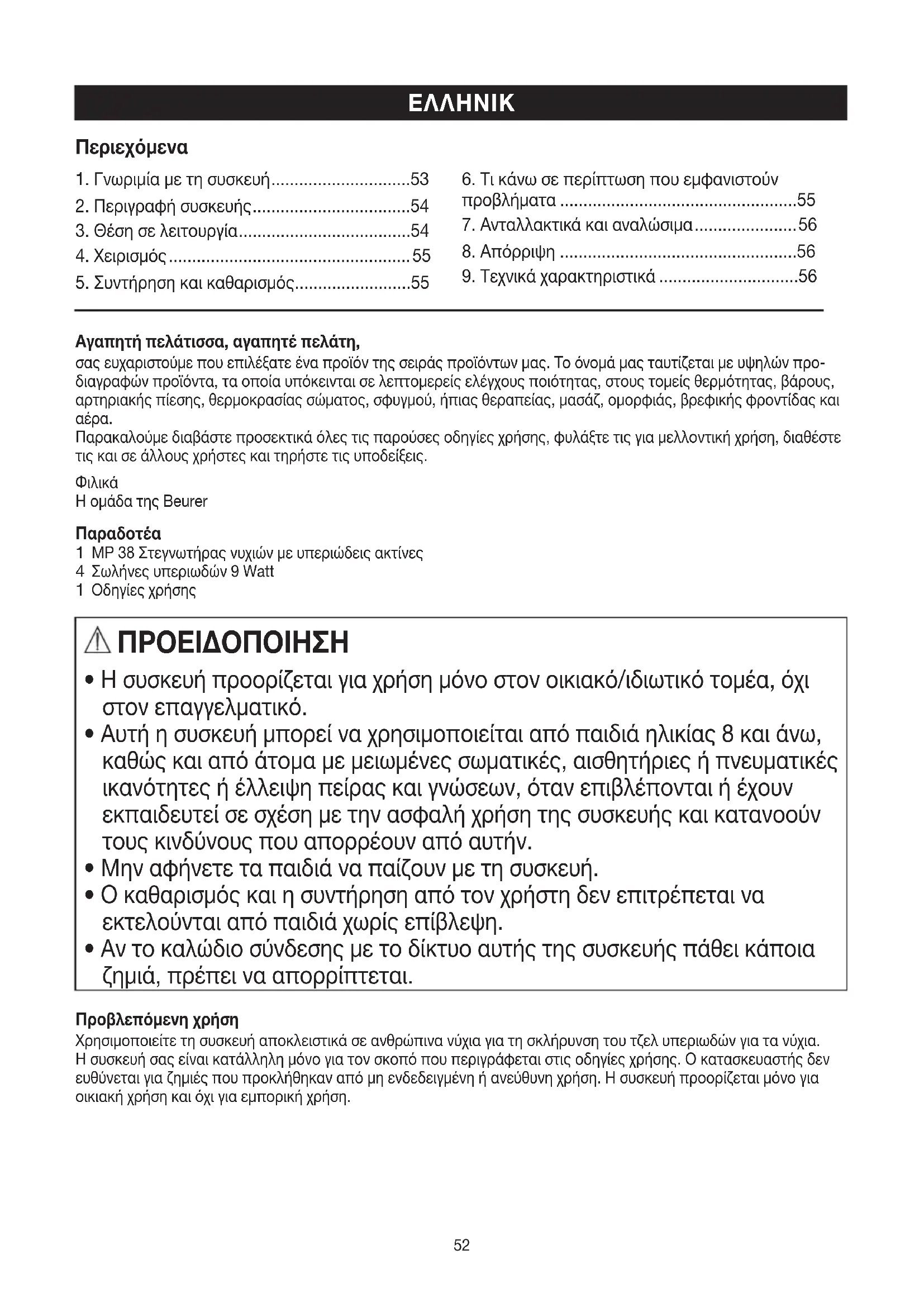 Περιεχόμενα Αγαπητή πελάτισσα, αγαπητέ πελάτη, σας ευχαριστούμε που επιλέξατε ένα προϊόν της σειράς προϊόντων μας. Το όνομά μας ταυτίζεται με υψηλών προ- διαγραφών προϊόντα, τα οποία υπόκεινται σε λεπτομερείς ελέγχους ποιότητας, στους τομείς θερμότητας, βάρους, αρτηριακής πίεσης, θερμοκρασίας σώματος, σφυγμού, ήπιας θεραπείας, μασάζ, ομορφιάς, βρεφικής φροντίδας και αέρα.Παρακαλούμε διαβάστε προσεκτικά όλες τις παρούσες οδηγίες χρήσης, φυλάξτε τις για μελλοντική χρήση, διαθέστε τις και σε άλλους χρήστες και τηρήστε τις υποδείξεις.ΦιλικάΗ ομάδα της BeurerΠαραδοτέα MP 38 Στεγνωτήρας νυχιών με υπεριώδεις ακτίνες Σωλήνες υπεριωδών 9 Watt Οδηγίες χρήσης ΠΡОΕΙΔОΠОΙΗΣΗ