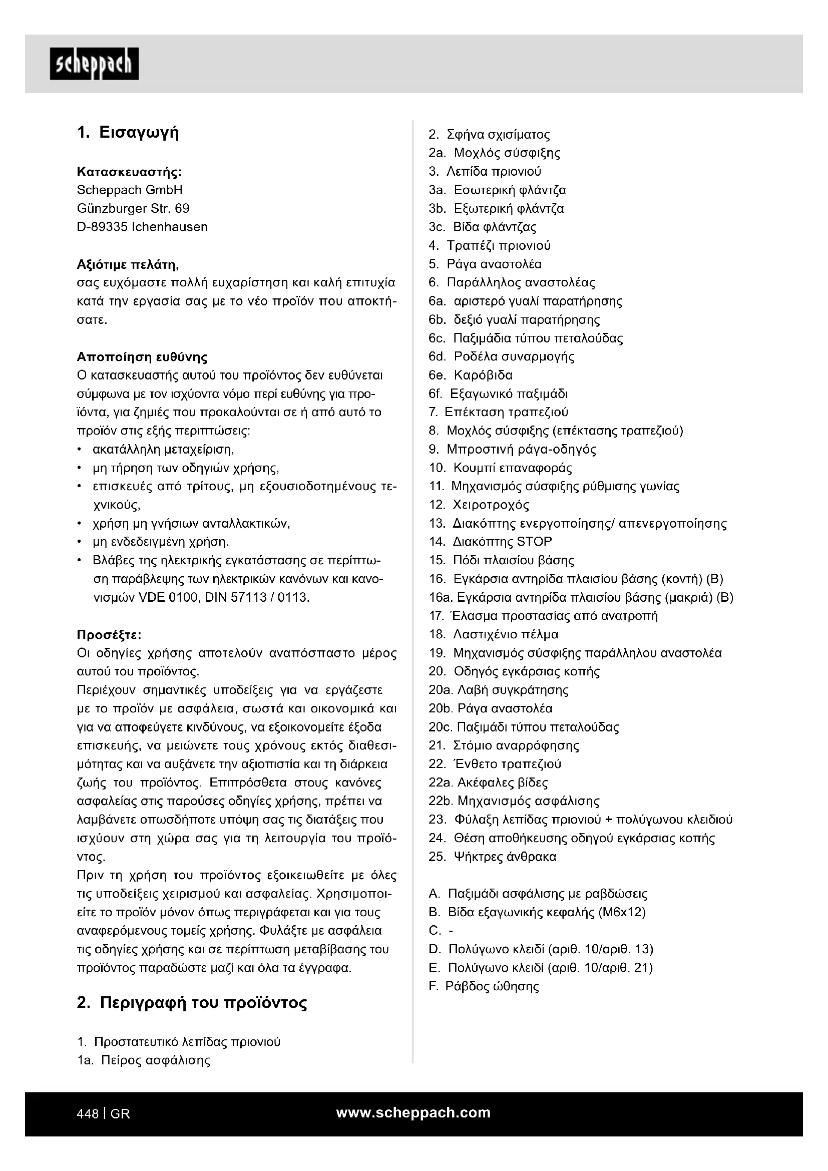 Κατασκευαστής: Scheppach GmbH Günzburger Str. 69 D-89335 Ichenhausen Αξιότιμε πελάτη, σας ευχόμαστε πολλή ευχαρίστηση και καλή επιτυχία κατά την εργασία σας με το νέο προϊόν που αποκτή-