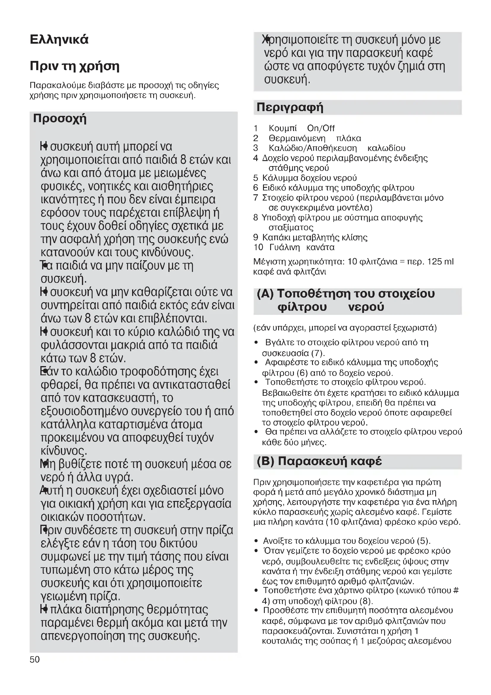 Χρησιμοποιείτε τη συσκευή μόνο με νερό και για την παρασκευή καφέ ώστε να αποφύγετε τυχόν ζημιά στη