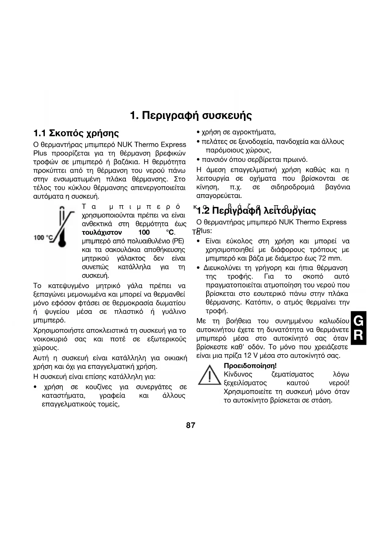 Με τη βοήθεια του συνημμένου καλωδίου αυτοκινήτου έχετε τη δυνατότητα να θερμάνετε μπιμπερό μέσα στο αυτοκίνητό σας όταν βρίσκεστε καθ' οδόν. Το μόνο που χρειάζεστε είναι μια πρίζα 12 V μέσα στο αυτοκίνητό σας. Προειδοποίηση! Κίνδυνος ζεματίσματος λόγω ξεχειλίσματος καυτού νερού! Χρησιμοποιείτε τη συσκευή μόνο όταν το αυτοκίνητο βρίσκεται σε στάση.88
