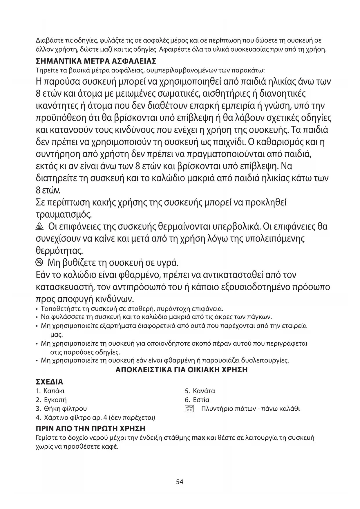 Τηρείτε τα βασικά μέτρα ασφάλειας, συμπεριλαμβανομένων των παρακάτω: Η παρούσα συσκευή μπορεί να χρησιμοποιηθεί από παιδιά ηλικίας άνω των 8 ετών και άτομα με μειωμένες σωματικές, αισθητήριες ή διανοητικές ικανότητες ή άτομα που δεν διαθέτουν επαρκή εμπειρία ή γνώση, υπό την προϋπόθεση ότι θα βρίσκονται υπό επίβλεψη ή θα λάβουν σχετικές οδηγίες και κατανοούν τους κινδύνους που ενέχει η χρήση της συσκευής. Τα παιδιά δεν πρέπει να χρησιμοποιούν τη συσκευή ως παιχνίδι. Ο καθαρισμός και η συντήρηση από χρήστη δεν πρέπει να πραγματοποιούνται από παιδιά, εκτός κι αν είναι άνω των 8 ετών και βρίσκονται υπό επίβλεψη. Να διατηρείτε τη συσκευή και το καλώδιο μακριά από παιδιά ηλικίας κάτω των 8 ετών. Σε περίπτωση κακής χρήσης της συσκευής μπορεί να προκληθεί τραυματισμός. h Οι επιφάνειες της συσκευής θερμαίνονται υπερβολικά. Οι επιφάνειες θα συνεχίσουν να καίνε και μετά από τη χρήση λόγω της υπολειπόμενης θερμότητας. l Μη βυθίζετε τη συσκευή σε υγρά. Εάν το καλώδιο είναι φθαρμένο, πρέπει να αντικατασταθεί από τον κατασκευαστή, τον αντιπρόσωπό του ή κάποιο εξουσιοδοτημένο πρόσωπο προς αποφυγή κινδύνων.