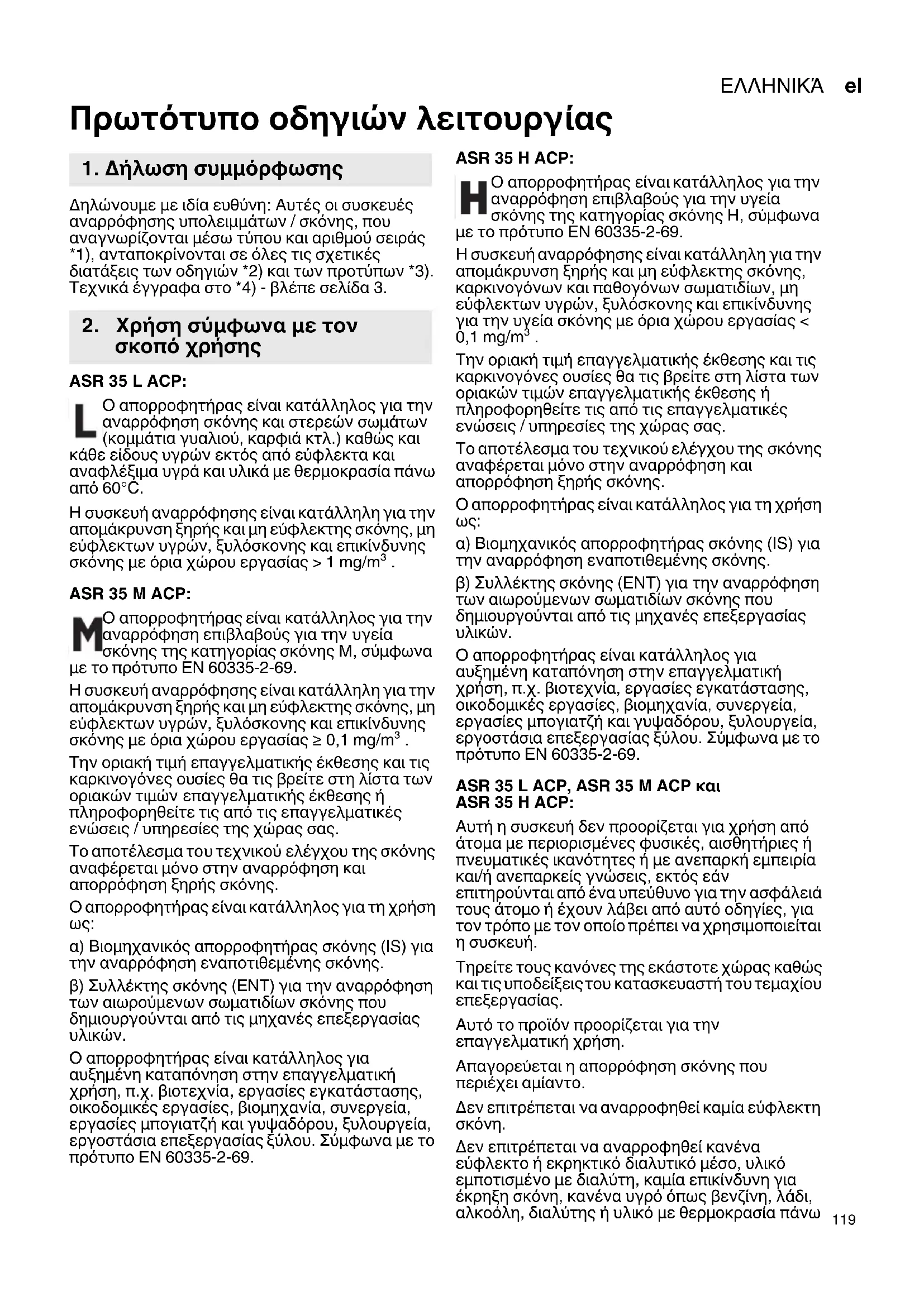 πρότυπο EN 60335-2-69. ASR 35 L ACP, ASR 35 M ACP και ASR 35 H ACP: Αυτή η συσκευή δεν προορίζεται για χρήση από άτομα με περιορισμένες φυσικές, αισθητήριες ή πνευματικές ικανότητες ή με ανεπαρκή εμπειρία και/ή ανεπαρκείς γνώσεις, εκτός εάν επιτηρούνται από ένα υπεύθυνο για την ασφάλειά τους άτομο ή έχουν λάβει από αυτό οδηγίες, για τον τρόπο με τον οποίο πρέπει να χρησιμοποιείται