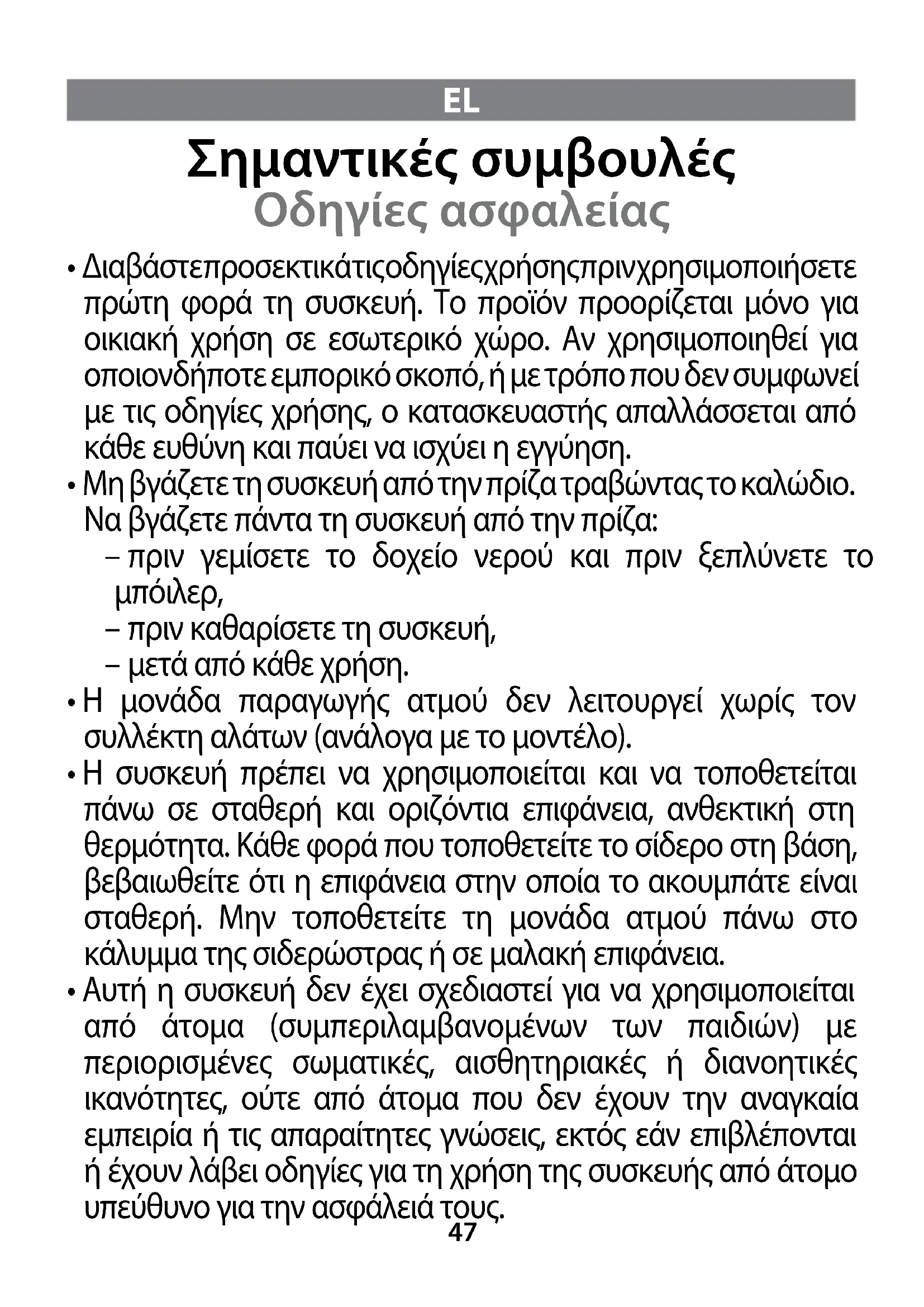 - Διαβάστε προσεκτικά τις οδηγίες χρήσης πριν χρησιμοποιήσετε πρώτη φορά τη συσκευή. Το προϊόν προορίζεται μόνο για οικιακή χρήση σε εσωτερικό χώρο. Αν χρησιμοποιηθεί για οποιονδήποτε εμπορικό σκοπό, ή με τρόπο που δεν συμφωνεί με τις οδηγίες χρήσης, ο κατασκευαστής απαλλάσσεται από κάθε ευθύνη και παύει να ισχύει η εγγύηση.