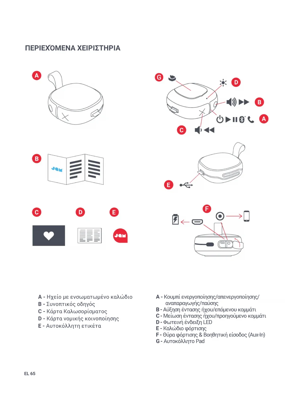 G – ΑΥΤΟΚΟΛΛΗΤΟ Pad Για να χρησιμοποιήσετε το αυτοκόλλητο pad στο πίσω μέρος του ηχείου, ξεκινήστε αποκολλώντας την πλαστική μεμβράνη από την κόλλα. Ανοίξτε το φύλλο και κολλήστε σε οποιαδήποτε λεία επιφάνεια.EL 68 ΝΟΜΙΚΕΣ ΠΛΗΡΟΦΟΡΙΕΣ ΔΙΑΒΑΣΤΕ ΟΛΕΣ ΤΙΣ ΟΔΗΓΙΕΣ ΠΡΙΝ ΤΗ ΧΡΗΣΗ ΚΑΙ ΦΥΛΑΞΕΤΕ ΑΥΤΕΣ ΤΙΣ ΟΔΗΓΙΕΣ ΓΙΑ ΜΕΛΛΟΝΤΙΚΗ ΑΝΑΦΟΡΑ. ΕΓΓΥΗΣΗ - ΗΝΩΜΕΝΟ ΒΑΣΙΛΕΙΟ & ΕΥΡΩΠΗ Η JAM εγγυάται ότι για μία περίοδο 2 ετών από την ημερομηνία αγοράς, ότι αυτό το προϊόν δεν θα παρουσιάσει ελαττώματα στο υλικό και την κατασκευή του. Αυτή η εγγύηση δεν καλύπτει τις ζημίες που προκλήθηκαν από ακατάλληλη χρήση ή κακοποίηση του προϊόντος, ατύχημα, προσάρτηση οποιουδήποτε μη εξουσιοδοτημένου παρελκομένου, αλλοίωση του προϊόντος ή οποιουσδήποτε άλλους όρους που δεν εμπίπτουν στον έλεγχο της JAM. Διανομή στην ΕΕ από την FKA Brands Ltd, Somerhill Business Park, Tonbridge, TN11 0GP, UK (Ηνωμένο Βασίλειο). Email: support.row@fkabrands.com. ΣΗΜΑΝΤΙΚΕΣ ΟΔΗΓΙΕΣ