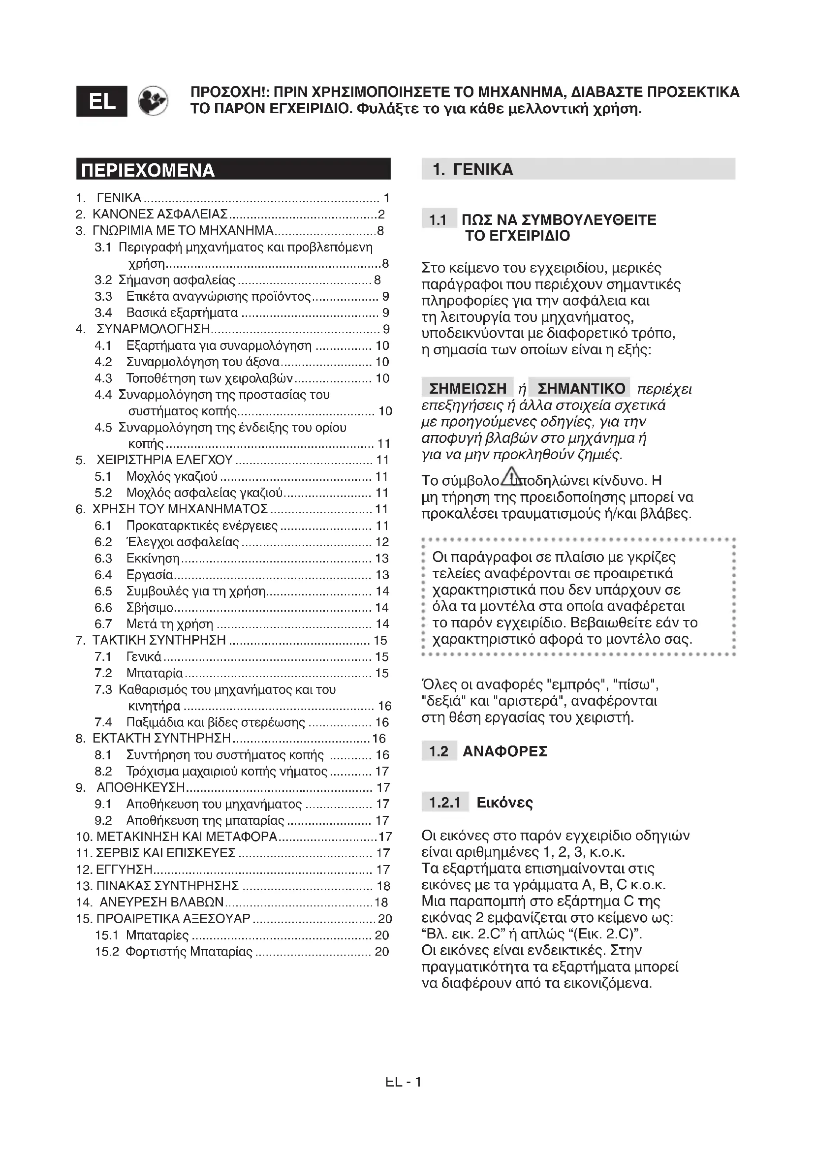 ΣΗΜΑΝΤΙΚΟ Οι παρακάτω κανονισμοί ασφαλείας συμπληρώνουν τις προδιαγραφές ασφαλείας που υπάρχουν στις οδηγίες χρήσης της μπαταρίας και του φορτιστή μπαταρίας που επισυνάπτονται στο μηχάνημα.