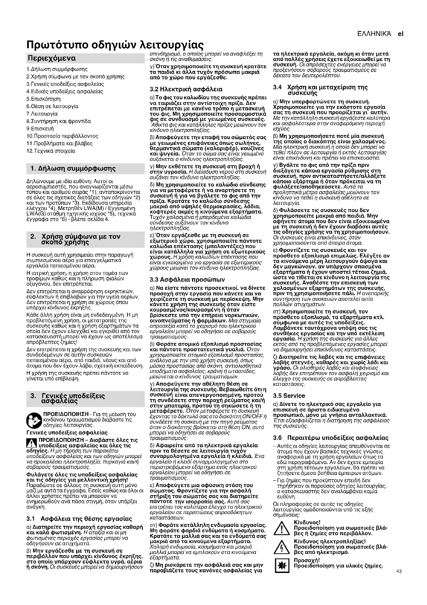 Πρωτότυπο οδηγιών λειτουργίας 1.Δήλωση συμμόρφωσης 2.Χρήση σύμφωνα με τον σκοπό χρήσης 3.Γενικές υποδείξεις ασφαλείας 4.Ειδικές υποδείξεις ασφαλείας 5.Επισκόπηση 6.Θέση σε λειτουργία 7.Λειτουργία 8.Συντήρηση και φροντίδα 9.Επισκευή 10.Προστασία περιβάλλοντος 11.Προβλήματα και βλάβες 12.Τεχνικά στοιχεία Δηλώνουμε με ιδία ευθύνη: Αυτοί οι αεροσυμπιεστές, που αναγνωρίζονται μέσω τύπου και αριθμού σειράς *1), ανταποκρίνονται σε όλες τις σχετικές διατάξεις των οδηγιών *2) και των προτύπων *3). Εκδίδουσα υπηρεσία ελέγχου *4), Μετρηθέν LWA(M) / Εγγυημένη LWA(G) στάθμη ηχητικής ισχύος *5), τεχνικά έγγραφα στο *6) - βλέπε σελίδα 4. Η συσκευή αυτή χρησιμεύει στην παραγωγή συμπιεσμένου αέρα για επαγγελματικά εργαλεία πεπιεσμένου αέρα. Η ιατρική χρήση, η χρήση στον τομέα των τροφίμων καθώς και η πλήρωση φιαλών οξυγόνου, δεν επιτρέπεται. Δεν επιτρέπεται η αναρρόφηση εκρηκτικών, εύφλεκτων ή επιβλαβών για την υγεία αερίων. Δεν επιτρέπεται η χρήση σε χώρους όπου υπάρχει κίνδυνος έκρηξης. Κάθε άλλη χρήση είναι μη ενδεδειγμένη. Η μη προβλεπόμενη χρήση, οι μετατροπές της συσκευής καθώς και η χρήση εξαρτημάτων τα οποία δεν έχουν ελεγχθεί και εγκριθεί από τον κατασκευαστή μπορεί να έχουν ως αποτέλεσμα απρόβλεπτες ζημίες! Δεν επιτρέπεται η χρήση της συσκευής και των συνδεδεμένων σε αυτήν συσκευών πεπιεσμένου αέρα, από παιδιά, νέους και από άτομα που δεν έχουν λάβει σχετική εκπαίδευση. Η χρήση της συσκευής πρέπει πάντοτε να γίνεται υπό επίβλεψη. ΠΡΟΕΙΔΟΠΟΙΗΣΗ - Για τη μείωση του κινδύνου τραυματισμού διαβάστε τις