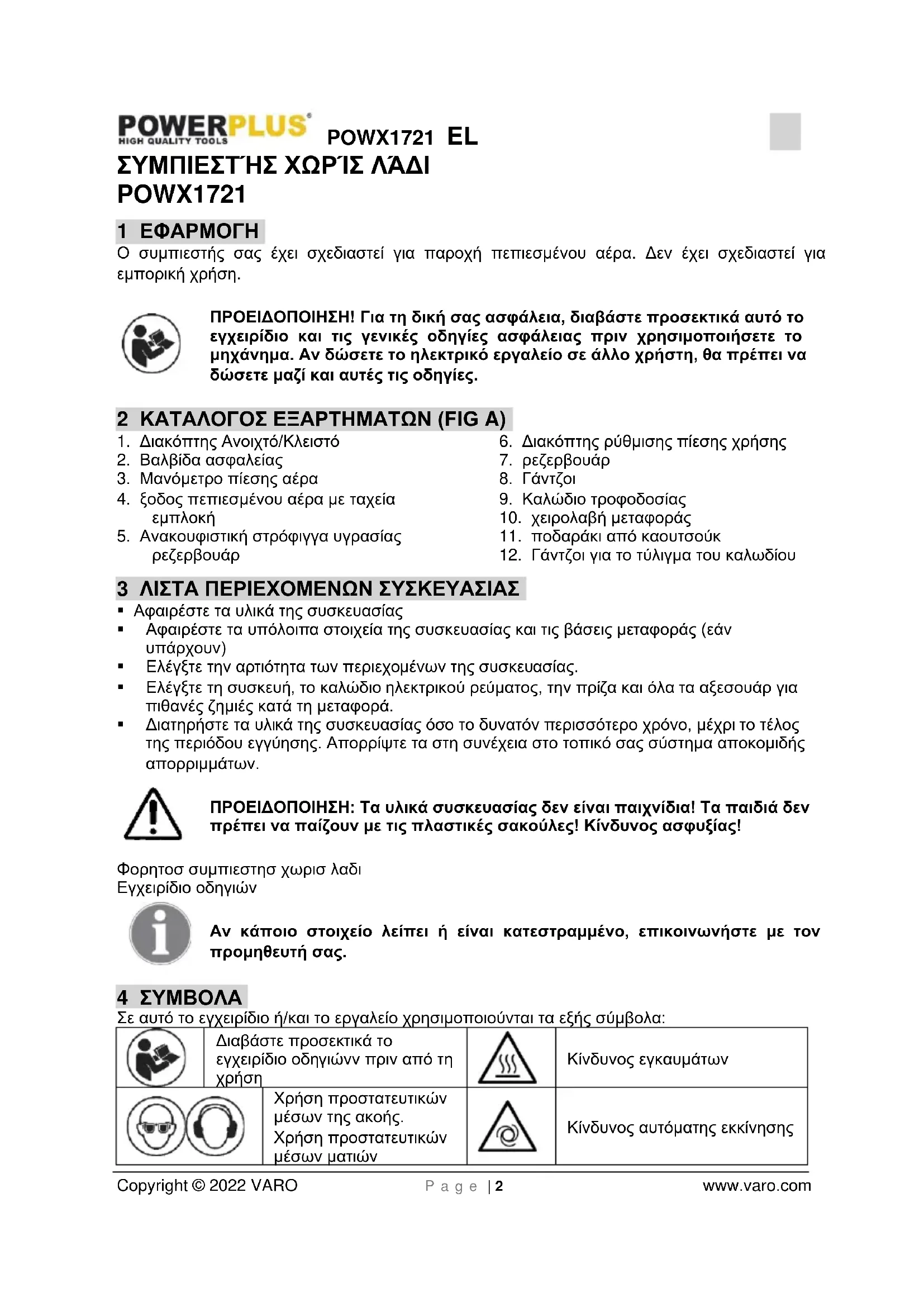 - 12 ΠΕΡΙΒΑΛΛΟΝ POWX1721 EL Copyright © 2022 VARO P a g e | 2 www.varo.com ΣΥΜΠΙΕΣΤΉΣ ΧΩΡΊΣ ΛΆΔΙ POWX1721 1 ΕΦΑΡΜΟΓΗ Ο συμπιεστής σας έχει σχεδιαστεί για παροχή πεπιεσμένου αέρα. Δεν έχει σχεδιαστεί για εμπορική χρήση. ΠΡΟΕΙΔΟΠΟΙΗΣΗ! Για τη δική σας ασφάλεια, διαβάστε προσεκτικά αυτό το εγχειρίδιο και τις γενικές οδηγίες ασφάλειας πριν χρησιμοποιήσετε το μηχάνημα. Αν δώσετε το ηλεκτρικό εργαλείο σε άλλο χρήστη, θα πρέπει να δώσετε μαζί και αυτές τις οδηγίες. 2 ΚΑΤΑΛΟΓΟΣ ΕΞΑΡΤΗΜΑΤΩΝ (FIG A) p. 8