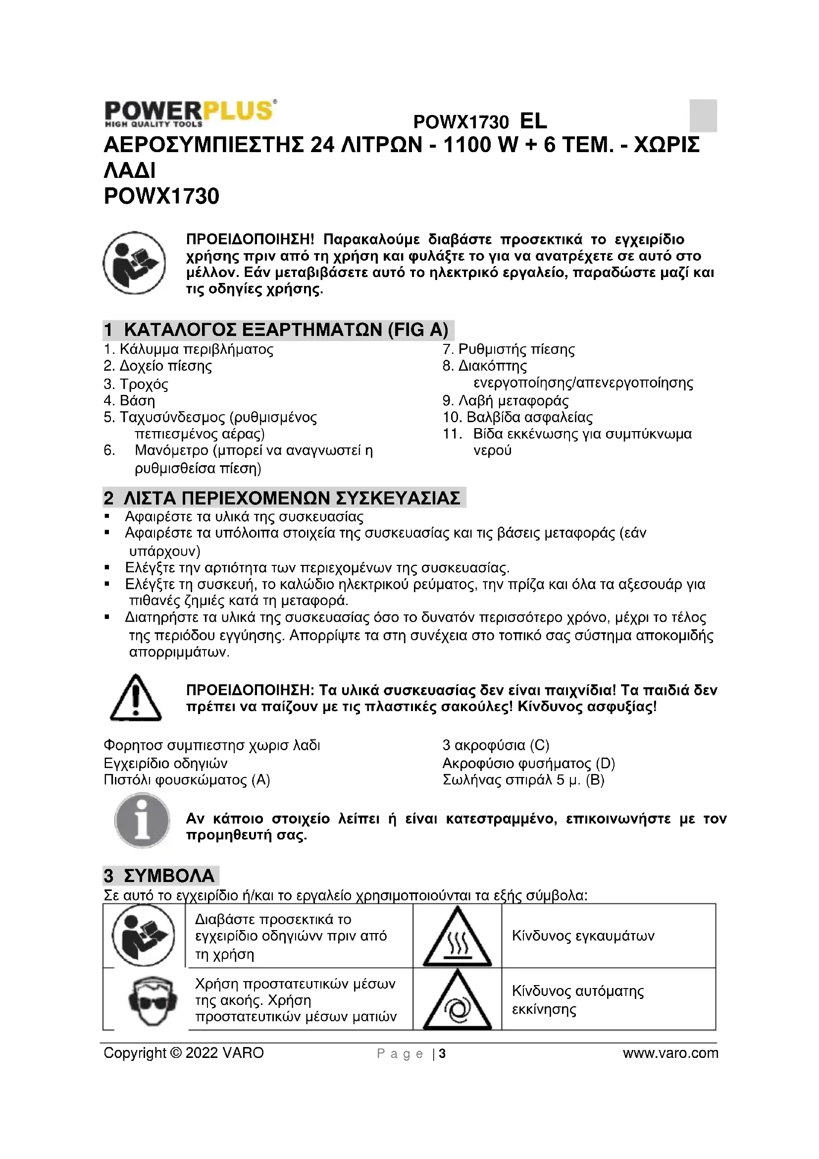 ρυθμιστή πίεσης.POWX1730 EL Copyright © 2022 VARO P a g e | 10 www.varo.com 12 ΕΓΓΥΗΣΗ Αυτό το προϊόν έχει εγγύηση για περίοδο 36 μηνών που ισχύει από την ημερομηνία αγοράς του πρώτου χρήστη. Αυτή η εγγύηση καλύπτει όλα τα ελαττώματα υλικών και κατασκευής. Δεν συμπεριλαμβάνει μπαταρίες, φορτιστές, ελαττωματικά εξαρτήματα που υπόκεινται σε φυσιολογική φθορά, όπως ρουλεμάν, καρβουνάκια, καλώδια και φις, ή αξεσουάρ όπως τρυπάνια, μύτες τρυπανιών, πριονόλαμες, κλπ., ζημιές ή ελαττώματα που προκύπτουν από κακή χρήση, ατυχήματα ή τροποποιήσεις, ούτε έξοδα μεταφοράς. Ζημιές ή/και ελαττώματα που προκύπτουν από κακή χρήση, επίσης δεν εμπίπτουν στους όρους αυτής της εγγύησης. Επίσης αποποιούμεθα κάθε ευθύνη για οποιονδήποτε σωματικό τραυματισμό προκληθεί από κακή χρήση του εργαλείου. Οι επισκευές πρέπει να γίνονται μόνο από εξουσιοδοτημένο κέντρο εξυπηρέτησης πελατών για εργαλεία Powerplus. Για περισσότερες πληροφορίες, μπορείτε πάντα να καλέσετε τον αριθμό 00 32 3 292 92