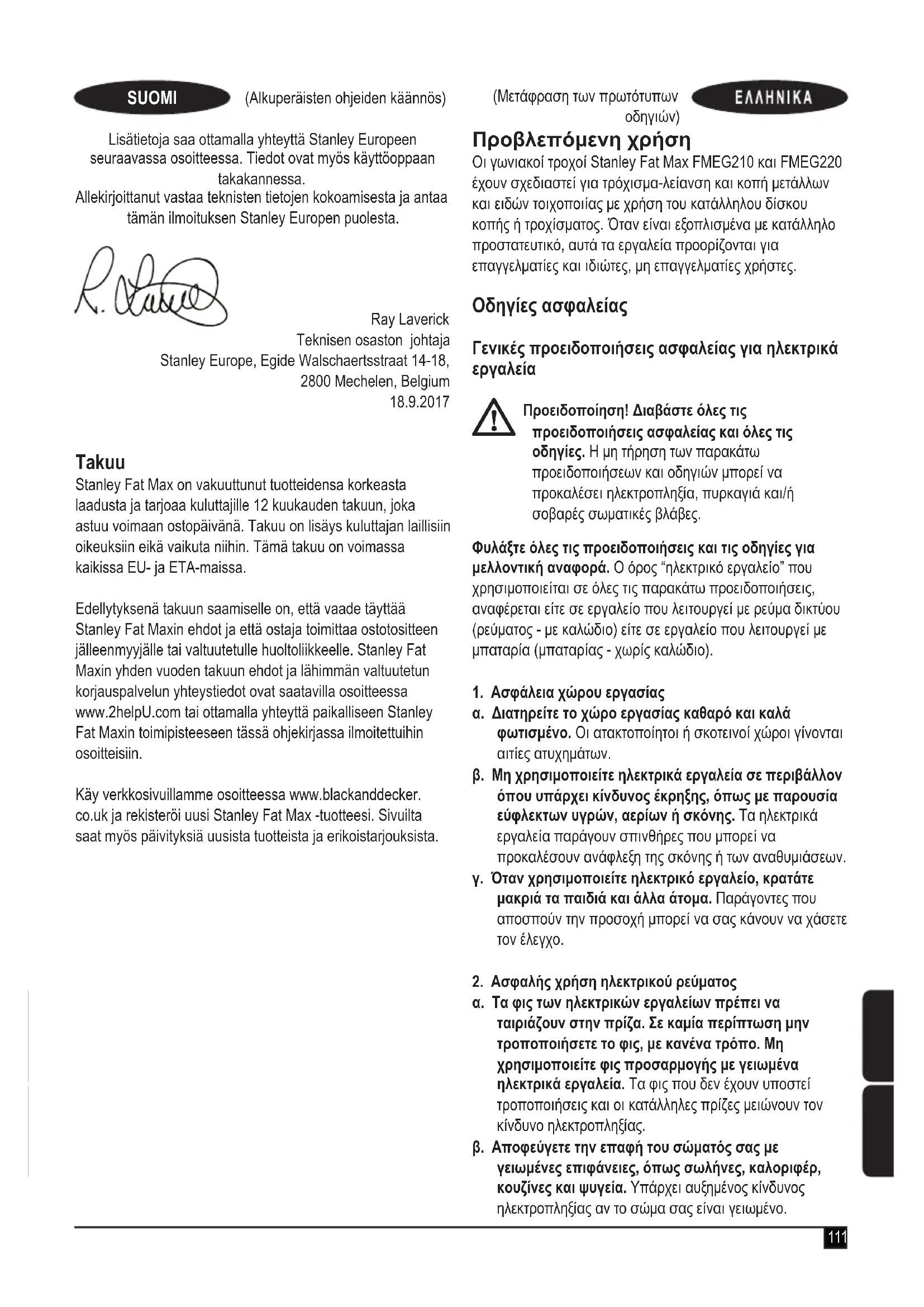 FMEG210, FMEG220 Γωνιακός τροχός Η Stanley Europe δηλώνει ότι αυτά τα προϊόντα που περιγράφονται στα «τεχνικά δεδομένα» συμμορφώνονται με: 2006/42/EC, EN 60745-1:2009 + A11:2010; EN 60745-2-3:2011 + A2:2013 + A11:2014 + A12:2014 + A13:2015 Αυτά τα προϊόντα συμμορφώνονται και με την Οδηγία 2014/30/ΕΕ και 2011/65/ΕΕ. Για περισσότερες πληροφορίες, παρακαλείστε να επικοινωνήσετε με την Stanley Europe στην παρακάτω διεύθυνση ή να ανατρέξετε στο πίσω μέρος του εγχειριδίου. Ο κάτωθι υπογεγραμμένος είναι υπεύθυνος για την κατάρτιση του τεχνικού φακέλου και δηλώνει τα παρόντα εκ μέρους της Stanley Europe. Ray Laverick Διευθυντής Σχεδιασμού Stanley Europe, Egide Walschaertsstraat14-18, 2800 Mechelen, Belgium 18/9/2017