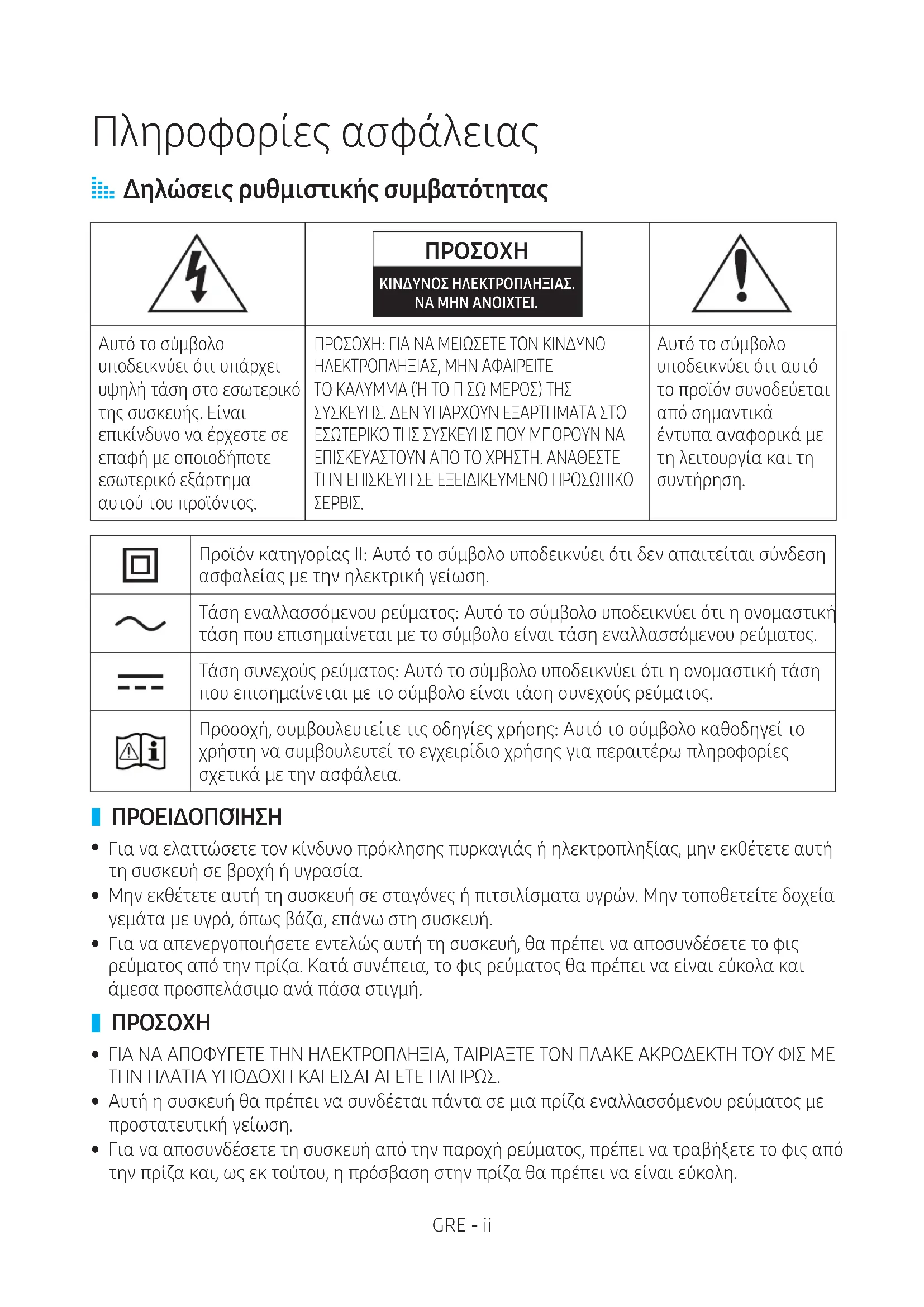 Εάν το προϊόν πέσει κάτω, μπορεί να προκληθεί δυσλειτουργία και να υπάρξει κίνδυνος τραυματισμού. Οι σοβαροί κραδασμοί ή κάποια κρούση μπορεί επίσης να προκαλέσει δυσλειτουργία στο προϊόν και κίνδυνο εκδήλωσης πυρκαγιάς. GRE - iii• Τοποθετήστε το προϊόν σας έτσι ώστε να υπάρχει επαρκής χώρος γύρω του, για εξαερισμό.