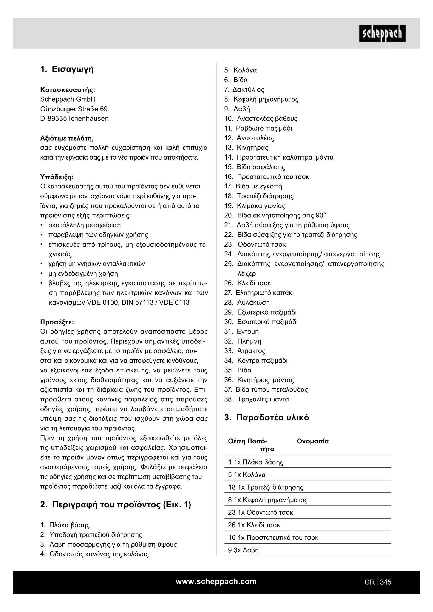 Κατασκευαστής: Scheppach GmbH Günzburger Straße 69 D-89335 Ichenhausen Αξιότιμε πελάτη, σας ευχόμαστε πολλή ευχαρίστηση και καλή επιτυχία κατά την εργασία σας με το νέο προϊόν που αποκτήσατε.