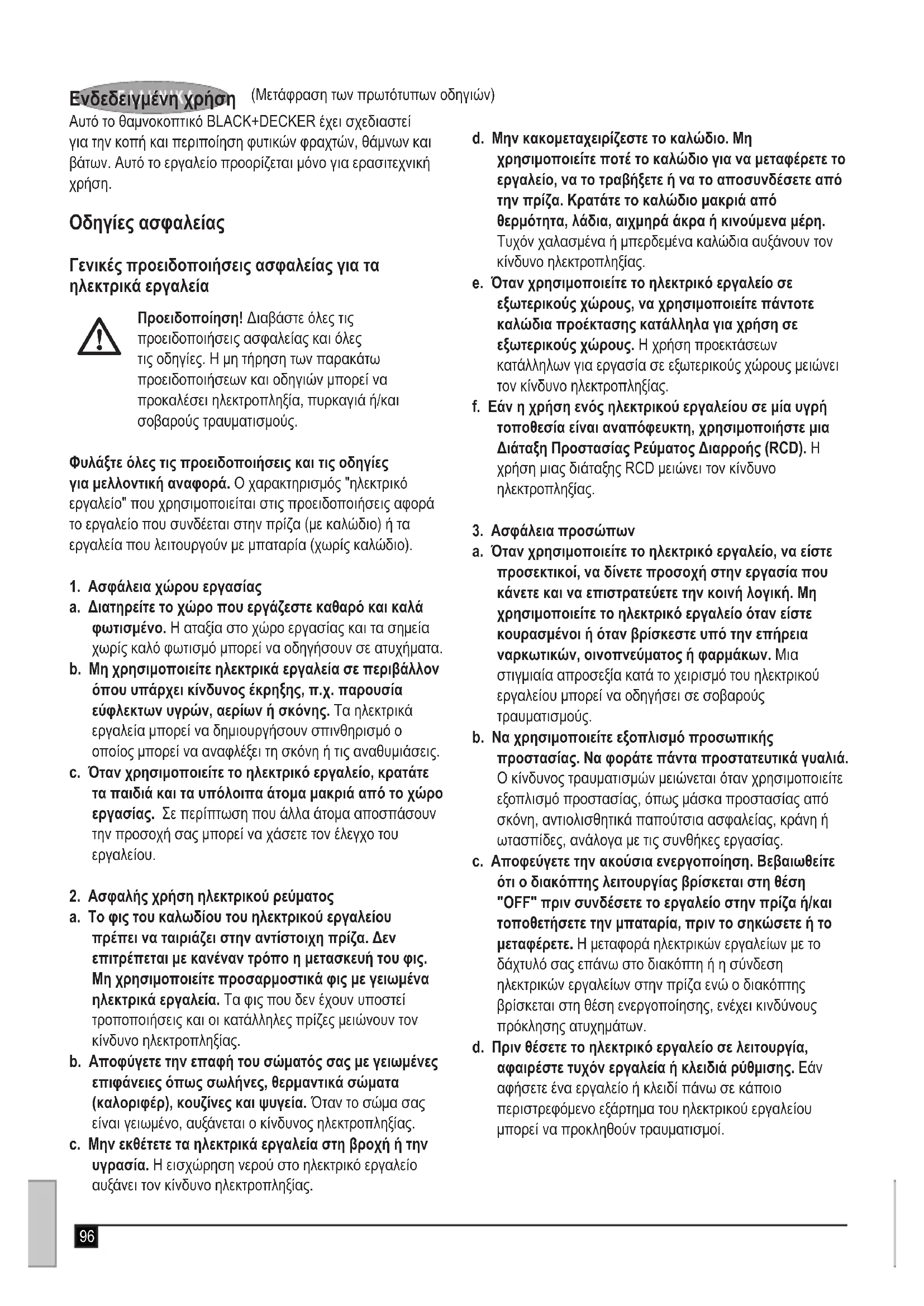 Προειδοποίηση! Διαβάστε όλες τις προειδοποιήσεις ασφαλείας και όλες τις οδηγίες. Η μη τήρηση των παρακάτω προειδοποιήσεων και οδηγιών μπορεί να προκαλέσει ηλεκτροπληξία, πυρκαγιά ή/και σοβαρούς τραυματισμούς. Φυλάξτε όλες τις προειδοποιήσεις και τις οδηγίες για μελλοντική αναφορά. Ο χαρακτηρισμός "ηλεκτρικό εργαλείο" που χρησιμοποιείται στις προειδοποιήσεις αφορά το εργαλείο που συνδέεται στην πρίζα (με καλώδιο) ή τα εργαλεία που λειτουργούν με μπαταρία (χωρίς καλώδιο).