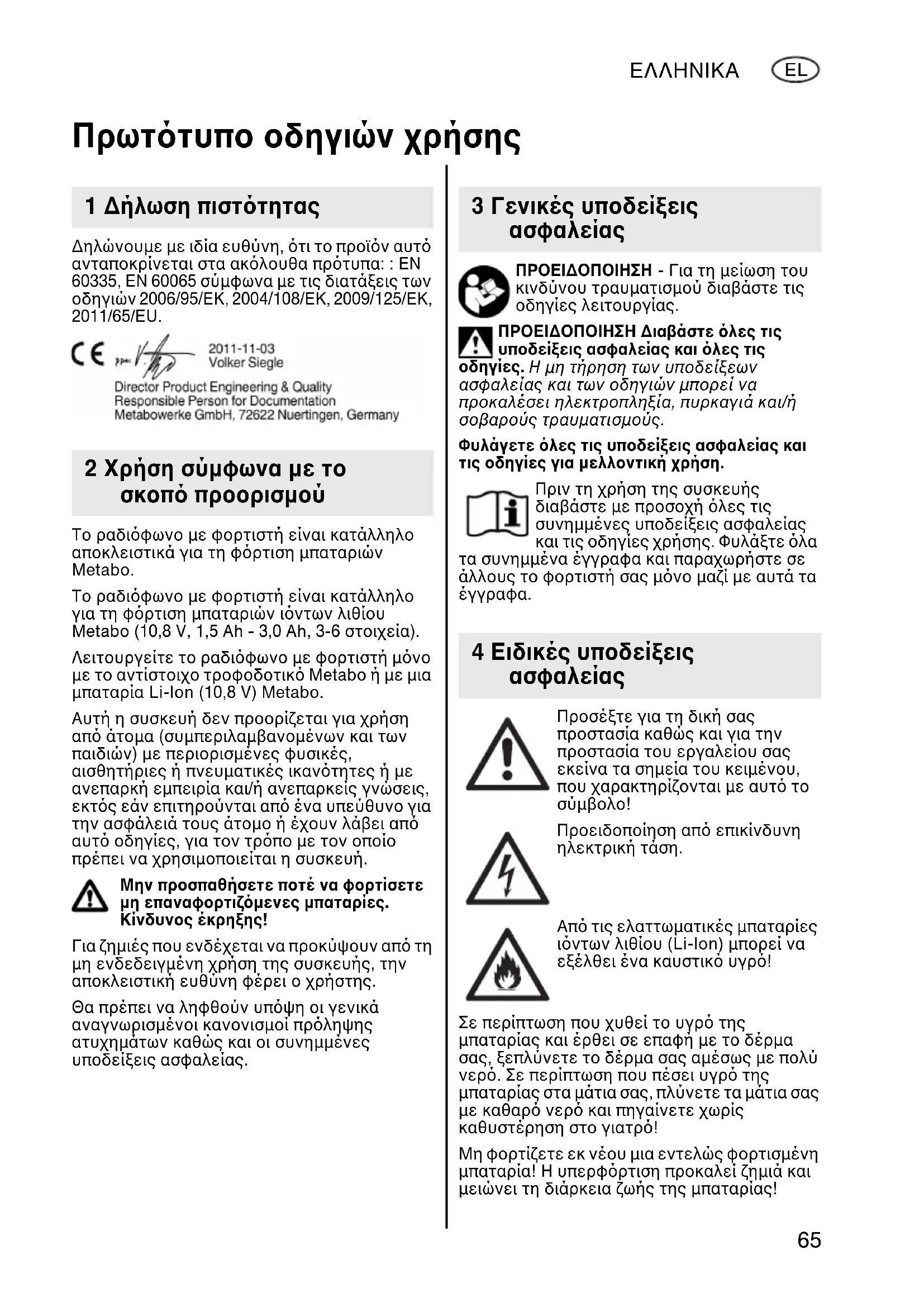 Δηλώνουμε με ιδία ευθύνη, τι το προϊν αυτ ανταποκρίνεται στα ακλουθα πρτυπα: : EN 60335, EN 60065 σύμφωνα με τις διατάξεις των οδηγιών 2006/95/ΕΚ, 2004/108/ΕΚ, 2009/125/ΕΚ, 2011/65/EU. Το ραδιφωνο με φορτιστή είναι κατάλληλο αποκλειστικά για τη φρτιση μπαταριών Metabo. Το ραδιφωνο με φορτιστή είναι κατάλληλο για τη φρτιση μπαταριών ιντων λιθίου Metabo (10,8 V, 1,5 Ah - 3,0 Ah, 3-6 στοιχεία). Λειτουργείτε το ραδιφωνο με φορτιστή μνο με το αντίστοιχο τροφοδοτικ Metabo ή με μια μπαταρία Li-Ion (10,8 V) Metabo. Αυτή η συσκευή δεν προορίζεται για χρήση απ άτομα (συμπεριλαμβανομένων και των παιδιών) με περιορισμένες φυσικές, αισθητήριες ή πνευματικές ικαντητες ή με ανεπαρκή εμπειρία και/ή ανεπαρκείς γνώσεις, εκτς εάν επιτηρούνται απ ένα υπεύθυνο για την ασφάλειά τους άτομο ή έχουν λάβει απ αυτ οδηγίες, για τον τρπο με τον οποίο πρέπει να χρησιμοποιείται η συσκευή. Μην προσπαθήσετε ποτέ να φορτίσετε μη επαναφορτιζμενες μπαταρίες. Κίνδυνος έκρηξης! Για ζημιές που ενδέχεται να προκύψουν απ τη μη ενδεδειγμένη χρήση της συσκευής, την αποκλειστική ευθύνη φέρει ο χρήστης. Θα πρέπει να ληφθούν υπψη οι γενικά αναγνωρισμένοι κανονισμοί πρληψης ατυχημάτων καθώς και οι συνημμένες υποδείξεις ασφαλείας. ΠΡΟΕΙΔΟΠΟΙΗΣΗ - Για τη μείωση του κινδύνου τραυματισμού διαβάστε τις οδηγίες λειτουργίας. ΠΡΟΕΙΔΟΠΟΙΗΣΗ Διαβάστε λες τις υποδείξεις ασφαλείας και λες τις