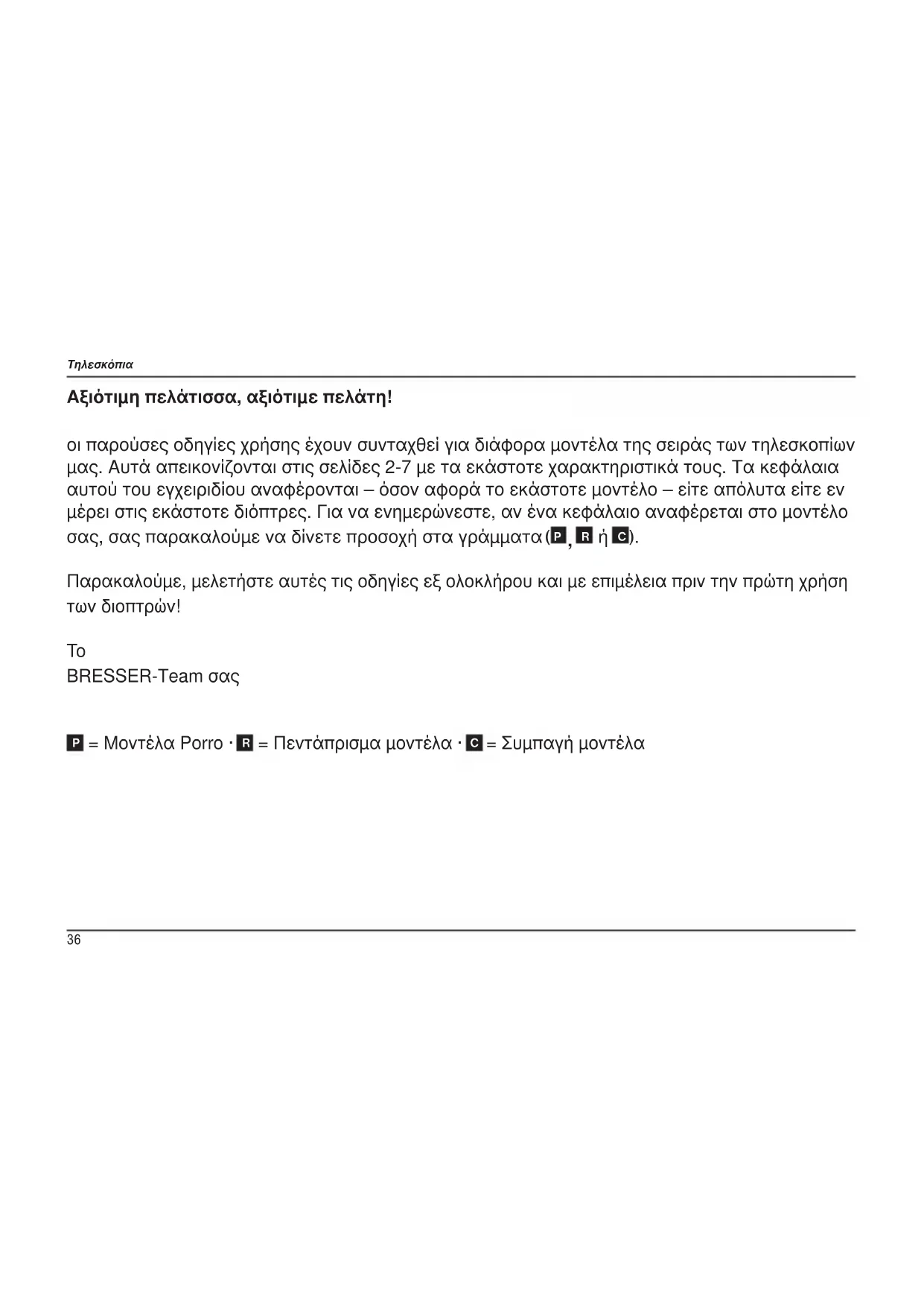 RU36 Αξιότιμη πελάτισσα, αξιότιμε πελάτη! οι παρούσες οδηγίες χρήσης έχουν συνταχθεί για διάφορα μοντέλα της σειράς των τηλεσκοπίων μας. Αυτά απεικονίζονται στις σελίδες 2-7 με τα εκάστοτε χαρακτηριστικά τους. Τα κεφάλαια αυτού του εγχειριδίου αναφέρονται – όσον αφορά το εκάστοτε μοντέλο – είτε απόλυτα είτε εν μέρει στις εκάστοτε διόπτρες. Για να ενημερώνεστε, αν ένα κεφάλαιο αναφέρεται στο μοντέλο σας, σας παρακαλούμε να δίνετε προσοχή στα γράμματα