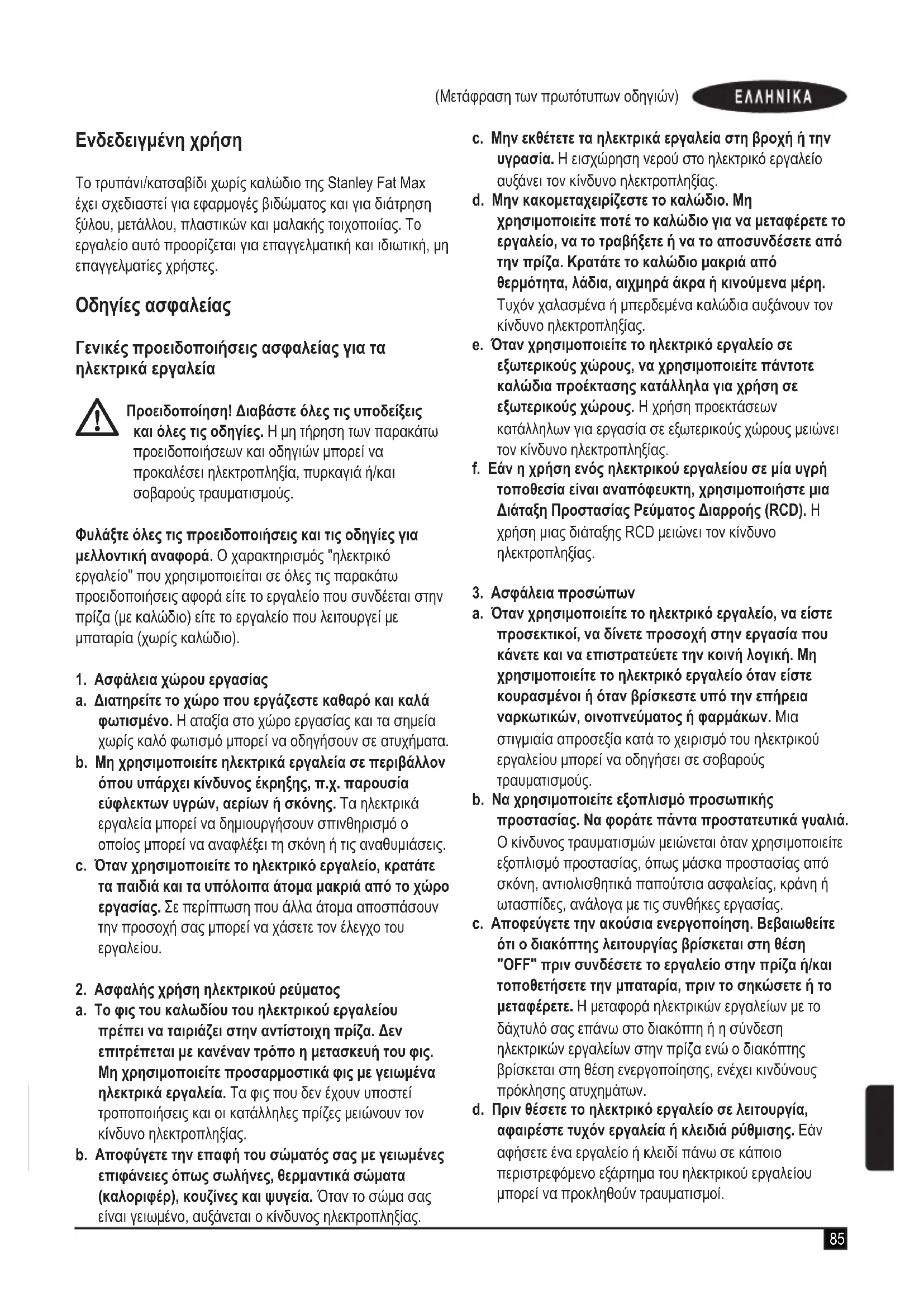 u Ο φορτιστής Stanley Fat Max πρέπει να χρησιμοποιείται αποκλειστικά και μόνο για τη φόρτιση της μπαταρίας του εργαλείου το οποίο συνοδεύει. Άλλες μπαταρίες μπορεί να εκραγούν, προκαλώντας τραυματισμό και ζημιές. u Μην επιχειρείτε ποτέ να φορτίσετε μη επαναφορτιζόμενες