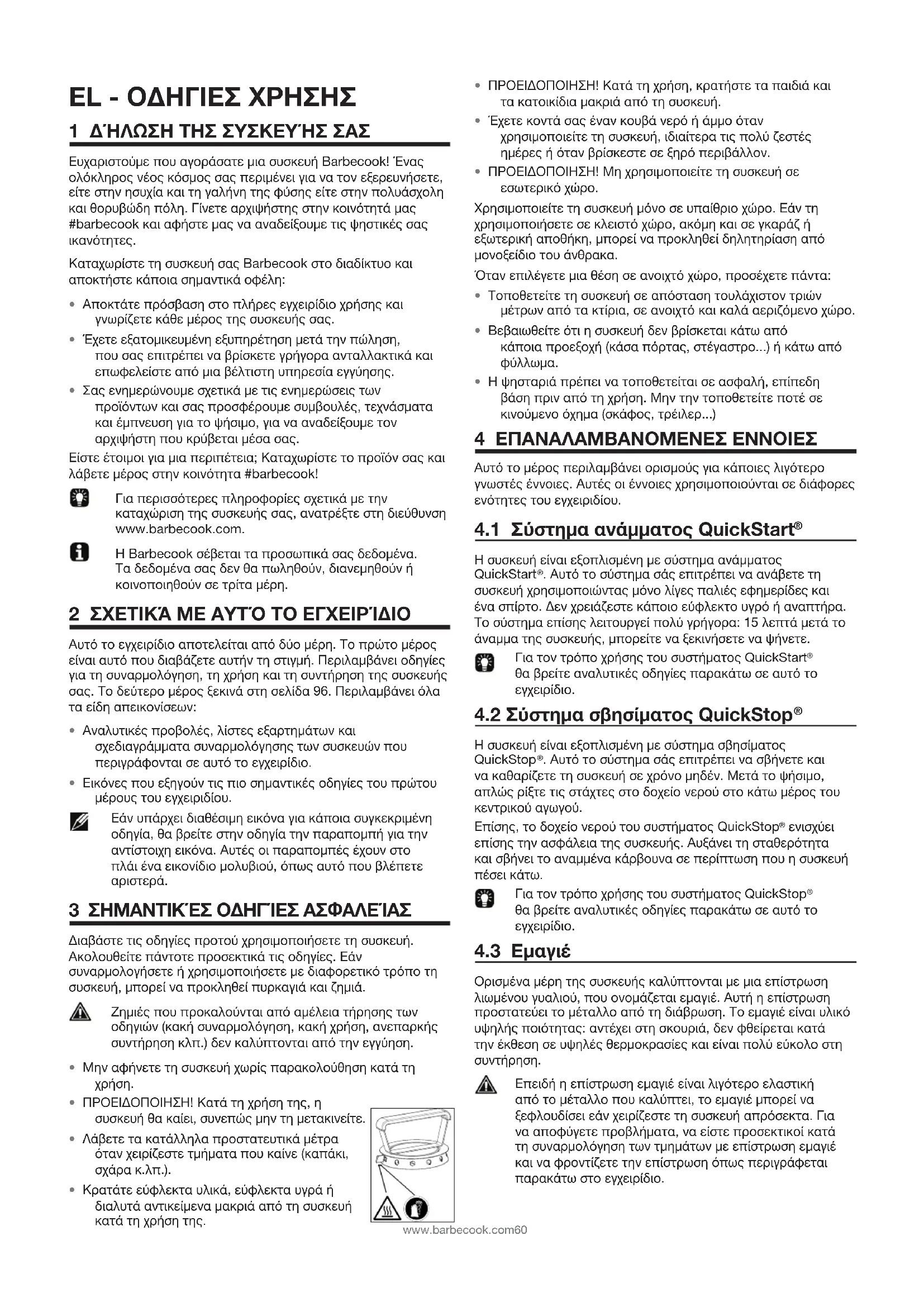 [GR] Μην χρησιμοποιείτε το μπάρμπεκιου σε περιορισμένο ή/και κατοικήσιμο χώρο, π.χ. σπίτια, σκηνές, τροχόσπιτα, σκάφη. Υπάρχει θανάσιμος κίνδυνος δηλητηρίασης από μονοξείδιο του άνθρακα.