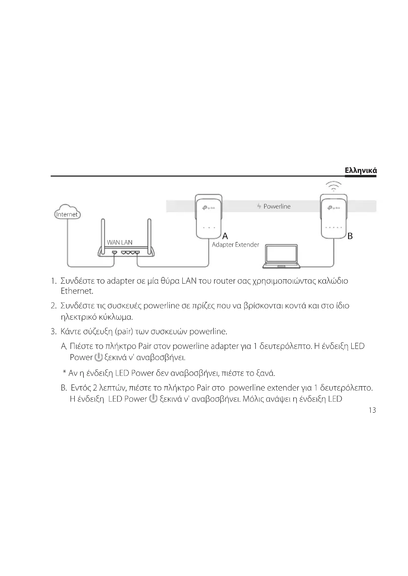 - Αν η ένδειξη LED Power δεν αναβοσβήνει, πιέστε το ξανά. B. Εντός 2 λεπτών, πιέστε το πλήκτρο Pair στο powerline extender για 1 δευτερόλεπτο. Η ένδειξη LED Power ξεκινά ν' αναβοσβήνει. Μόλις ανάψει η ένδειξη LED Internet WAN LAN Adapter Extender PowerlineΕλληνικά