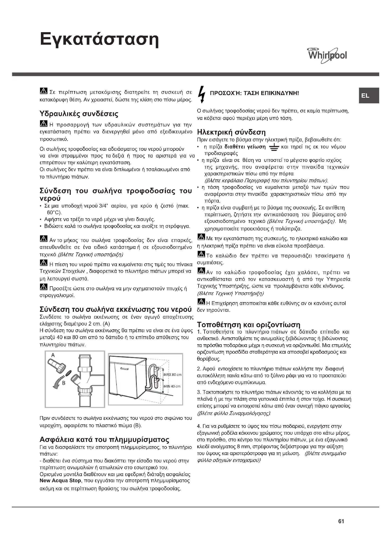 Η πίεση του νερού πρέπει να κυμαίνεται στις τιμές του πίνακα Τεχνικών Στοιχείων , διαφορετικά το πλυντήριο πιάτων μπορεί να μη λειτουργεί σωστά.Προσέξτε ώστε στο σωλήνα να μην σχηματιστούν πτυχές ή στραγγαλισμοί. Σύνδεση του σωλήνα εκκένωσης του νερού Συνδέστε το σωλήνα εκκένωσης σε έναν αγωγό αποχέτευσης ελάχιστης διαμέτρου 2 cm. (A)Η σύνδεση του σωλήνα εκκένωσης θα πρέπει να είναι σε ένα ύψος μεταξύ 40 και 80 cm από το δάπεδο ή το επίπεδο απόθεσης του πλυντηρίου πιάτων.Πριν συνδέσετε το σωλήνα εκκένωσης του νερού στο σιφώνιο του νεροχύτη, αφαιρέστε το πλαστικό πώμα (B). Ασφάλεια κατά του πλημμυρίσματος Για να διασφαλίσετε την αποτροπή πλημμυρίσματος, το πλυντήριο πιάτων:- διαθέτει ένα σύστημα που διακόπτει την είσοδο του νερού στην περίπτωση ανωμαλιών ή απωλειών στο εσωτερικό του.Ορισμένα μοντέλα διαθέτουν και μια εφεδρική διάταξη ασφαλείας New Acqua Stop, που εγγυάται την αποτροπή πλημμυρίσματος ακόμη και σε περίπτωση θραύσης του σωλήνα τροφοδοσίας. ΠΡΟΣΟΧΉ: ΤΆΣΗ ΕΠΙΚΙΝΔΥΝΗ! Ο σωλήνας τροφοδοσίας νερού δεν πρέπει, σε καμία περίπτωση, να κόβεται αφού περιέχει μέρη υπό τάση. Ηλεκτρική σύνδεση Πριν εισάγετε το βύσμα στην ηλεκτρική πρίζα, βεβαιωθείτε ότι: