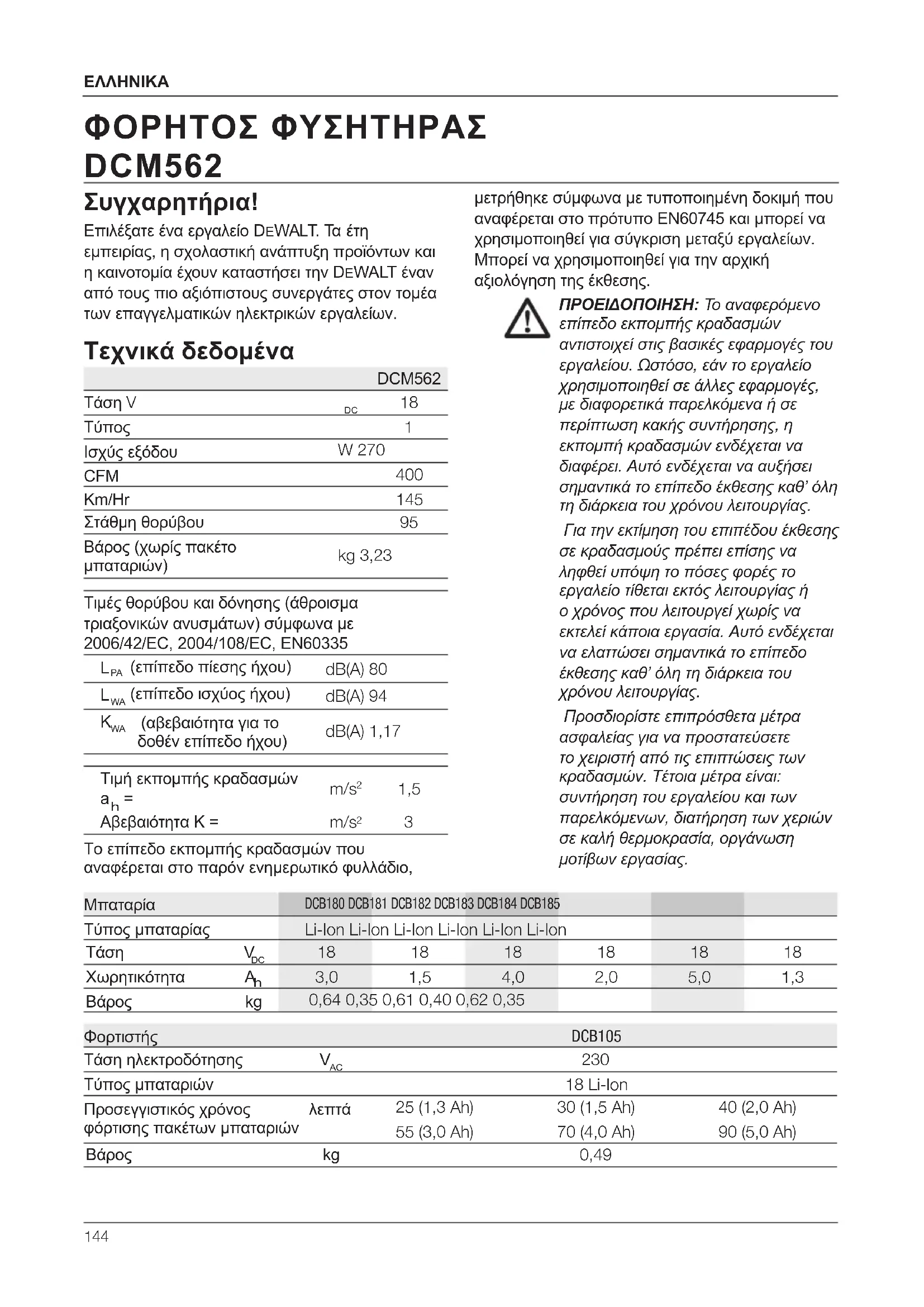 Η φόρτιση να γίνεται μόνο σε θερμοκρασία από 4 °C έως 40 °C. Μόνο για χρήση σε εσωτερικό χώρο. Απορρίψτε την μπαταρία με φιλικό προς το περιβάλλον τρόπο. Φορτίζετε τα πακέτα μπαταριών DeWALT μόνο με τους προβλεπόμενους φορτιστές DeWALT. Η φόρτιση πακέτων μπαταριών άλλων από τις προβλεπόμενες μπαταρίες DeWALT με χρήση φορτιστή DeWALT μπορεί να προκαλέσει έκρηξή τους ή άλλες επικίνδυνες καταστάσεις.154