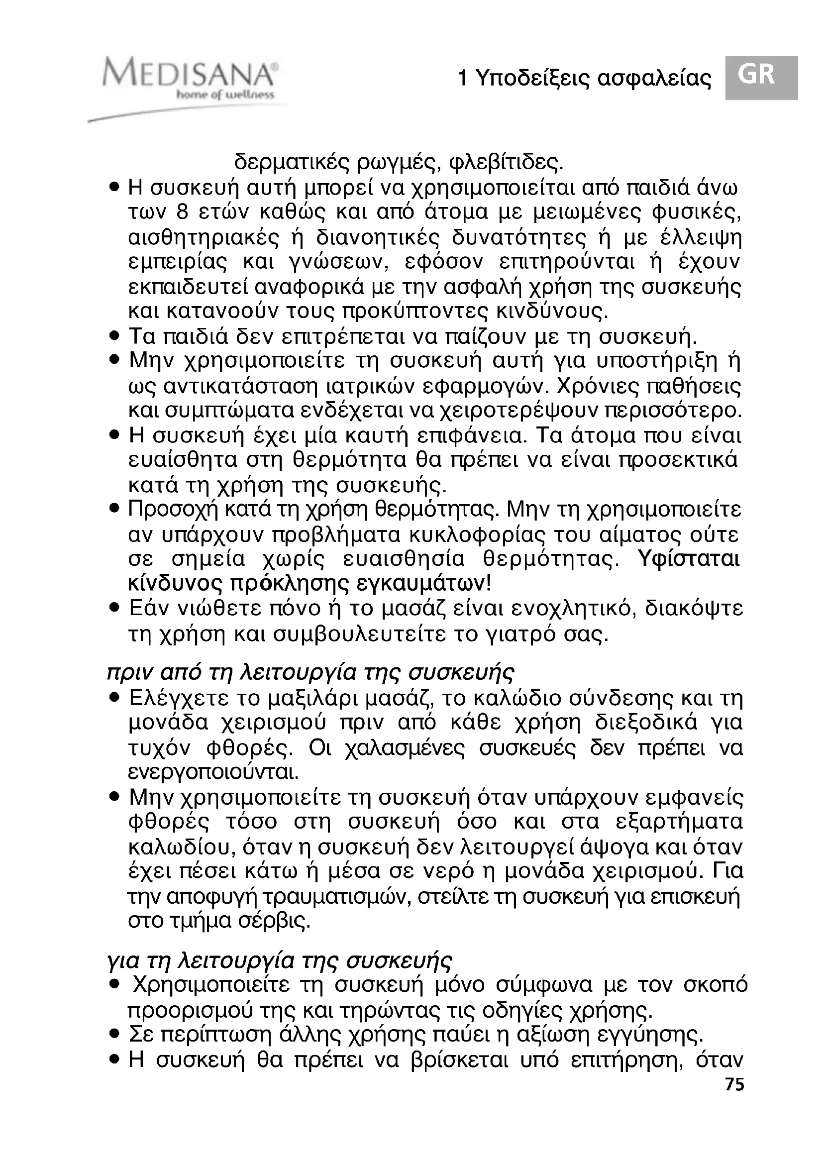 - Αν το καλώδιο ρεύματος είναι χαλασμένο, επιτρέπεται να αντικατασταθεί από την MEDISANA, από ένα ειδικό κατάστημα ή από ένα κατάλληλα εξειδικευμένο άτομο, για να αποφύγετε οποιουσδήποτε κινδύνους.