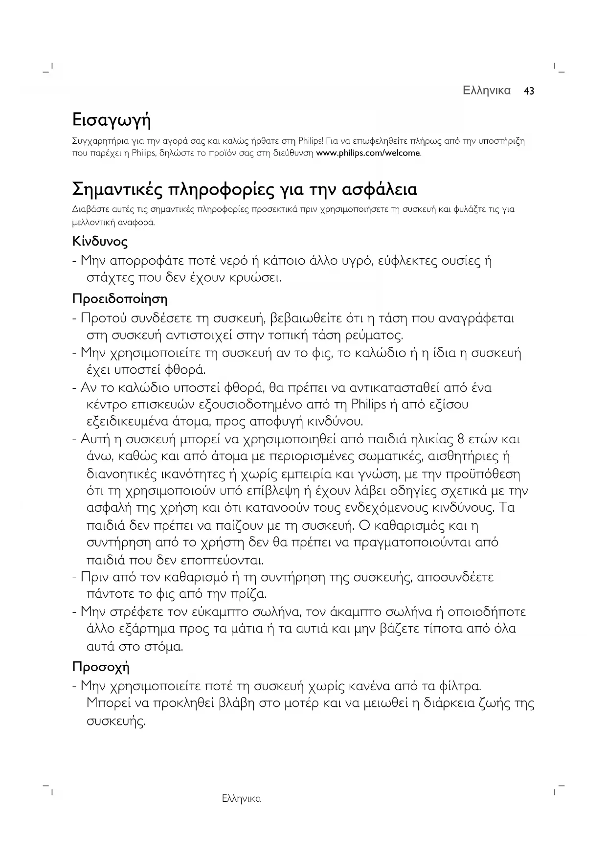 Συγχαρητήρια για την αγορά σας και καλώς ήρθατε στη Philips! Για να επωφεληθείτε πλήρως από την υποστήριξη που παρέχει η Philips, δηλώστε το προϊόν σας στη διεύθυνση www.philips.com/welcome. Σημαντικές πληροφορίες για την ασφάλεια Διαβάστε αυτές τις σημαντικές πληροφορίες προσεκτικά πριν χρησιμοποιήσετε τη συσκευή και φυλάξτε τις για μελλοντική αναφορά.