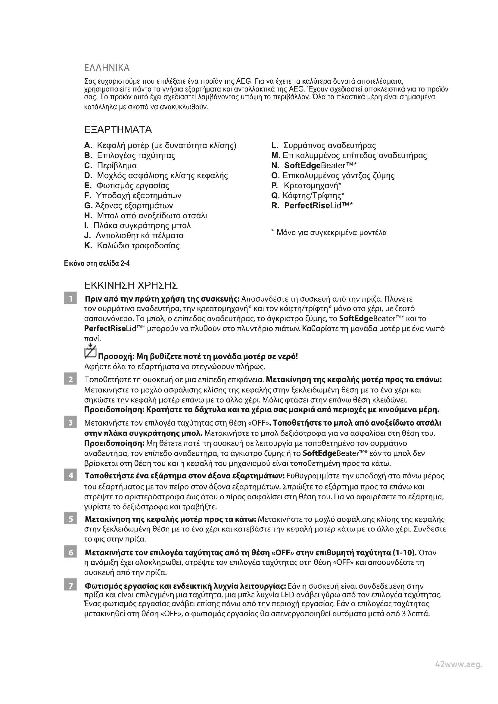 Προσοχή: Μη βυθίζετε ποτέ τη μονάδα μοτέρ σε νερό! Άφήστε όλα τα εξαρτήματα να στεγνώσουν πλήρως. 2 Τοποθετήστε τη συσκευή σε μια επίπεδη επιφάνεια. Μετακίνηση της κεφαλής μοτέρ προς τα επάνω: Μετακινήστε το μοχλό ασφάλισης κλίσης της κεφαλής στην ξεκλειδωμένη θέση με το ένα χέρι και σηκώστε την κεφαλή μοτέρ επάνω με το άλλο χέρι. Μόλις φτάσει στην επάνω θέση κλειδώνει. Προειδοποίηση: Κρατήστε τα δάχτυλα και τα χέρια σας μακριά από περιοχές με κινούμενα μέρη. 3 Μετακινήστε τον επιλογέα ταχύτητας στη θέση «OFF». Τοποθετήστε το μπολ από ανοξείδωτο ατσάλι στην πλάκα συγκράτησης μπολ. Μετακινήστε το μπολ δεξιόστροφα για να ασφαλίσει στη θέση του. Προειδοποίηση: Μη θέτετε ποτέ τη συσκευή σε λειτουργία με τοποθετημένο τον συρμάτινο αναδευτήρα, τον επίπεδο αναδευτήρα, το άγκιστρο ζύμης ή το SoftEdgeBeater™* εάν το μπολ δεν βρίσκεται στη θέση του και η κεφαλή του μηχανισμού είναι τοποθετημένη προς τα κάτω. 4 Τοποθετήστε ένα εξάρτημα στον άξονα εξαρτημάτων: Ευθυγραμμίστε την υποδοχή στο πάνω μέρος του εξαρτήματος με τον πείρο στον άξονα εξαρτημάτων. Σπρώξτε το εξάρτημα προς τα επάνω και στρέψτε το αριστερόστροφα έως ότου ο πίρος ασφαλίσει στη θέση του. Για να αφαιρέσετε το εξάρτημα, γυρίστε το δεξιόστροφα και τραβήξτε. 5 Μετακίνηση της κεφαλής μοτέρ προς τα κάτω: Μετακινήστε το μοχλό ασφάλισης κλίσης της κεφαλής στην ξεκλειδωμένη θέση με το ένα χέρι και κατεβάστε την κεφαλή μοτέρ κάτω με το άλλο χέρι. Συνδέστε το φις στην πρίζα. 6 Μετακινήστε τον επιλογέα ταχύτητας από τη θέση «OFF» στην επιθυμητή ταχύτητα (1-10). Όταν η ανάμιξη έχει ολοκληρωθεί, στρέψτε τον επιλογέα ταχύτητας στη θέση «OFF» και αποσυνδέστε τη συσκευή από την πρίζα. 7 Φωτισμός εργασίας και ενδεικτική λυχνία λειτουργίας: Εάν η συσκευή είναι συνδεδεμένη στην πρίζα και είναι επιλεγμένη μια ταχύτητα, μια μπλε λυχνία LED ανάβει γύρω από τον επιλογέα ταχύτητας. Ένας φωτισμός εργασίας ανάβει επίσης πάνω από την περιοχή εργασίας. Εάν ο επιλογέας ταχύτητας μετακινηθεί στη θέση «OFF», ο φωτισμός εργασίας θα απενεργοποιηθεί αυτόματα μετά από 3 λεπτά.43www.aeg.com