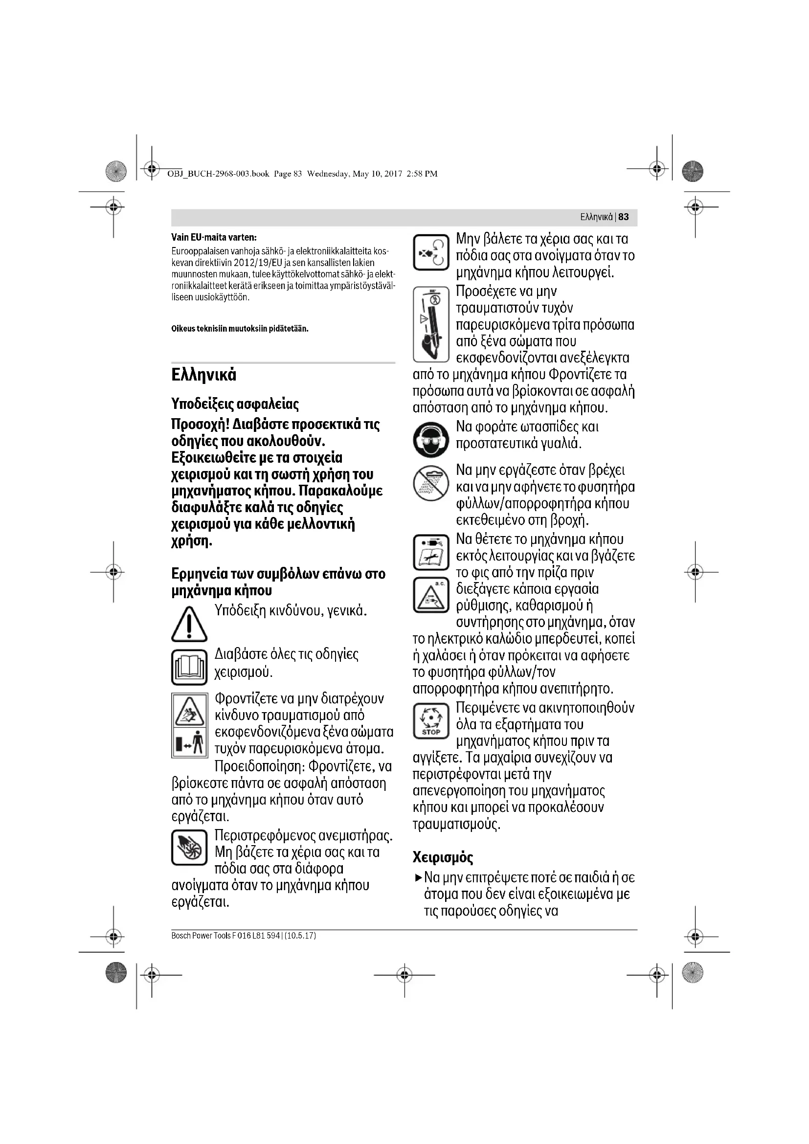 Να μην επιτρέψετε ποτέ σε παιδιά ή σε άτομα που δεν είναι εξοικειωμένα με τις παρούσες οδηγίες να OBJ_BUCH-2968-003.book Page 83 Wednesday, May 10, 2017 2:58 PM84 | Ελληνικά F 016 L81 594 | (10.5.17) Bosch Power Tools χρησιμοποιήσουν το μηχάνημα κήπου. Εθνικές διατάξεις μπορεί να περιορίζουν ενδεχομένως την ηλικία του χειριστή. Να διαφυλάγετε/ αποθηκεύετε το μηχάνημα κήπου απρόσιτο στα παιδιά όταν δεν το χρησιμοποιείτε. Αυτό το μηχάνημα κήπου δεν προορίζεται για χρήση από πρόσωπα (συμπεριλαμβανομένων και των παιδιών) με περιορισμένες φυσικές, αισθητήριες ή πνευματικές ικανότητες ή με ελλιπή εμπειρία ή/και ελλιπείς γνώσεις, εκτός αν εποπτεύονται από ένα αρμόδιο για την ασφάλειά τους πρόσωπο ή παίρνουν οδηγίες από το άτομο αυτό, πως πρέπει να χειρίζονται το μηχάνημα κήπου. Τα παιδιά θα πρέπει να επιτηρούνται για να εξασφαλιστεί ότι δεν θα παίξουν με το μηχάνημα κήπου. Να μην χρησιμοποιήσετε ποτέ το μηχάνημα κήπου όσο παρευρίσκονται άλλα άτομα, ιδιαίτερα παιδιά ή κατοικίδια ζώα, άμεσα κοντά σ’ αυτό. Ο χειριστής ή ο χρήστης ευθύνονται για τυχόν ατυχήματα ή ζημιές σε ανθρώπους ή την περιουσία τους. Όταν το μηχάνημα κήπου λειτουργεί δεν επιτρέπεται να παρευρίσκονται άλλα άτομα ή ζώα σε ακτίνα 3 μέτρων. Στην περιοχή εργασίας ο χειριστής φέρει την ευθύνη για τυχόν παρευρισκόμενα τρίτα άτομα. Να εργάζεστε με το μηχάνημα κήπου πάντοτε υπό το φως της ημέρας ή υπό καλό τεχνητό φως. Μην χρησιμοποιήσετε το μηχάνημα κήπου όταν είστε άρρωστος, κουρασμένος ή όταν βρίσκεστε υπό την επήρεια αλκοόλης, ναρκωτικών ουσιών ή φαρμάκων. Μην εργάζεστε με το μηχάνημα κήπου υπό δυσμενείς καιρικές συνθήκες, ιδιαίτερα όταν επίκειται καταιγίδα. Όταν χρησιμοποιείτε αυτό το μηχάνημα κήπου να φοράτε στο κορμό σας και τα μπράτσα σας πάντοτε ανθεκτικά ρούχα. Μην χρησιμοποιείτε το μηχάνημα κήπου όταν είστε ξυπόλητοι ή όταν φοράτε ανοιχτά σανδάλια. Να φοράτε πάντοτε στερεά παπούτσια και μακριά παντελόνια. Προσέχετε, να μην τραβηχτούν τυχόν φαρδιά ρούχα από τον εισερχόμενο στο φυσητήρα αέρα, επειδή αυτό μπορεί να οδηγήσει σε τραυματισμούς. Να χρησιμοποιείτε το μηχάνημα κήπου μόνο με τοποθετημένο το στόμιο ή, ανάλογα, με το σωλήνα αναρρόφησης. Προσέχετε, να μην τραβηχτούν τυχόν μακριά μαλλιά από τον εισερχόμενο στο φυσητήρα αέρα, επειδή αυτό μπορεί να οδηγήσει σε τραυματισμούς. Να επιθεωρείτε επιμελώς την υπό κατεργασία επιφάνεια και να απομακρύνετε απ’ αυτήν όλα τα σύρματα και όλα τα ξένα αντικείμενα. Πριν από κάθε χρήση να βεβαιώνεστε επίσης ότι το ηλεκτρικό καλώδιο/η μπαλαντέζα δεν έχουν υποστεί κάποια βλάβη και, ενδεχομένως, προβείτε στην αντικατάστασή τους. Να προστατεύετε το ηλεκτρικό καλώδιο/ την μπαλαντέζα από καύσωνα, λάδια και κοφτερές ακμές. OBJ_BUCH-2968-003.book Page 84 Wednesday, May 10, 2017 2:58 PMΕλληνικά | 85 Bosch Power Tools F 016 L81 594 | (10.5.17) Φροντίζετε όταν εργάζεστε, το ηλεκτρικό καλώδιο να βρίσκεται πάντοτε πίσω από το ηλεκτρικό