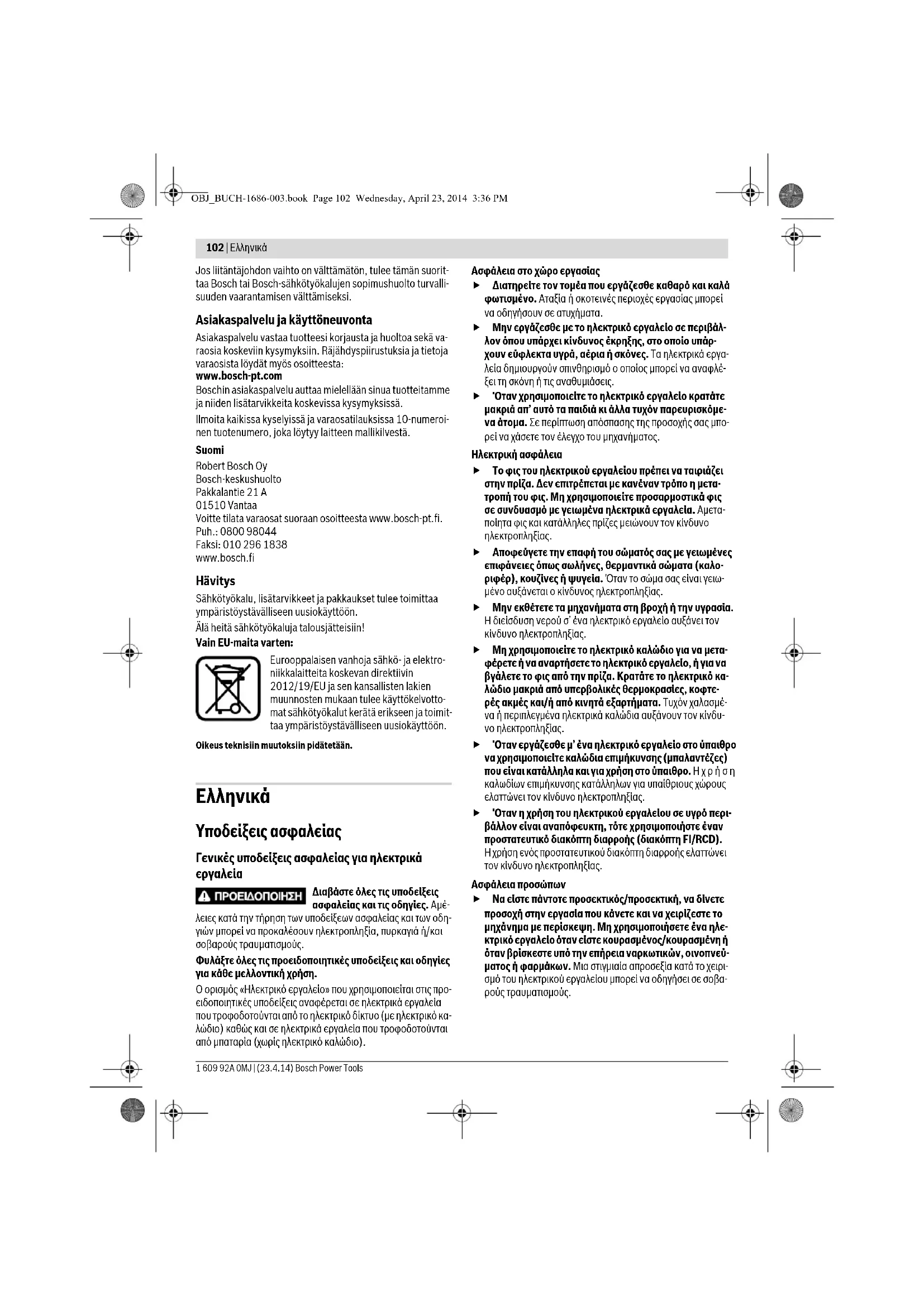 Διαβάστε όλες τις υποδείξεις ασφαλείας και τις οδηγίες. Αμέ- λειες κατά την τήρηση των υποδείξεων ασφαλείας και των οδη- γιών μπορεί να προκαλέσουν ηλεκτροπληξία, πυρκαγιά ή/και σοβαρούς τραυματισμούς. Φυλάξτε όλες τις προειδοποιητικές υποδείξεις και οδηγίες για κάθε μελλοντική χρήση. Ο ορισμός «Ηλεκτρικό εργαλείο» που χρησιμοποιείται στις προ- ειδοποιητικές υποδείξεις αναφέρεται σε ηλεκτρικά εργαλεία που τροφοδοτούνται από το ηλεκτρικό δίκτυο (με ηλεκτρικό κα- λώδιο) καθώς και σε ηλεκτρικά εργαλεία που τροφοδοτούνται από μπαταρία (χωρίς ηλεκτρικό καλώδιο). Ασφάλεια στο χώρο εργασίας Διατηρείτε τον τομέα που εργάζεσθε καθαρό και καλά φωτισμένο. Αταξία ή σκοτεινές περιοχές εργασίας μπορεί να οδηγήσουν σε ατυχήματα. Μην εργάζεσθε με το ηλεκτρικό εργαλείο σε περιβάλ- λον όπου υπάρχει κίνδυνος έκρηξης, στο οποίο υπάρ- χουν εύφλεκτα υγρά, αέρια ή σκόνες. Τα ηλεκτρικά εργα- λεία δημιουργούν σπινθηρισμό ο οποίος μπορεί να αναφλέ- ξει τη σκόνη ή τις αναθυμιάσεις. Όταν χρησιμοποιείτε το ηλεκτρικό εργαλείο κρατάτε μακριά απ’ αυτό τα παιδιά κι άλλα τυχόν παρευρισκόμε- να άτομα. Σε περίπτωση απόσπασης της προσοχής σας μπο- ρεί να χάσετε τον έλεγχο του μηχανήματος. Ηλεκτρική ασφάλεια Το φις του ηλεκτρικού εργαλείου πρέπει να ταιριάζει στην πρίζα. Δεν επιτρέπεται με κανέναν τρόπο η μετα- τροπή του φις. Μη χρησιμοποιείτε προσαρμοστικά φις σε συνδυασμό με γειωμένα ηλεκτρικά εργαλεία. Αμετα- ποίητα φις και κατάλληλες πρίζες μειώνουν τον κίνδυνο ηλεκτροπληξίας. Αποφεύγετε την επαφή του σώματός σας με γειωμένες επιφάνειες όπως σωλήνες, θερμαντικά σώματα (καλο- ριφέρ), κουζίνες ή ψυγεία. Όταν το σώμα σας είναι γειω- μένο αυξάνεται ο κίνδυνος ηλεκτροπληξίας. Μην εκθέτετε τα μηχανήματα στη βροχή ή την υγρασία. Η διείσδυση νερού σ’ ένα ηλεκτρικό εργαλείο αυξάνει τον κίνδυνο ηλεκτροπληξίας. Μη χρησιμοποιείτε το ηλεκτρικό καλώδιο για να μετα- φέρετε ή να αναρτήσετε το ηλεκτρικό εργαλείο, ή για να βγάλετε το φις από την πρίζα. Κρατάτε το ηλεκτρικό κα- λώδιο μακριά από υπερβολικές θερμοκρασίες, κοφτε- ρές ακμές και/ή από κινητά εξαρτήματα. Τυχόν χαλασμέ- να ή περιπλεγμένα ηλεκτρικά καλώδια αυξάνουν τον κίνδυ- νο ηλεκτροπληξίας. Όταν εργάζεσθε μ’ ένα ηλεκτρικό εργαλείο στο ύπαιθρο να χρησιμοποιείτε καλώδια επιμήκυνσης (μπαλαντέζες) που είναι κατάλληλα και για χρήση στο ύπαιθρο. Ηχρήση καλωδίων επιμήκυνσης κατάλληλων για υπαίθριους χώρους ελαττώνει τον κίνδυνο ηλεκτροπληξίας. Όταν η χρήση του ηλεκτρικού εργαλείου σε υγρό περι- βάλλον είναι αναπόφευκτη, τότε χρησιμοποιήστε έναν προστατευτικό διακόπτη διαρροής (διακόπτη FI/RCD). Η χρήση ενός προστατευτικού διακόπτη διαρροής ελαττώνει τον κίνδυνο ηλεκτροπληξίας. Ασφάλεια προσώπων Να είστε πάντοτε προσεκτικός/προσεκτική, να δίνετε προσοχή στην εργασία που κάνετε και να χειρίζεστε το μηχάνημα με περίσκεψη. Μη χρησιμοποιήσετε ένα ηλε- κτρικό εργαλείο όταν είστε κουρασμένος/κουρασμένη ή όταν βρίσκεστε υπό την επήρεια ναρκωτικών, οινοπνεύ- ματος ή φαρμάκων. Μια στιγμιαία απροσεξία κατά το χειρι- σμό του ηλεκτρικού εργαλείου μπορεί να οδηγήσει σε σοβα- ρούς τραυματισμούς. OBJ_BUCH-1686-003.book Page 102 Wednesday, April 23, 2014 3:36 PMΕλληνικά | 103 Bosch Power Tools 1 609 92A 0MJ | (23.4.14) Φοράτε έναν κατάλληλο για σας προστατευτικό εξοπλι- σμό και πάντοτε προστατευτικά γυαλιά. Όταν φοράτε έναν κατάλληλο προστατευτικό εξοπλισμό όπως μάσκα προ- στα