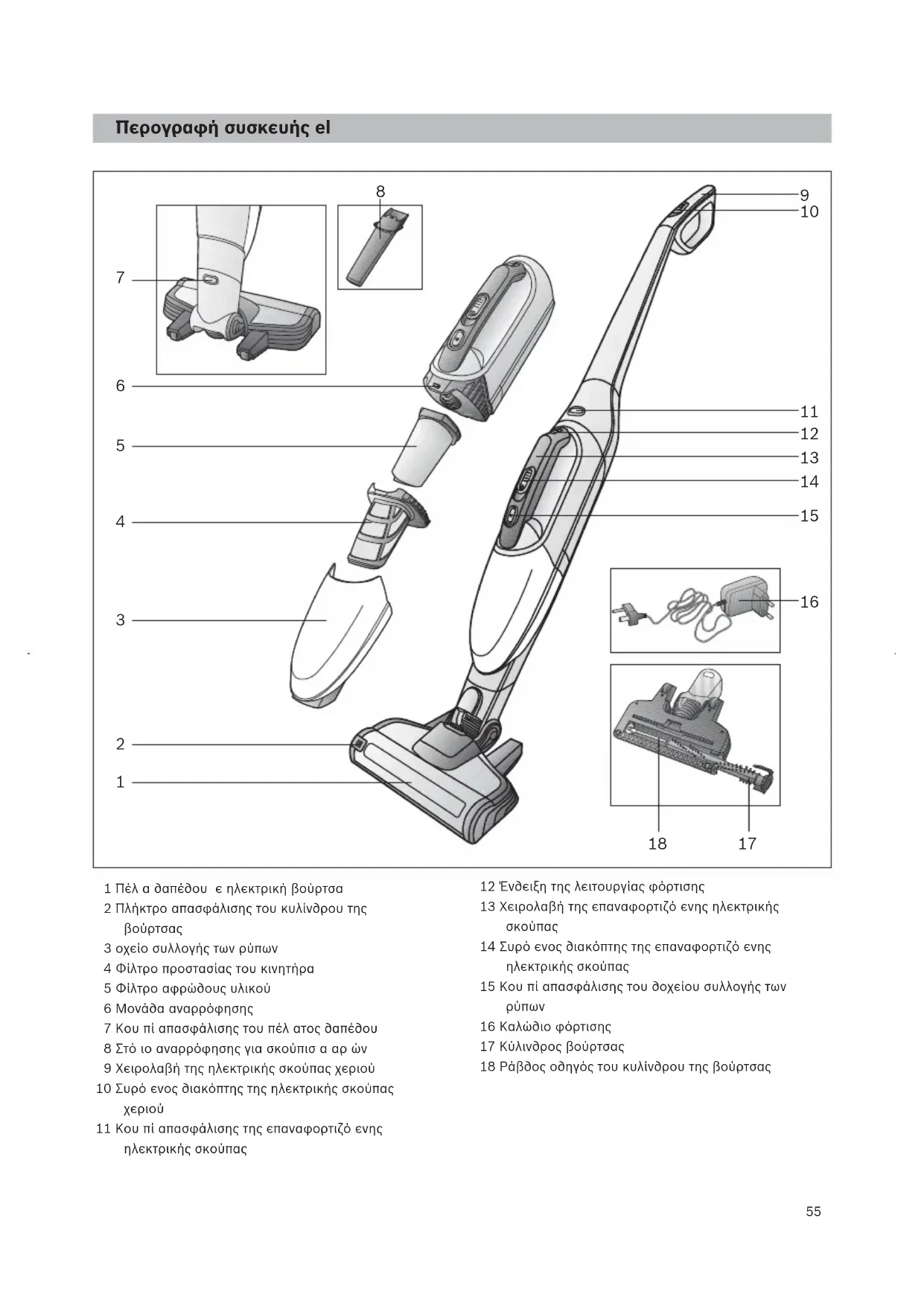 16 Καλώδιο φόρτισης 17 Κύλινδρος βούρτσας 18 Ράβδος οδηγός του κυλίνδρου της βούρτσας