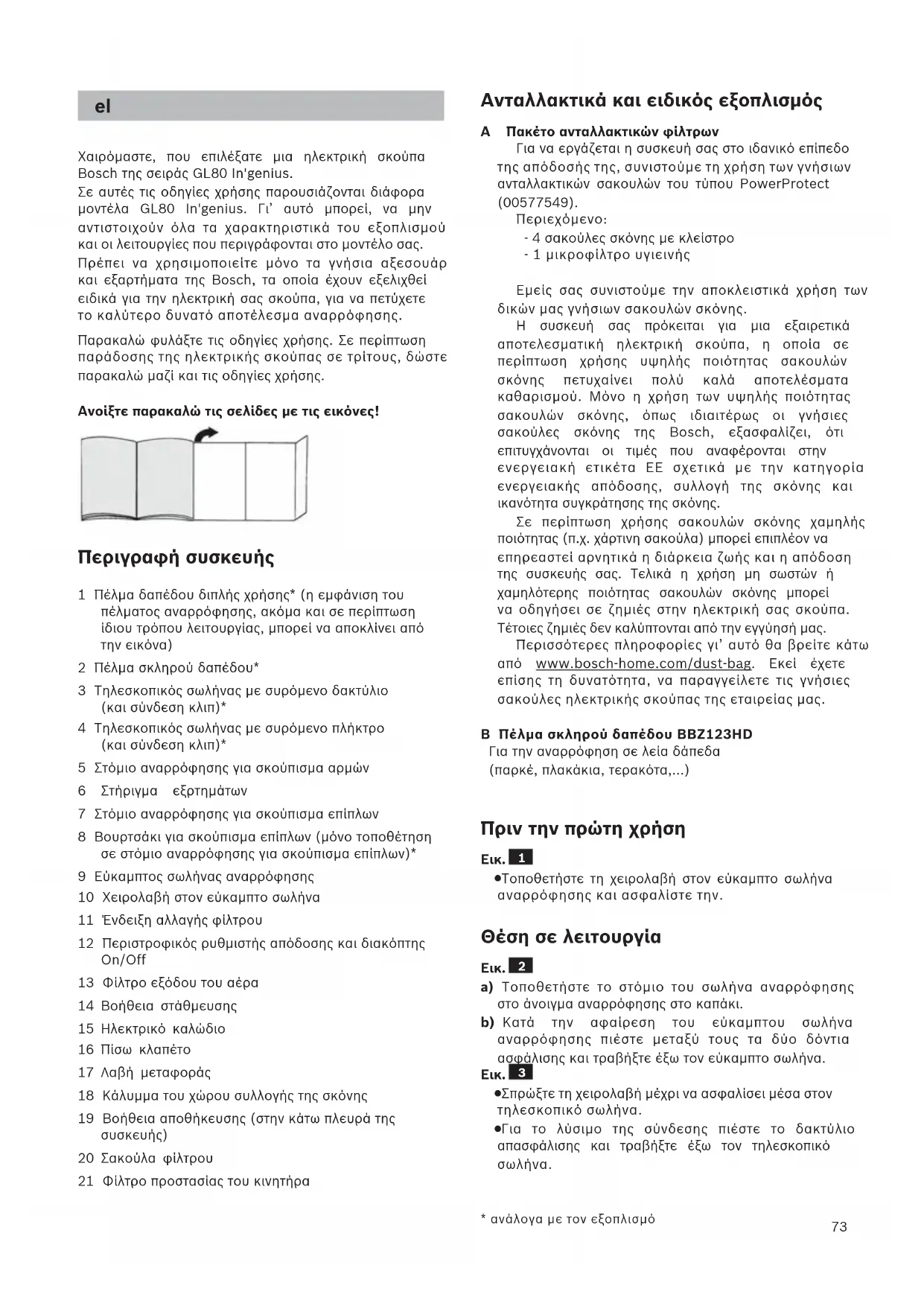 Χαιρόμαστε, που επιλέξατε μια ηλεκτρική σκούπα Bosch της σειράς GL80 In'genius. Σε αυτές τις οδηγίες χρήσης παρουσιάζονται διάφορα μοντέλα GL80 In'genius. Γι’ αυτό μπορεί, να μην αντιστοιχούν όλα τα χαρακτηριστικά του εξοπλισμού και οι λειτουργίες που περιγράφονται στο μοντέλο σας. Πρέπει να χρησιμοποιείτε μόνο τα γνήσια αξεσουάρ και εξαρτήματα της Bosch, τα οποία έχουν εξελιχθεί ειδικά για την ηλεκτρική σας σκούπα, για να πετύχετε το καλύτερο δυνατό αποτέλεσμα αναρρόφησης. Παρακαλώ φυλάξτε τις οδηγίες χρήσης. Σε περίπτωση παράδοσης της ηλεκτρικής σκούπας σε τρίτους, δώστε παρακαλώ μαζί και τις οδηγίες χρήσης. Ανοίξτε παρακαλώ τις σελίδες με τις εικόνες! Περιγραφή συσκευής 1 Πέλμα δαπέδου διπλής χρήσης* (η εμφάνιση του πέλματος αναρρόφησης, ακόμα και σε περίπτωση ίδιου τρόπου λειτουργίας, μπορεί να αποκλίνει από την εικόνα) 2 Πέλμα σκληρού δαπέδου* 3 Τηλεσκοπικός σωλήνας με συρόμενο δακτύλιο (και σύνδεση κλιπ)* 4 Τηλεσκοπικός σωλήνας με συρόμενο πλήκτρο (και σύνδεση κλιπ)* 5 Στόμιο αναρρόφησης για σκούπισμα αρμών 6 Στήριγμα εξρτημάτων 7 Στόμιο αναρρόφησης για σκούπισμα επίπλων 8 Βουρτσάκι για σκούπισμα επίπλων (μόνο τοποθέτηση σε στόμιο αναρρόφησης για σκούπισμα επίπλων)* 9 Εύκαμπτος σωλήνας αναρρόφησης 10 Χειρολαβή στον εύκαμπτο σωλήνα 11 Ένδειξη αλλαγής φίλτρου 12 Περιστροφικός ρυθμιστής απόδοσης και διακόπτης On/Off 13 Φίλτρο εξόδου του αέρα 14 Βοήθεια στάθμευσης 15 Ηλεκτρικό καλώδιο 16 Πίσω κλαπέτο 17 Λαβή μεταφοράς 18 Κάλυμμα του χώρου συλλογής της σκόνης 19 Βοήθεια αποθήκευσης (στην κάτω πλευρά της