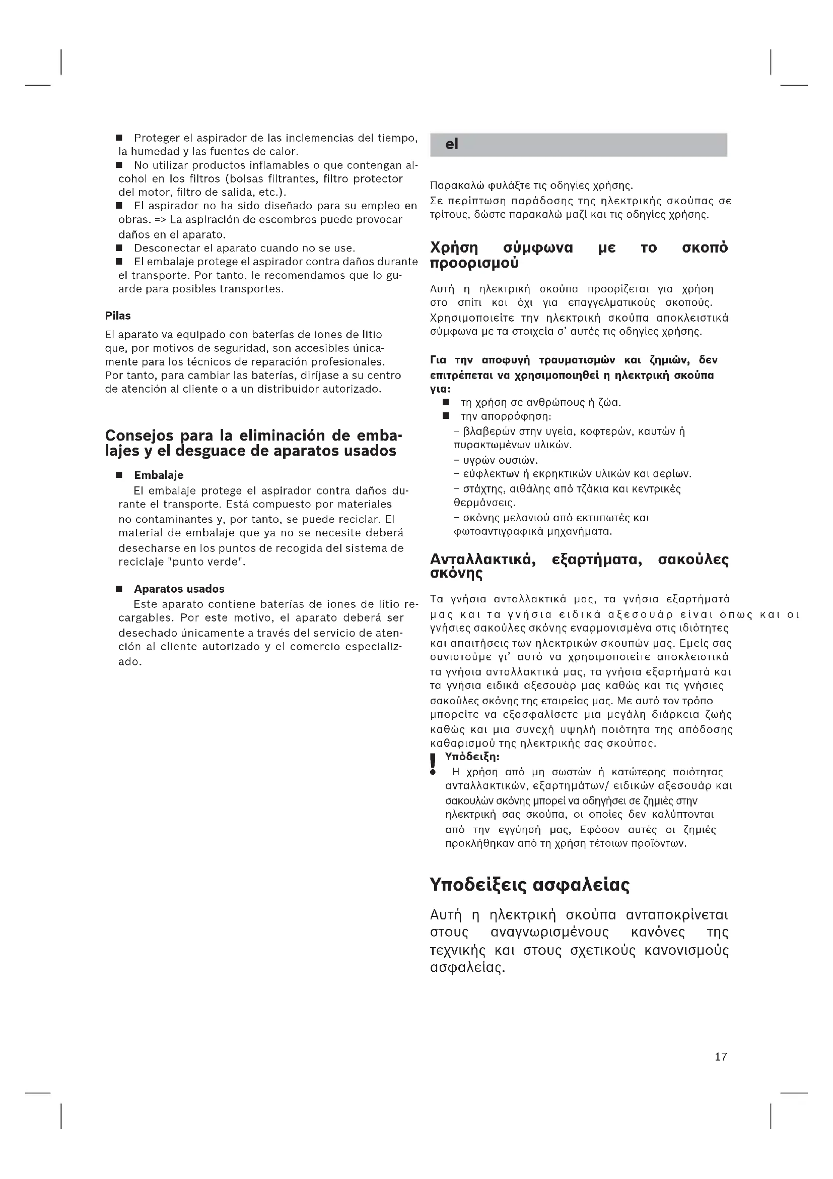 Η χρήση από μη σωστών ή κατώτερης ποιότητας ανταλλακτικών, εξαρτημάτων/ ειδικών αξεσουάρ και σακουλών σκόνης μπορεί να οδηγήσει σε ζημιές στην ηλεκτρική σας σκούπα, οι οποίες δεν καλύπτονται από την εγγύησή μας, Εφόσον αυτές οι ζημιές προκλήθηκαν από τη χρήση τέτοιων προϊόντων. Υποδείξεις ασφαλείας Αυτή η ηλεκτρική σκούπα ανταποκρίνεται στους αναγνωρισμένους κανόνες της τεχνικής και στους σχετικούς κανονισμούς